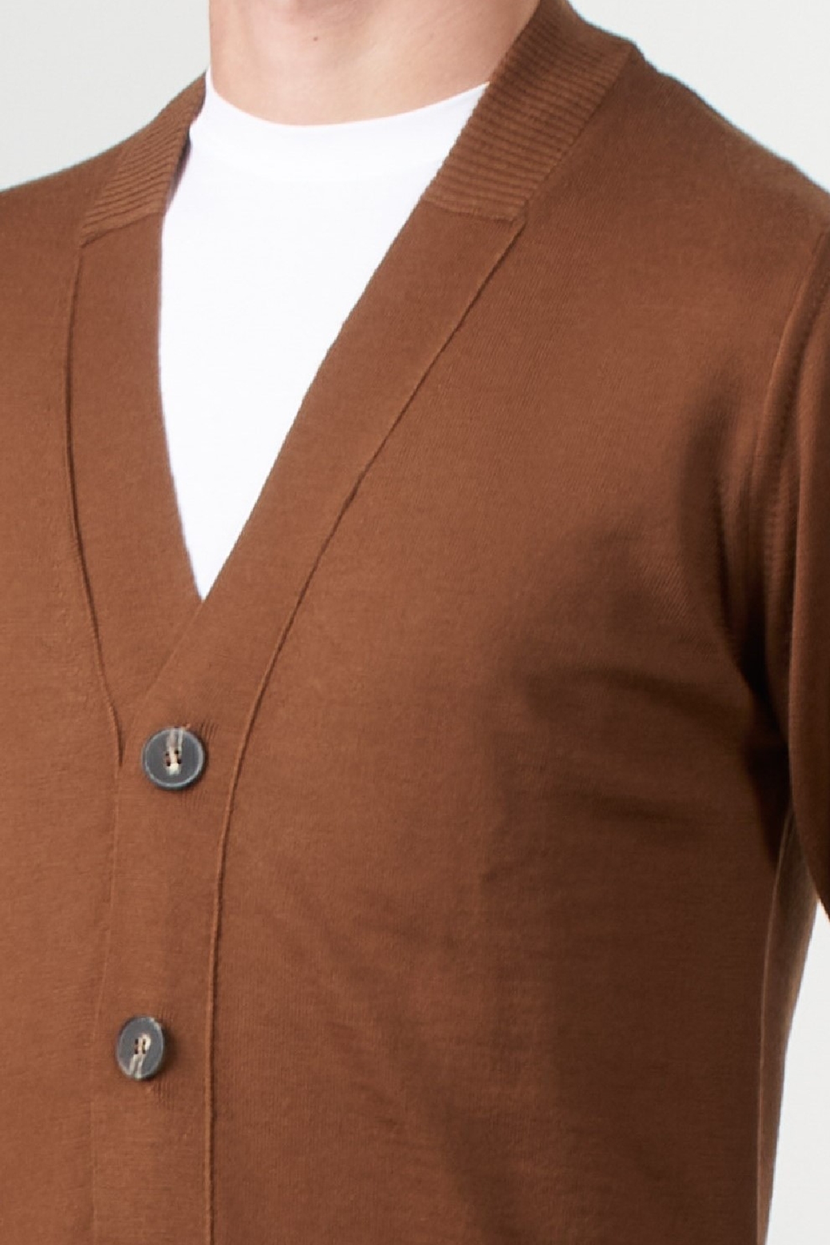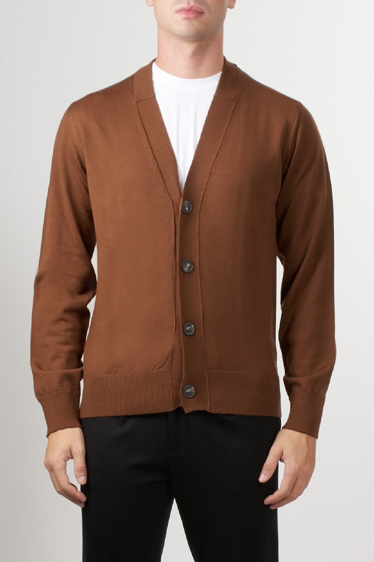 Alpha Studio cardigan made of 100% merino wool, featuring a front button closure, a V-neck, and ribbed trims at the hem and cuffs. A simple and refined design, this piece is ideal for completing casual or formal outfits with a touch of contemporary elegance.