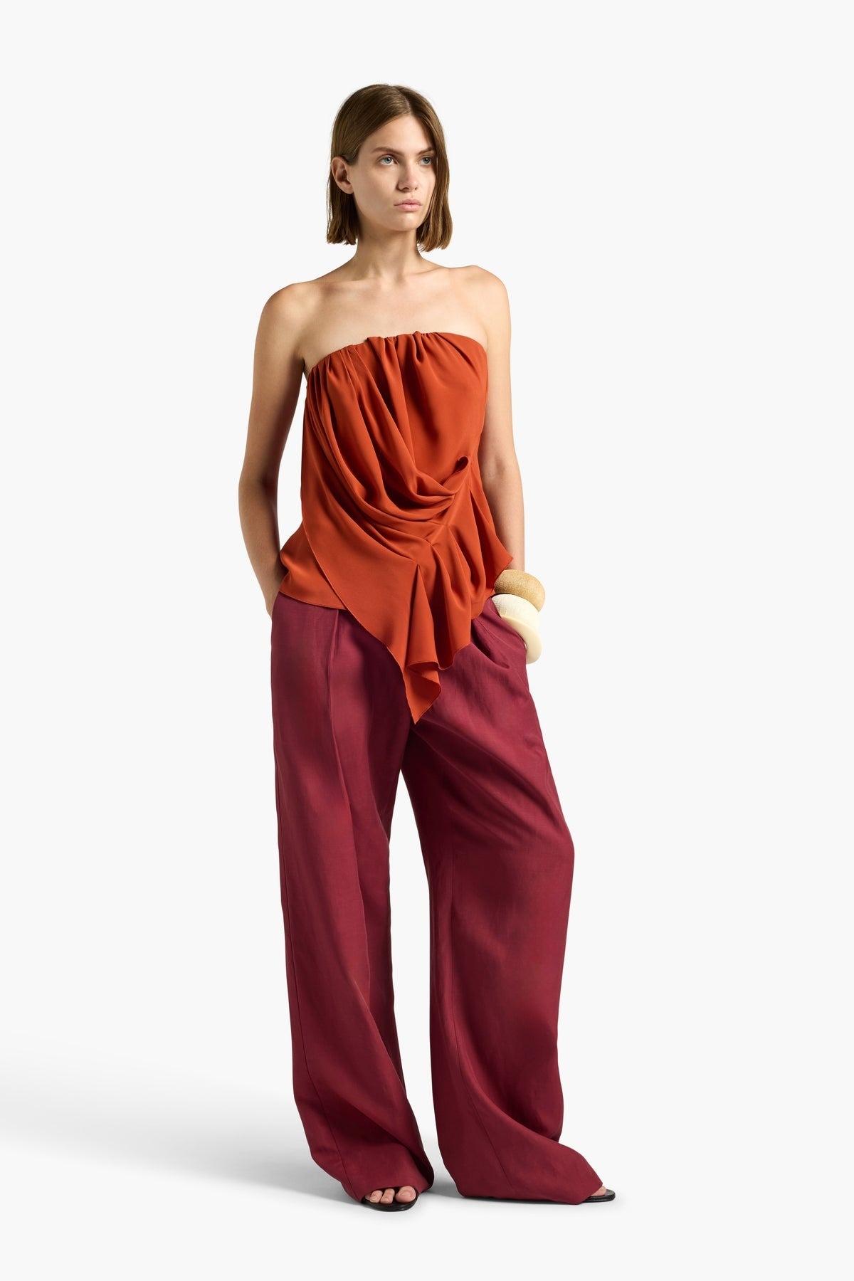 An elegant rust-colored silk blend bandeau top featuring a sophisticated asymmetrical drape. A sculptural piece with a lustrous finish, perfect for sophisticated and minimalist evening looks. Composition: 65% Acetate and 35% Silk
