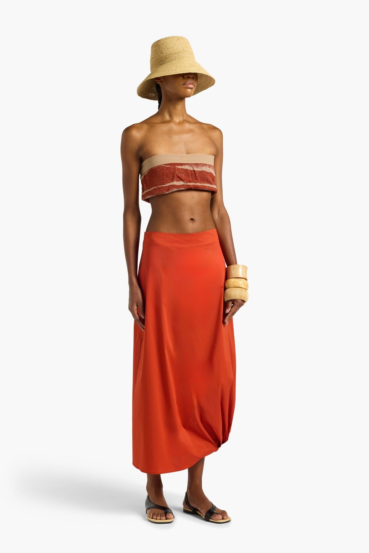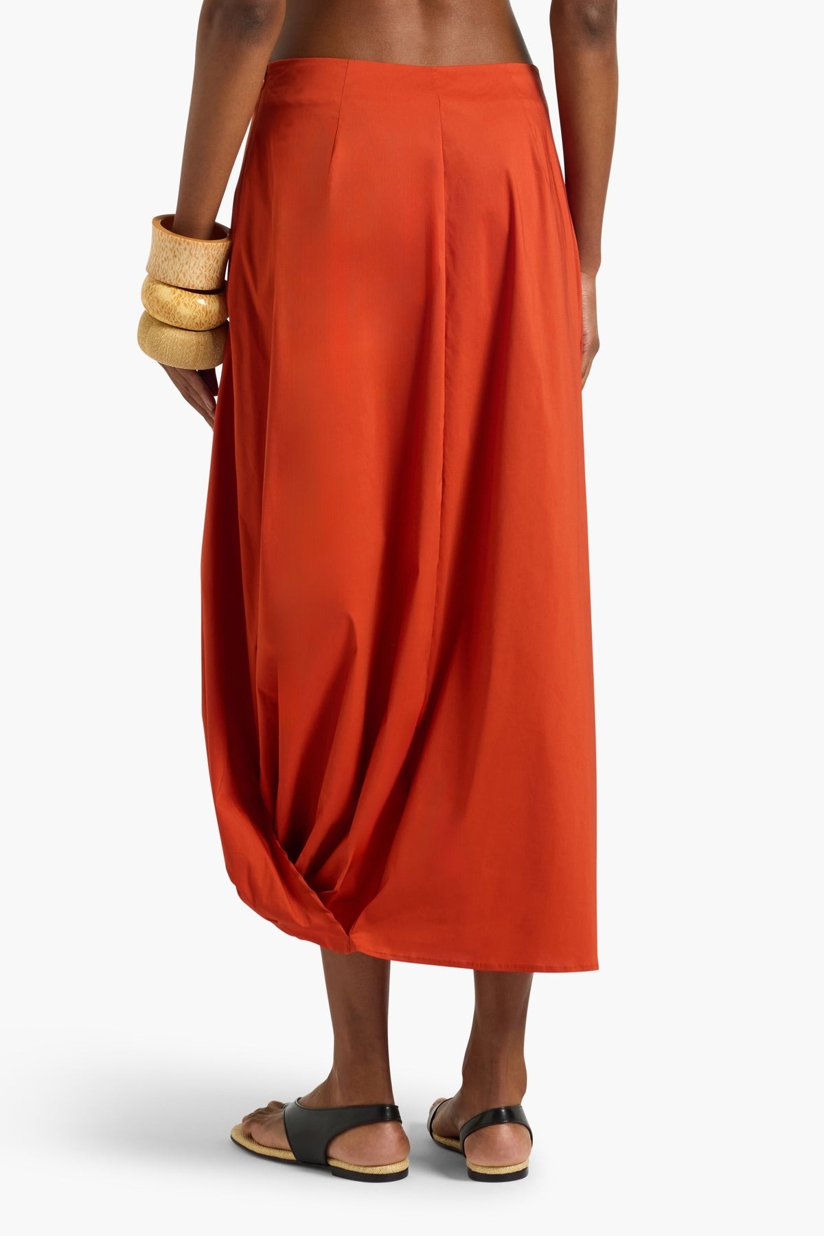 Burnt orange stretch cotton poplin midi skirt featuring a flowing silhouette and a distinctive asymmetrical hem with a side knot. A sculptural design that combines formal elegance with a holiday vibe. Composition: 68% cotton, 28% polyamide, 4% elastane