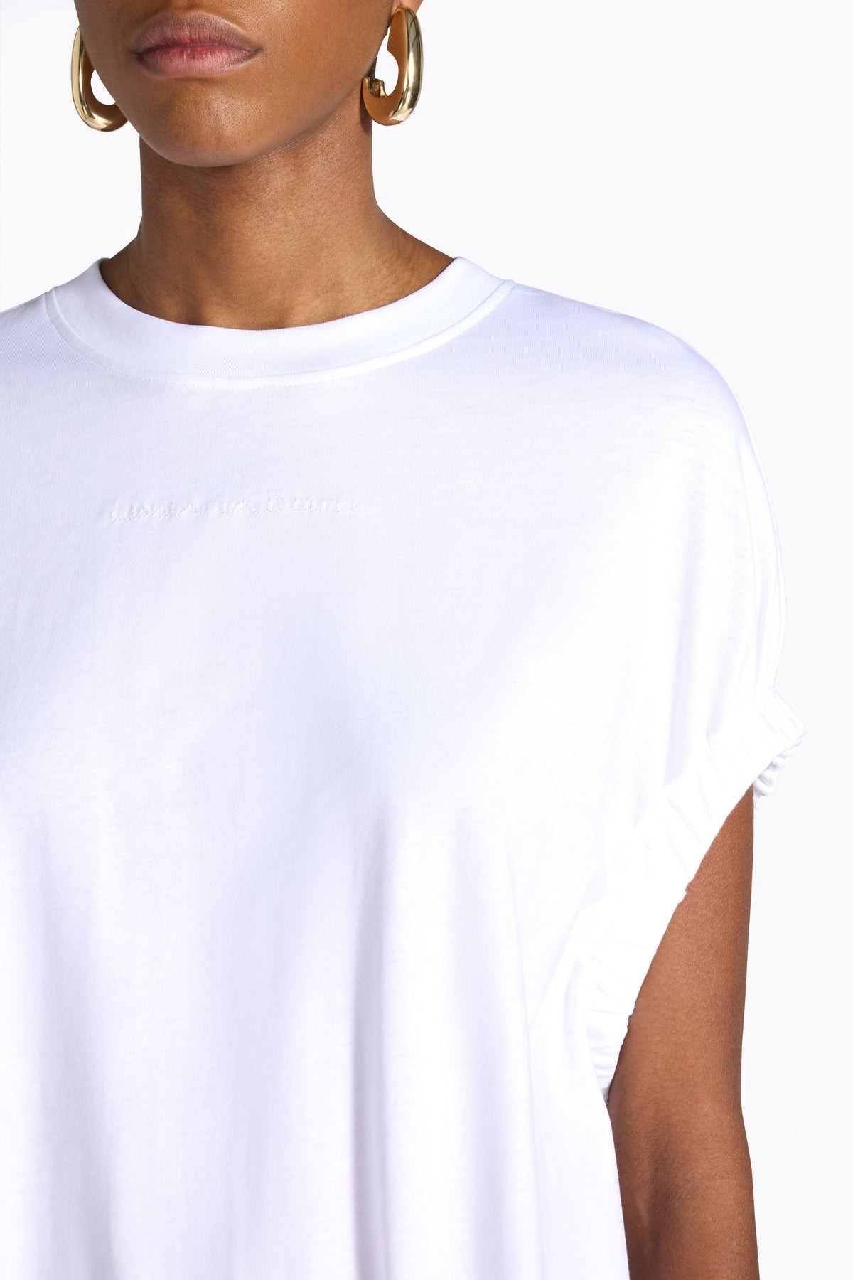 Cotton T-shirt with short sleeves and gathered hem. Round neckline and gathered hem. Shiny fabric patch on the back. Egg-shaped silhouette with slightly rounded hem. Composition: 100% cotton.