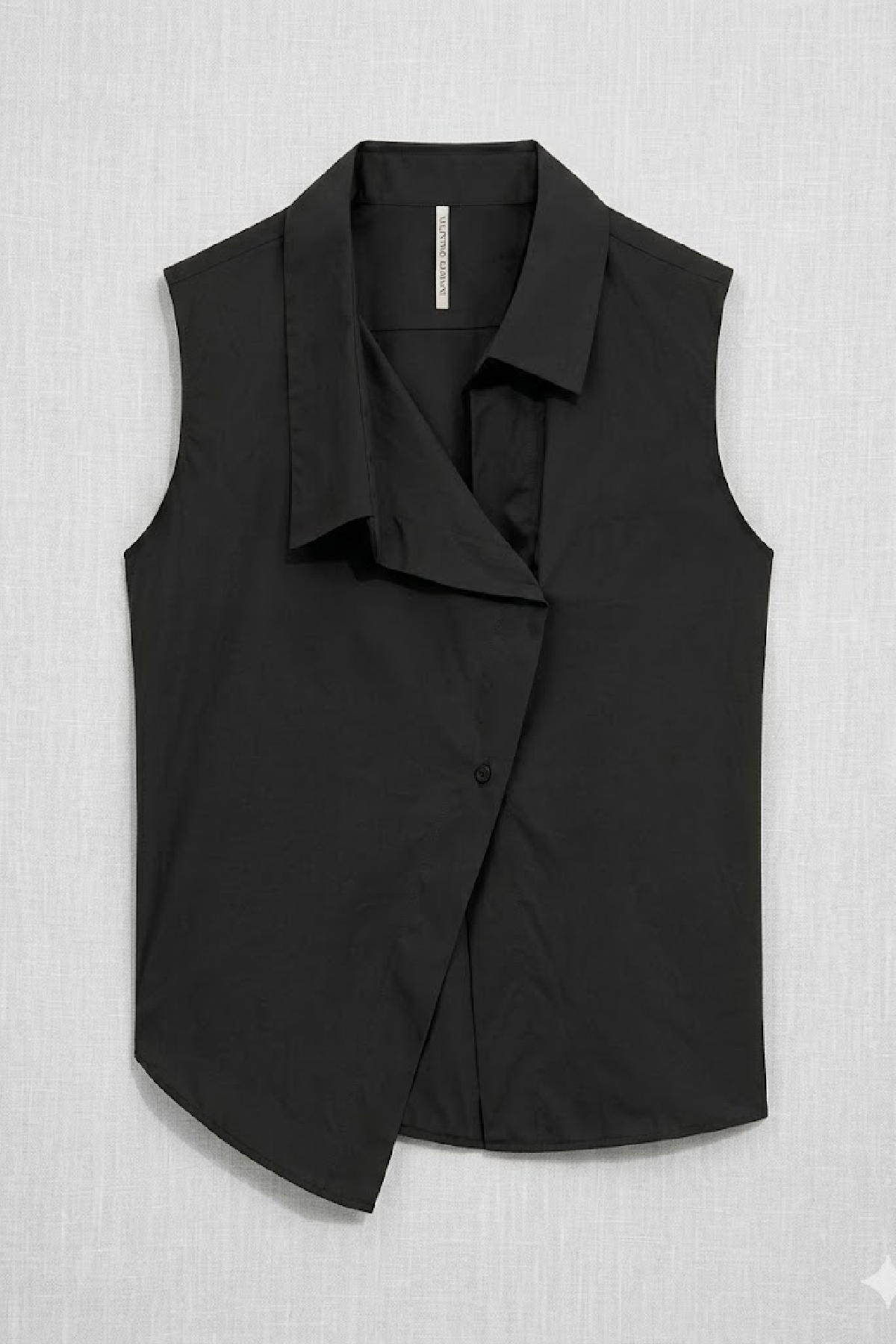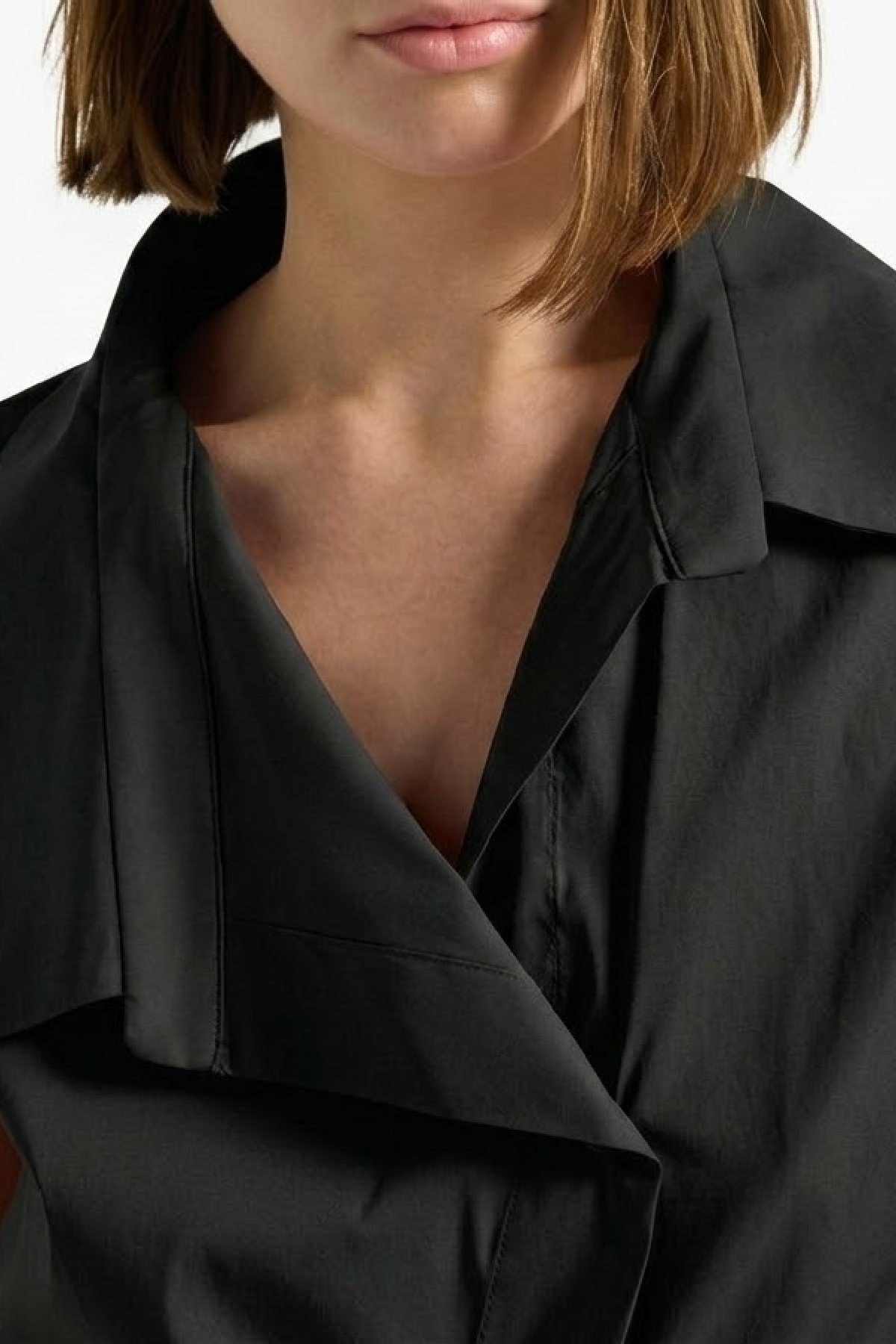 Asymmetrical wrap-over shirt top with a single, off-center button closure. It features a sculptural maxi lapel that creates a play of overlaps on the front. Composition: 68% cotton, 28% polyamide, 4% elastane.