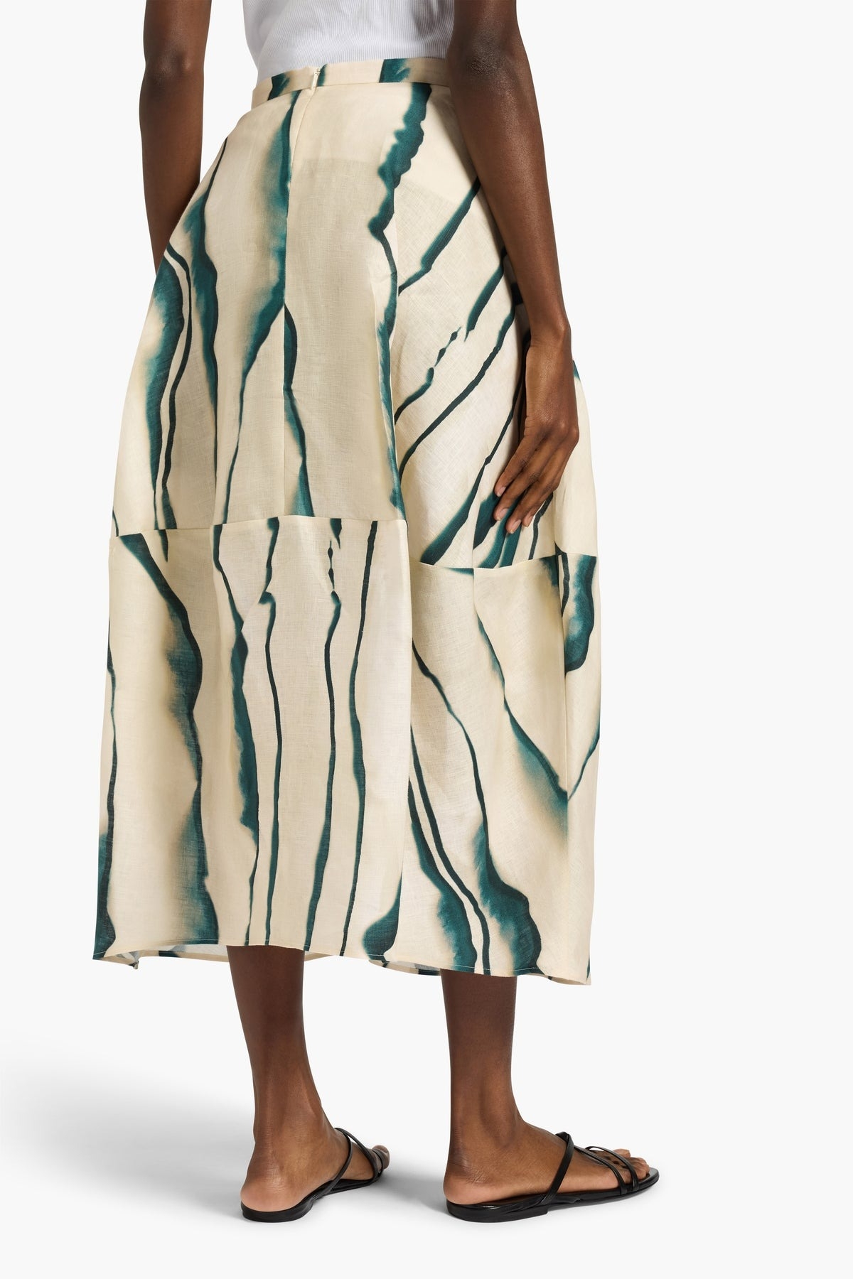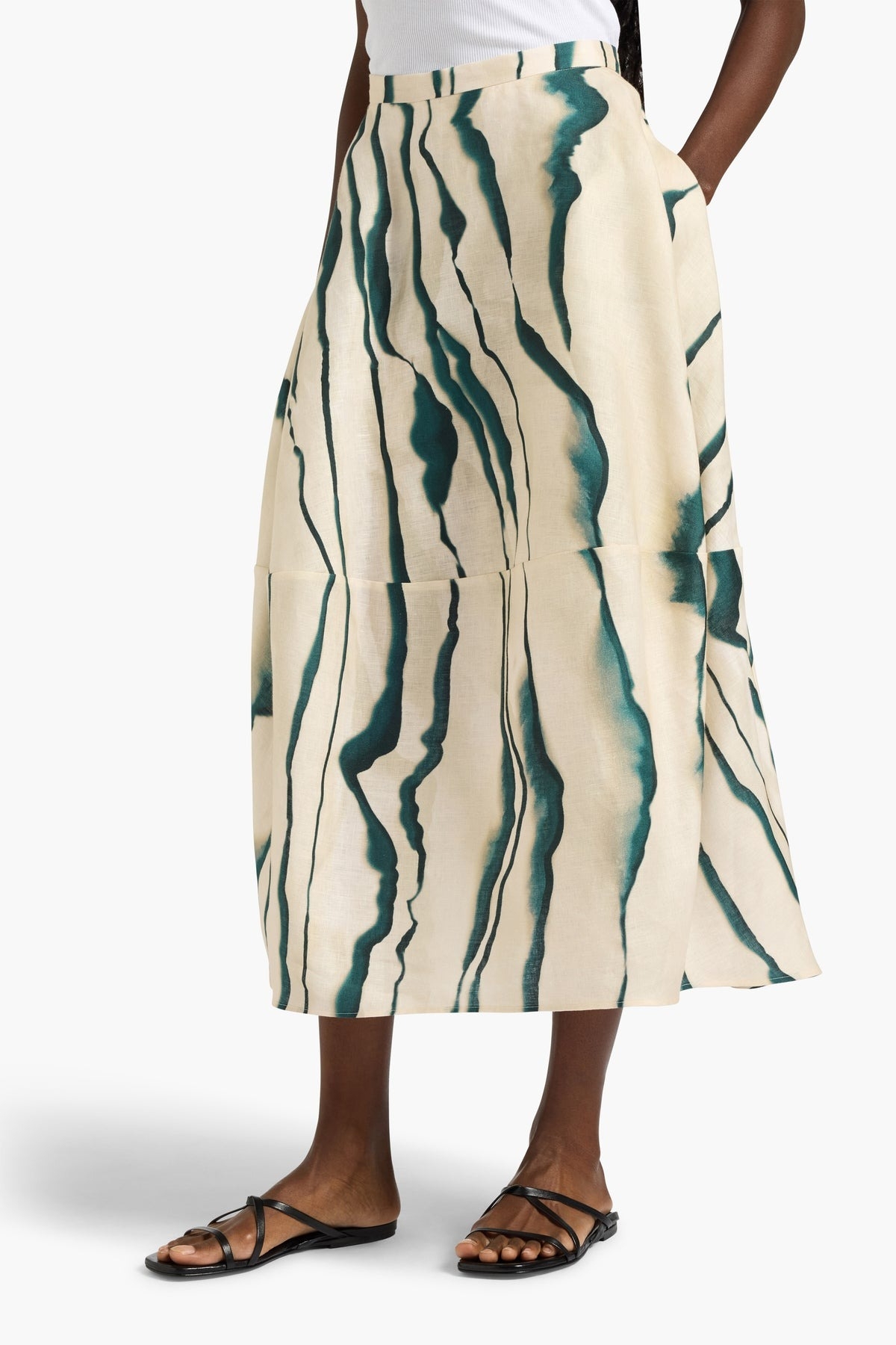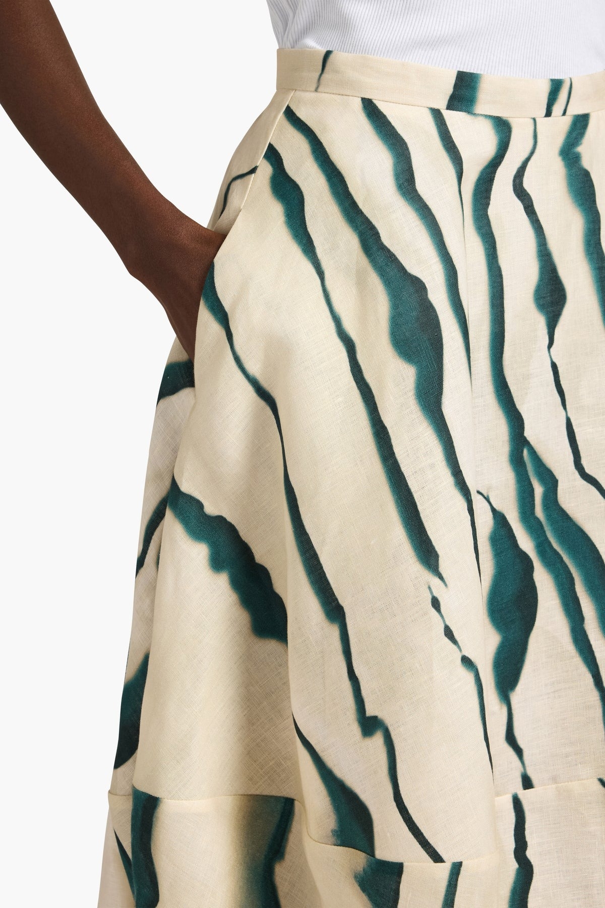 A-line midi skirt with a delicate paneled design that creates volume without weighing you down. The midi length (calf-length) ensures a timeless style. A defined high waist with a discreet closure is designed to accentuate the waistline and offer all-day comfort. : Nature-inspired graphic pattern with vertical brush strokes in deep forest green on an ecru background. Composition: 100% linen