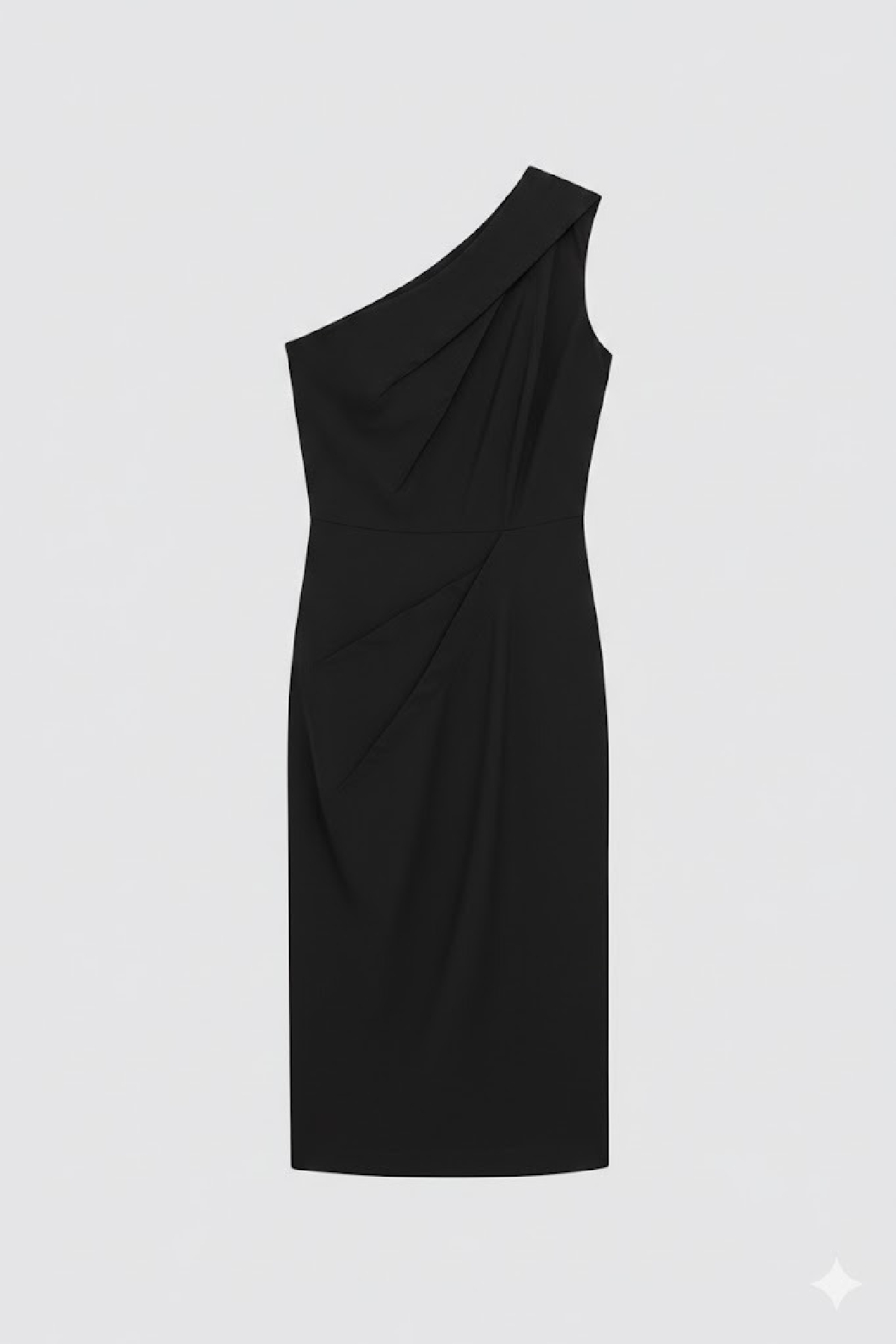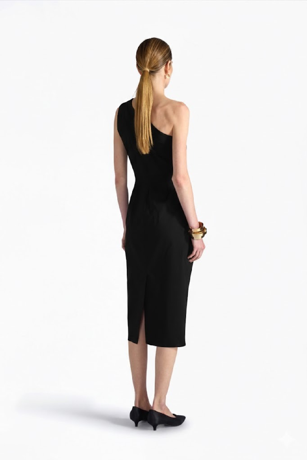 One-shoulder sheath dress in stretch technical viscose. Below-the-knee length, pleated front, center back slit. Composition: 71% Viscose 25% Polyamide 4% Elastane.