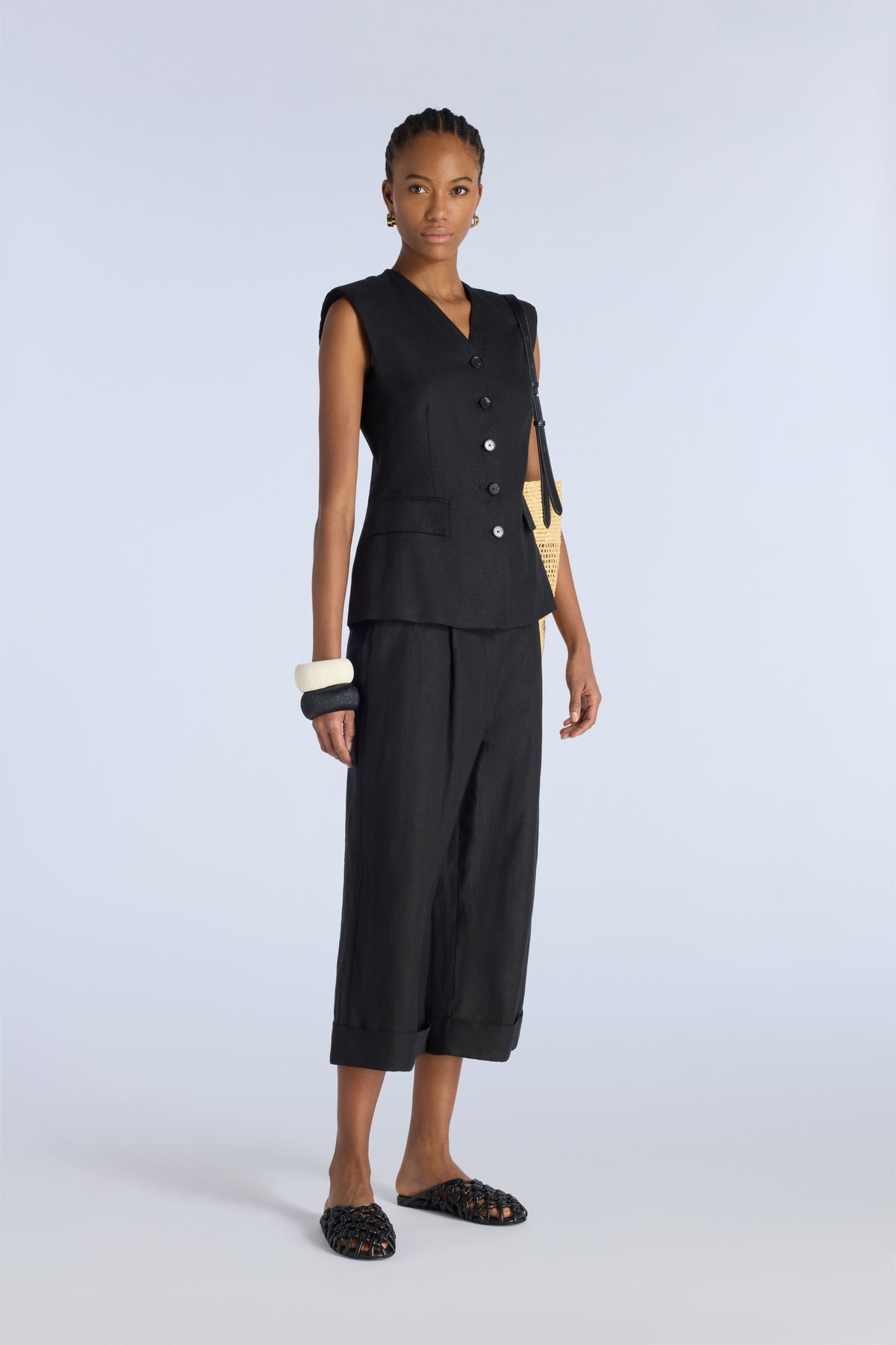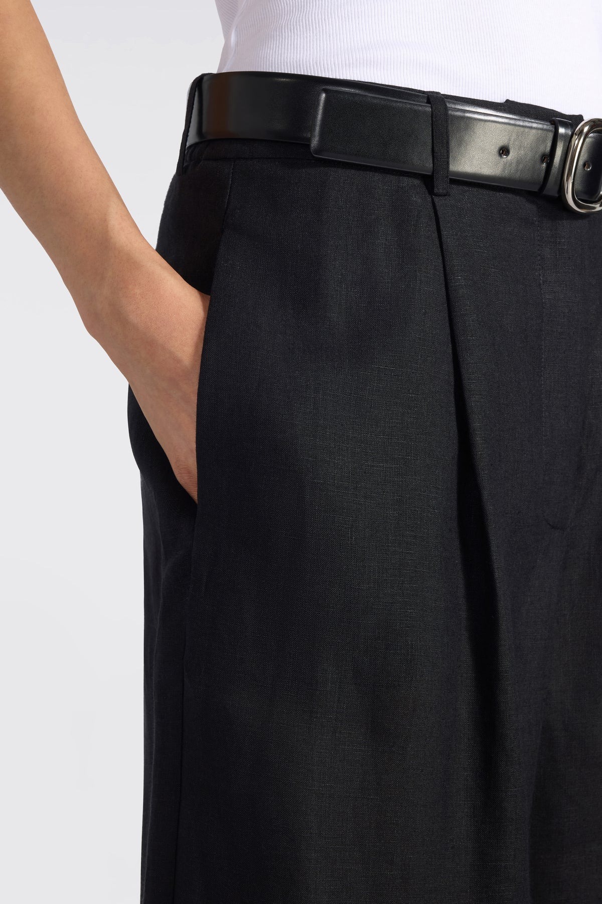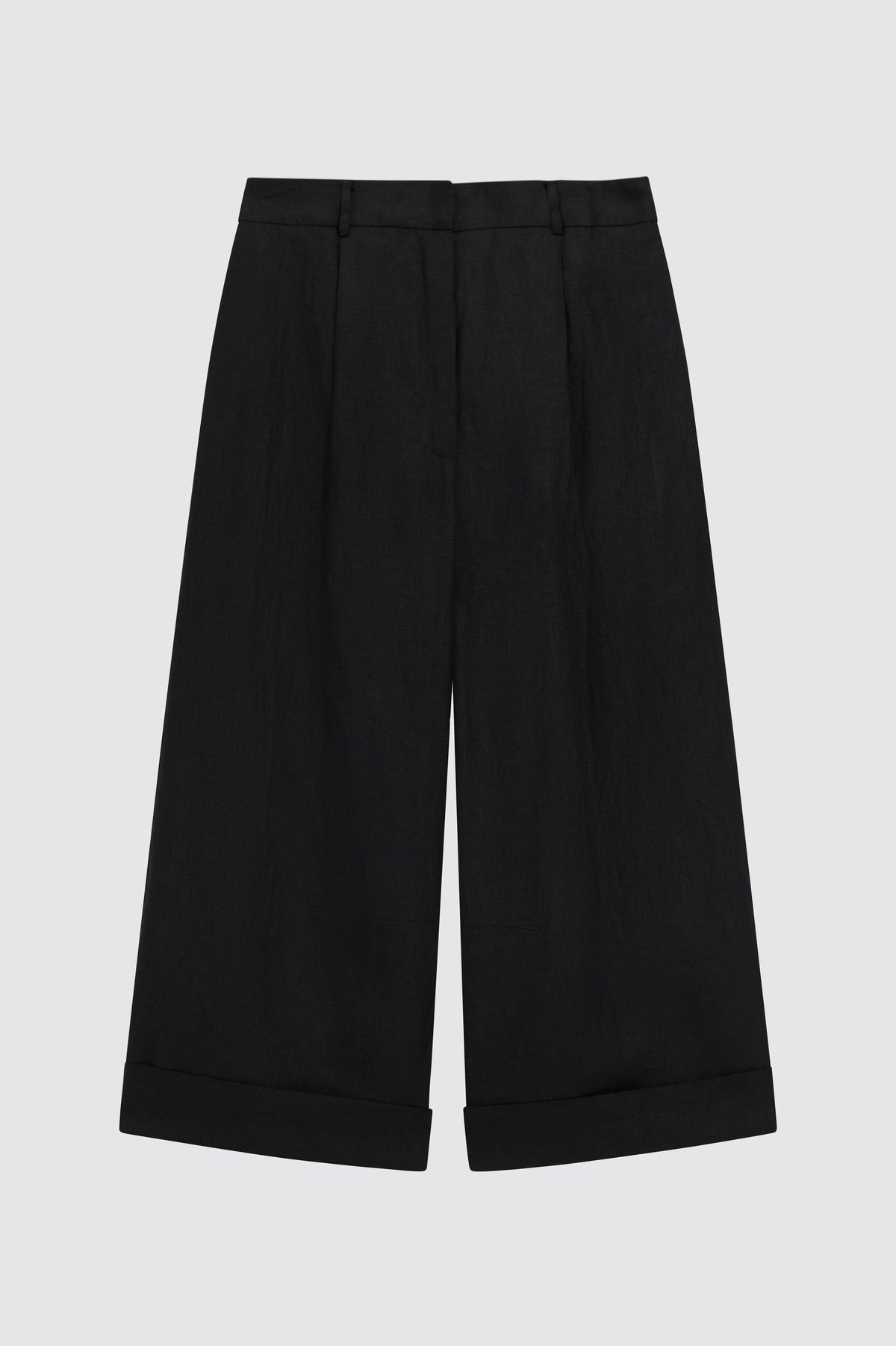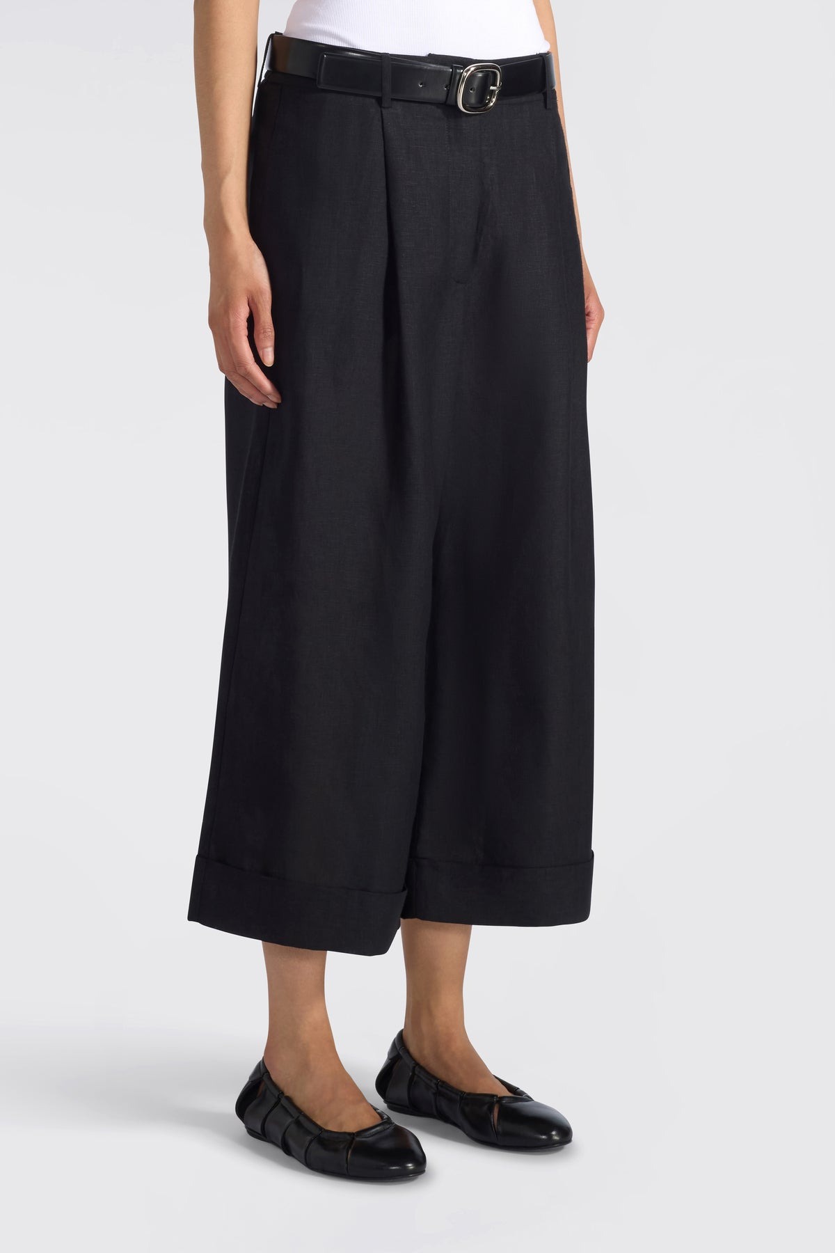 pantaloni crop con pinces e risvolto al fondo . chiusura centrale nascosta con bottoni, tasche laterali a filetto, passanti con cintura. Composizione: 95% lino 5% kashmir