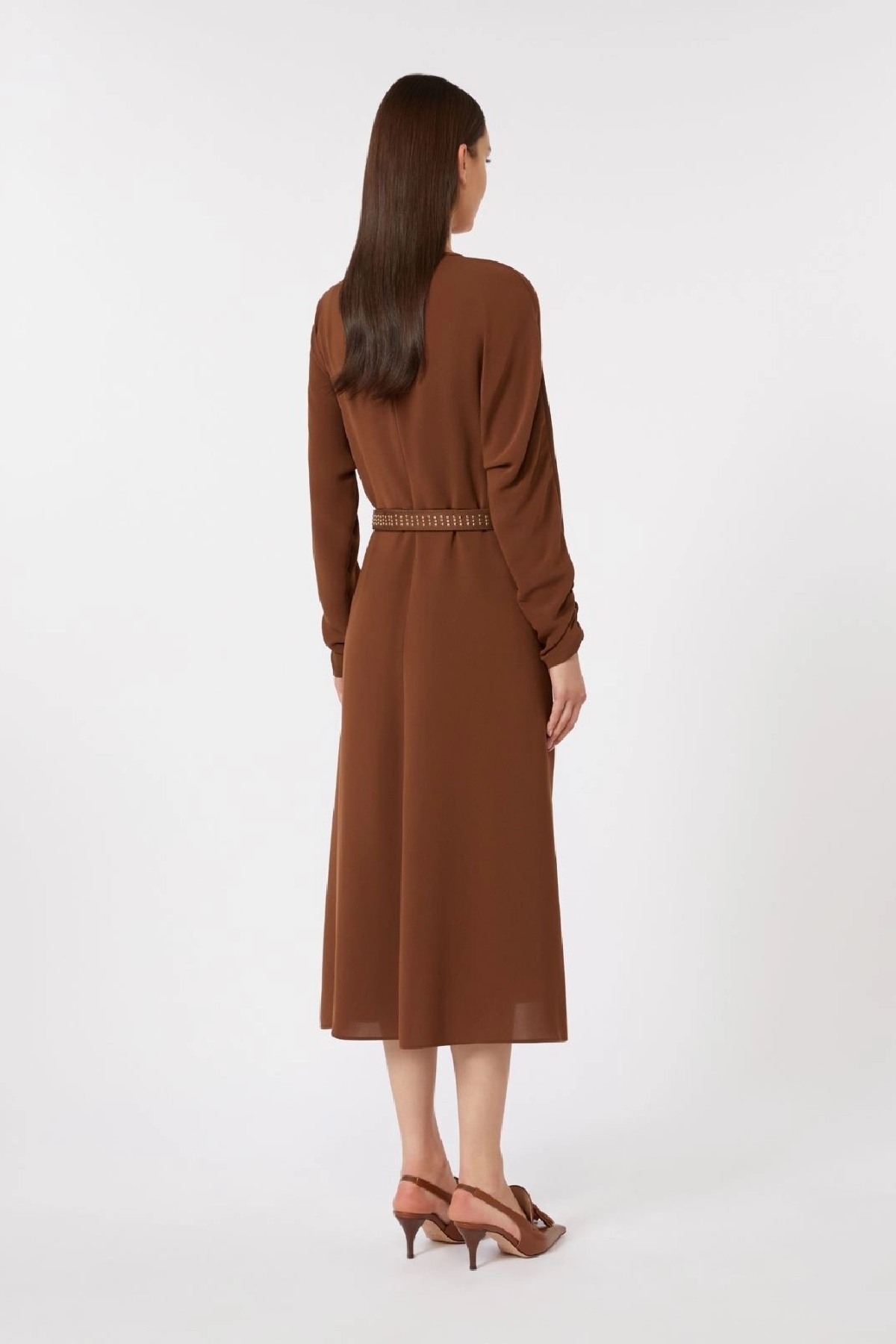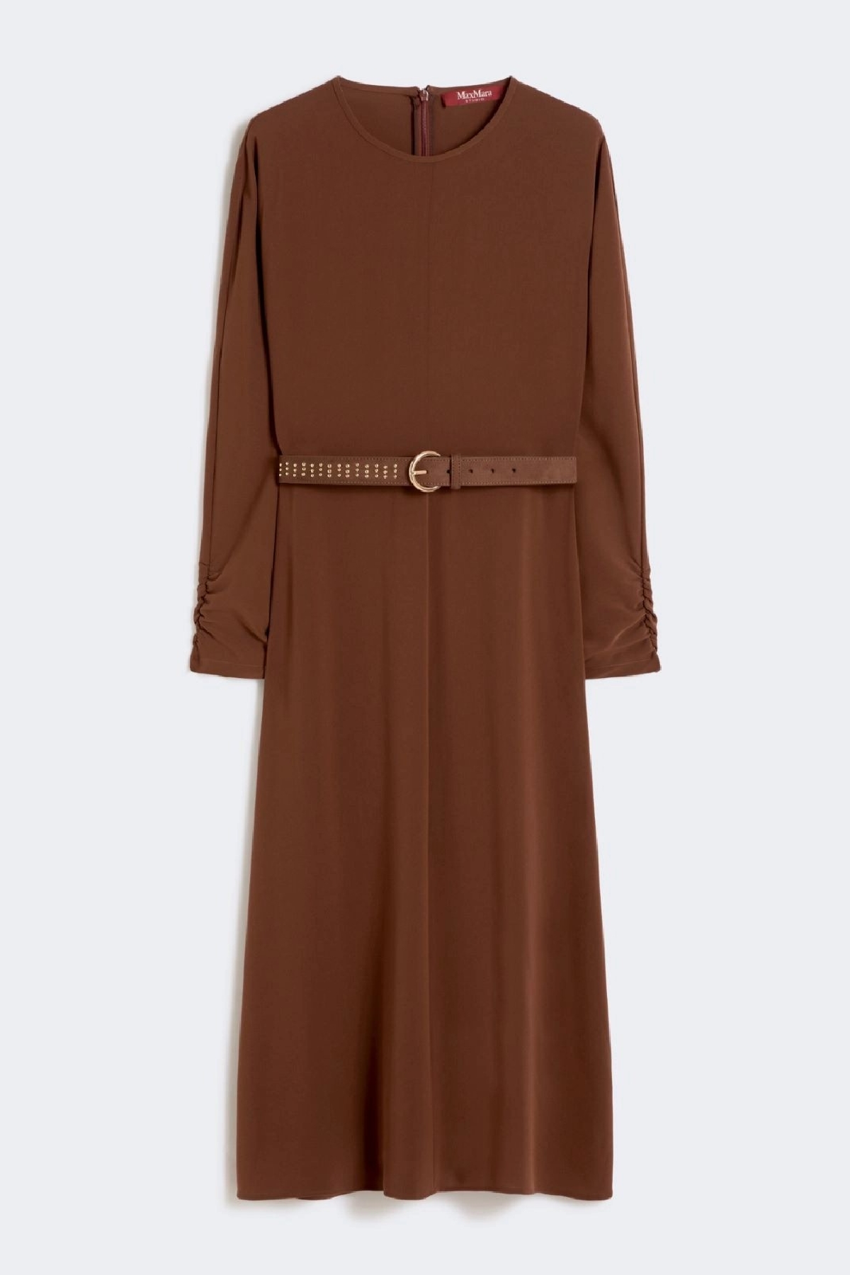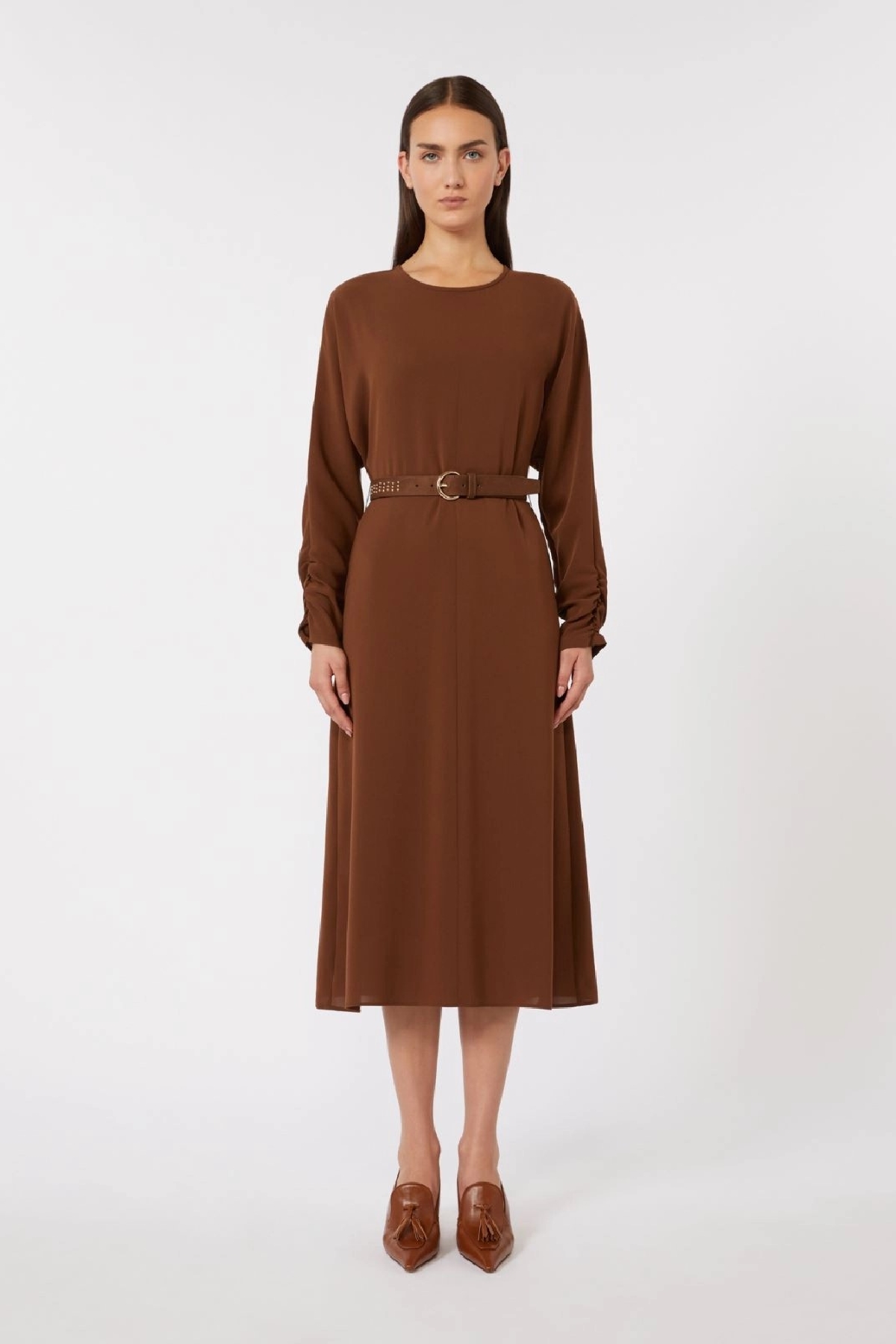 Midi dress with a flowing and feminine silhouette. Flared fit with a fitted waist. Crew neck.