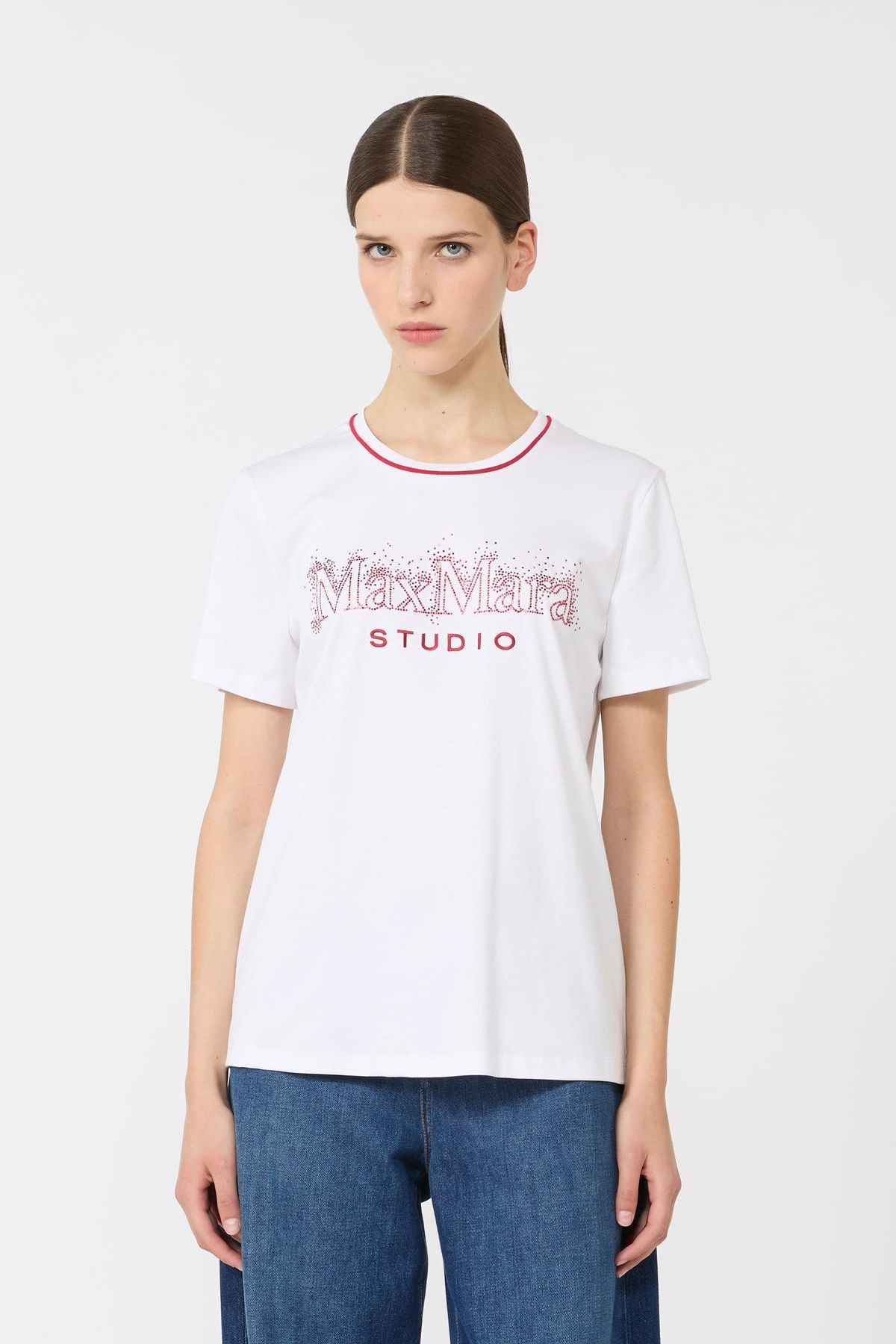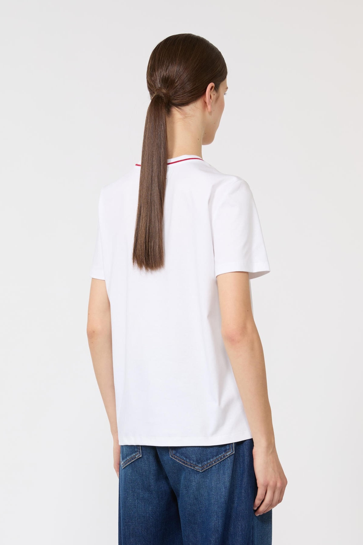 Basic T-shirt, decorated with a print and embroidery on the front. Short sleeves, crew neck. Logo on the back. Composition: 100% Cotton.