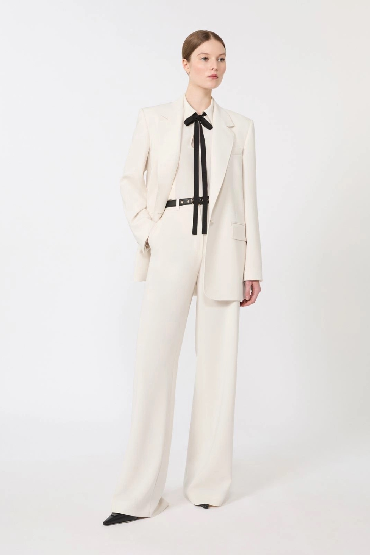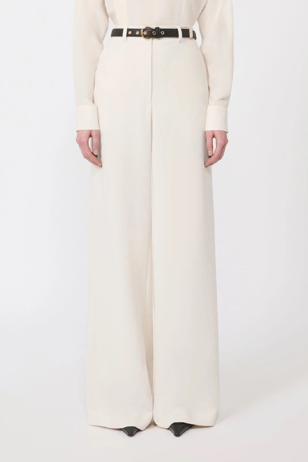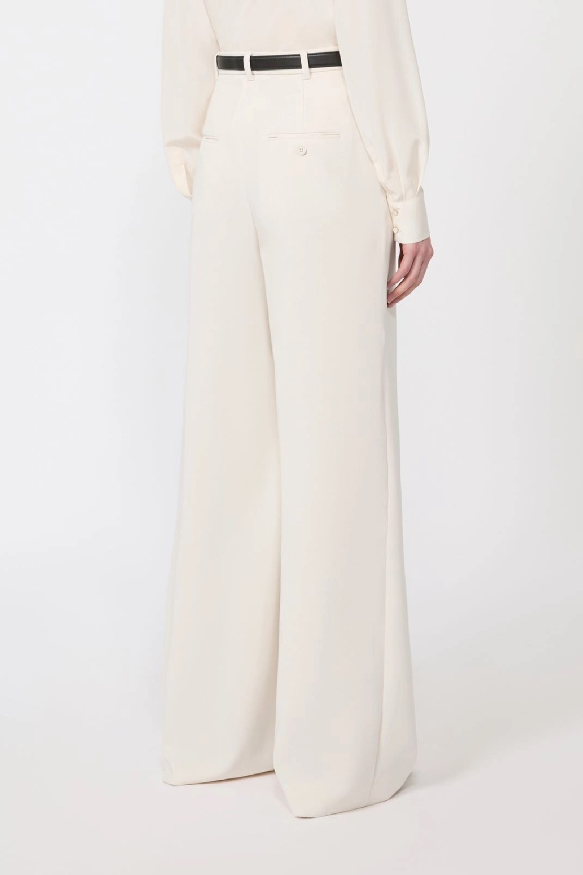 Wide-leg trousers featuring a loose silhouette and a mid-high waist. French pockets. Matching nappa leather belt with a circular buckle. Composition: 71% triacetate, 29% polyester.