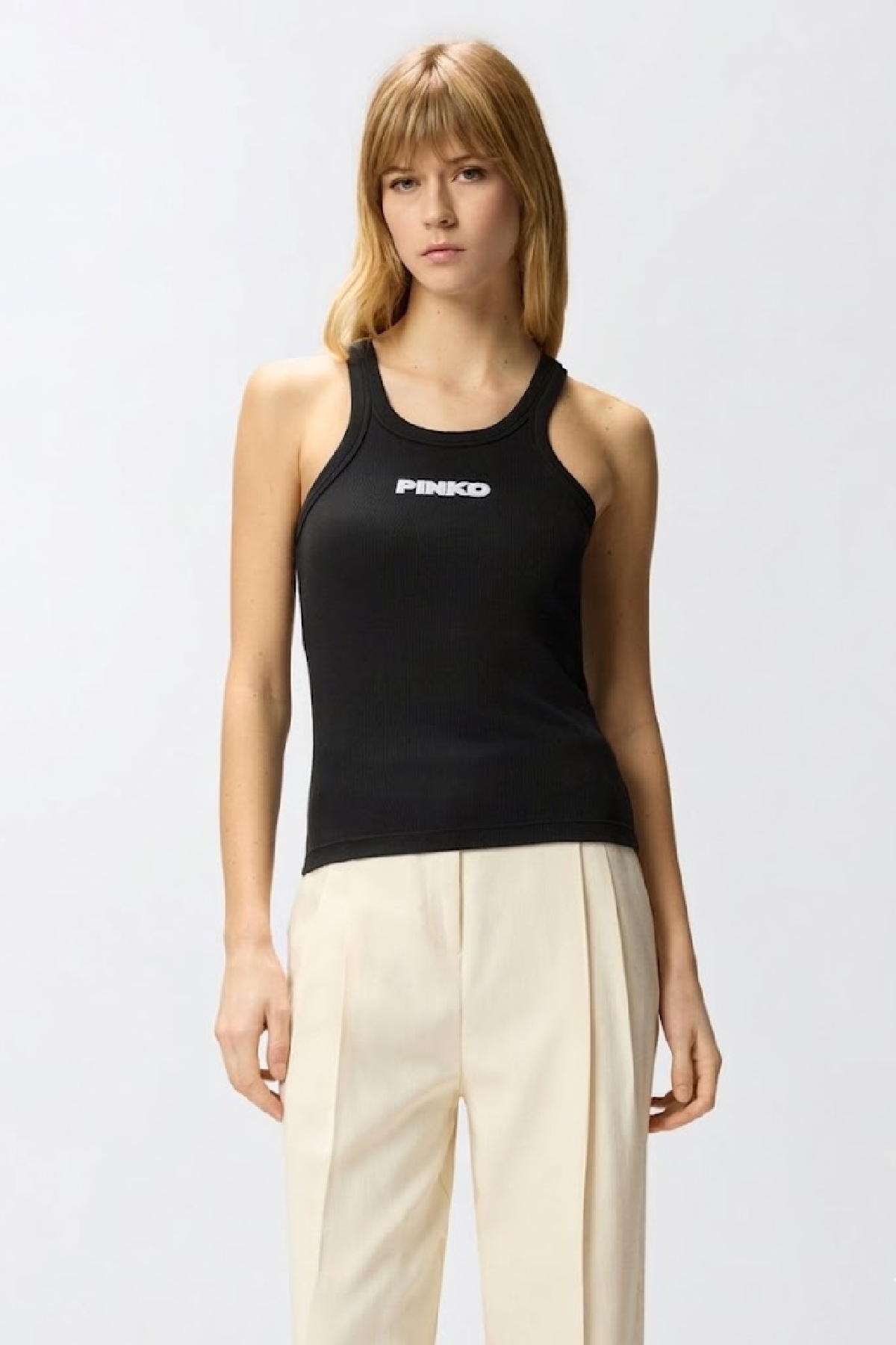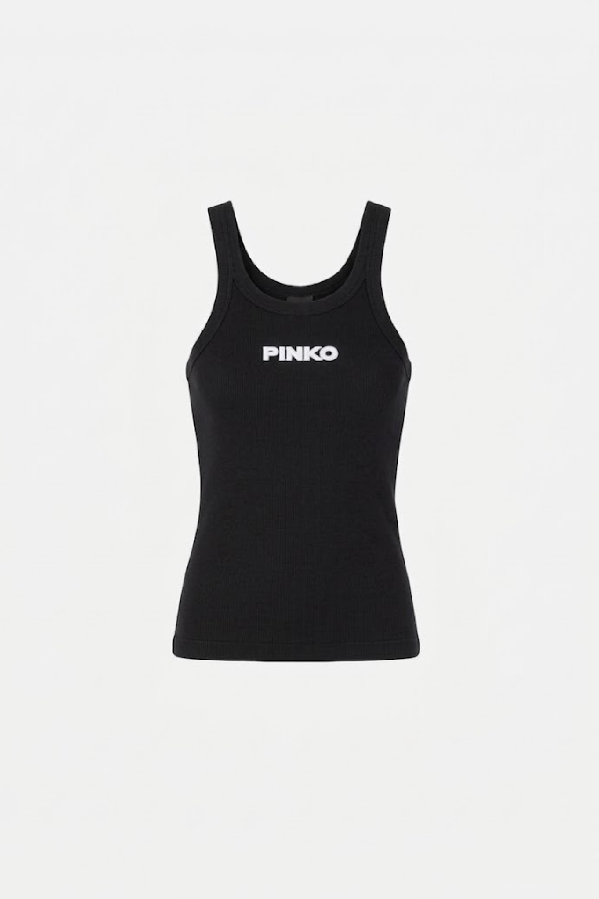 Pure cotton ribbed tank top featuring a contrasting, embossed embroidery of the iconic PINKO lettering logo on the front. A women's wardrobe essential, perfect for creating functional yet contemporary summer looks. Composition: 95% COTTON 5% ELASTANE