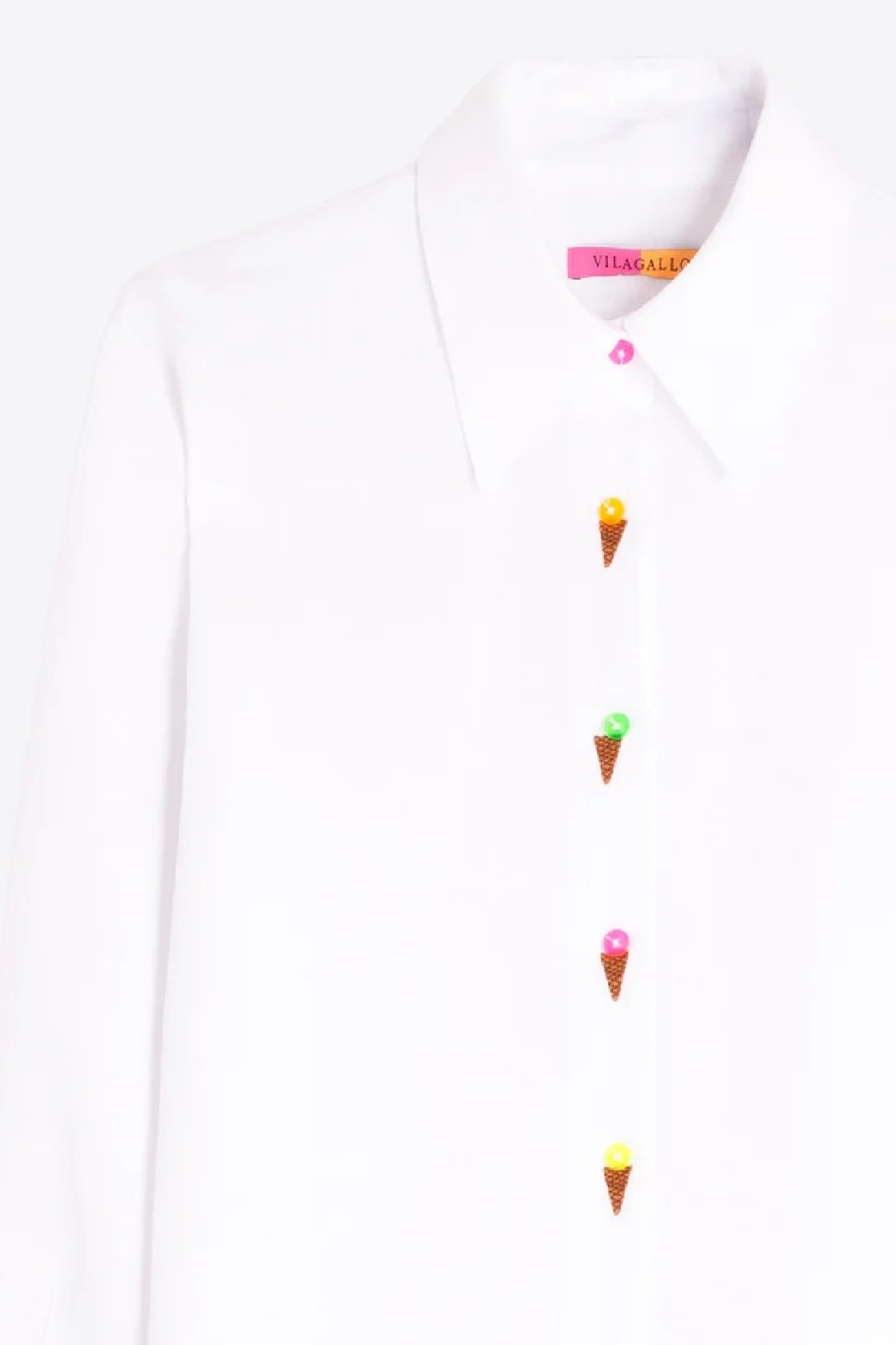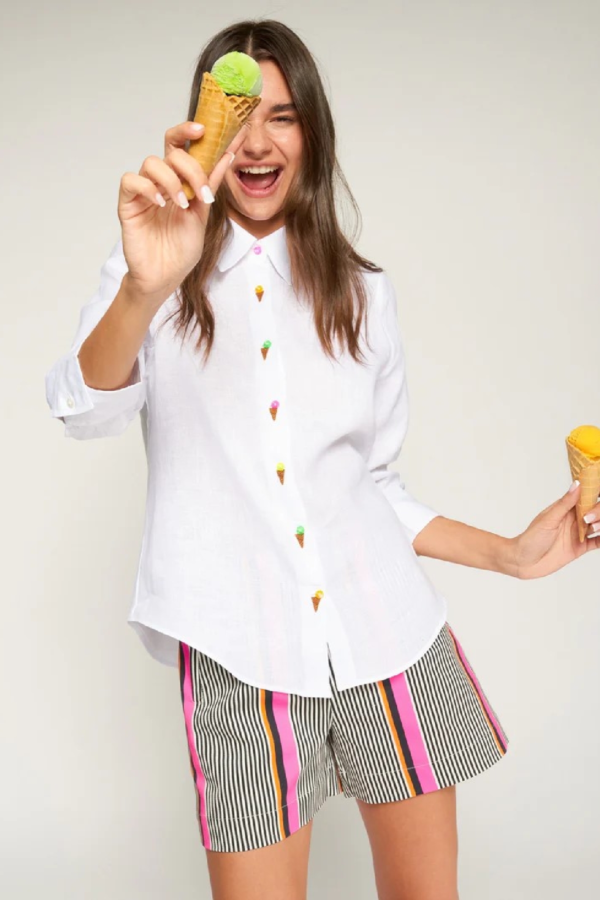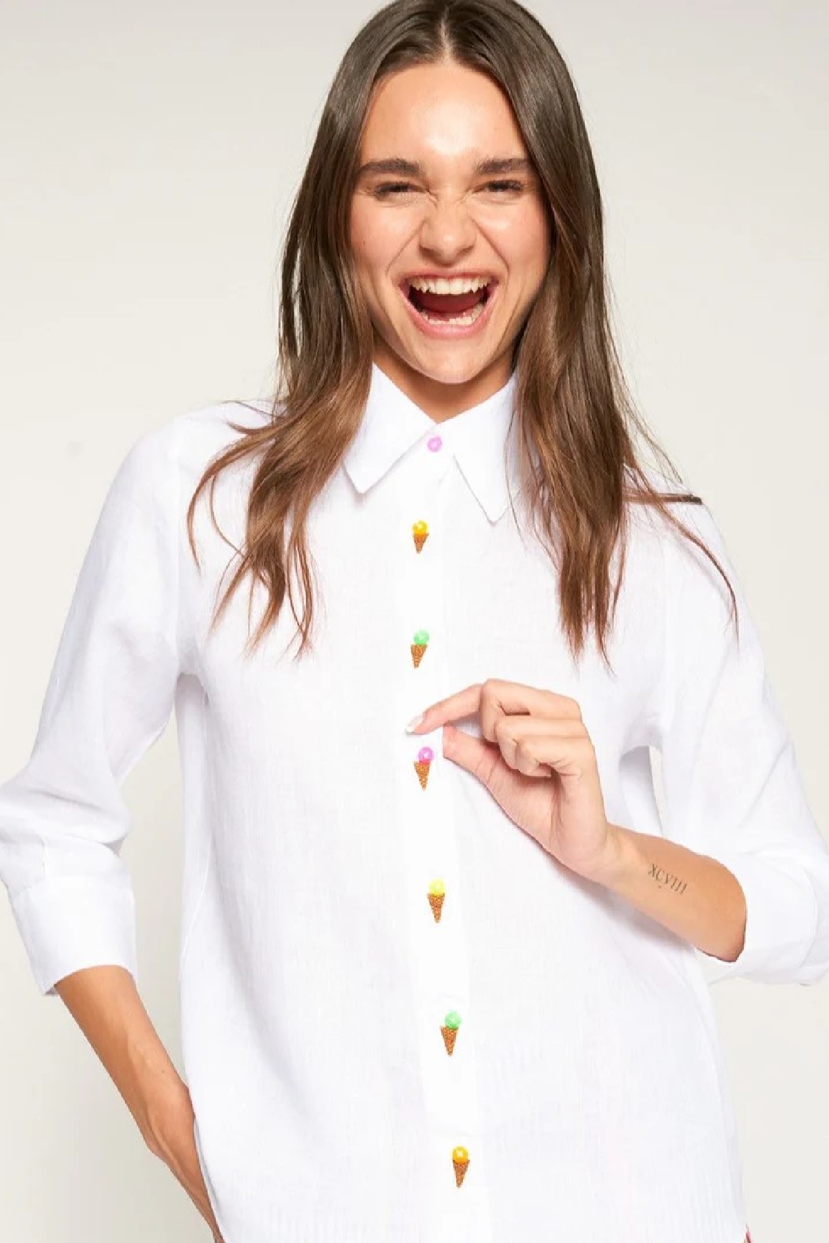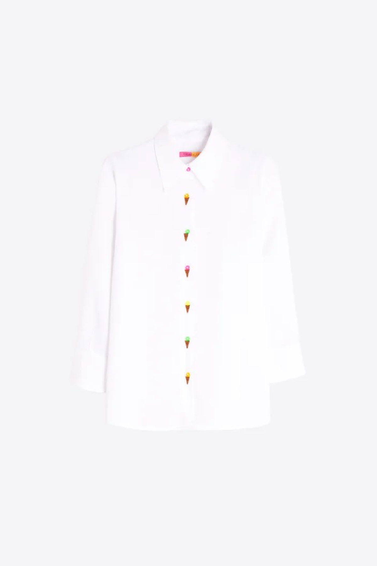 Straight-fit white shirt with embroidered ice cream details along the front button placket. Classic collar and 3/4 sleeves. Composition: 100% linen.