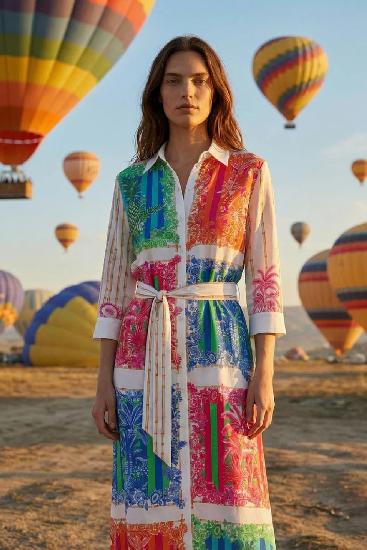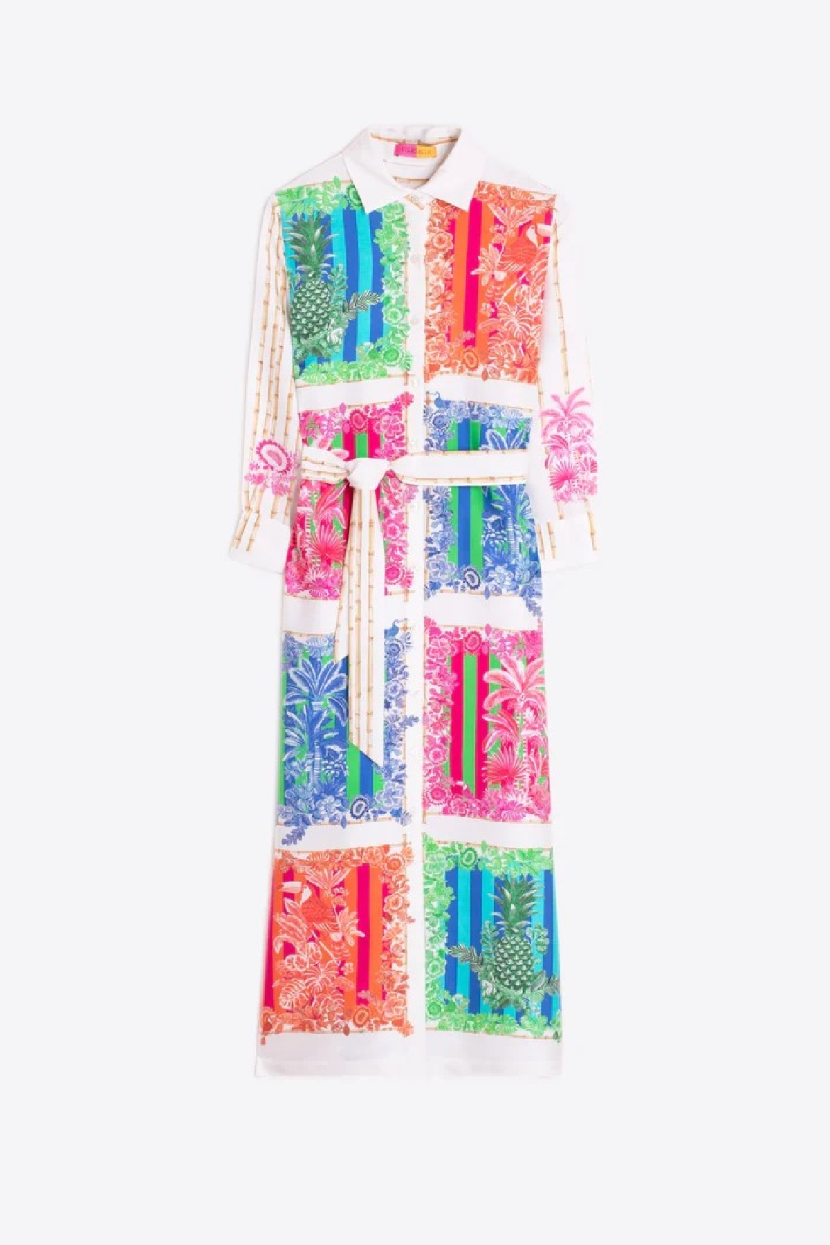 An elegant and versatile piece, perfect for any occasion. This midi shirt dress stands out with its vibrant, bamboo-themed multicolor print. It features a classic shirt collar, a button-down front, and practical three-quarter sleeves with cuffs. The straight silhouette is enhanced by a matching removable belt, allowing you to adjust the fit to your preference. A sophisticated garment that seamlessly blends comfort and style.