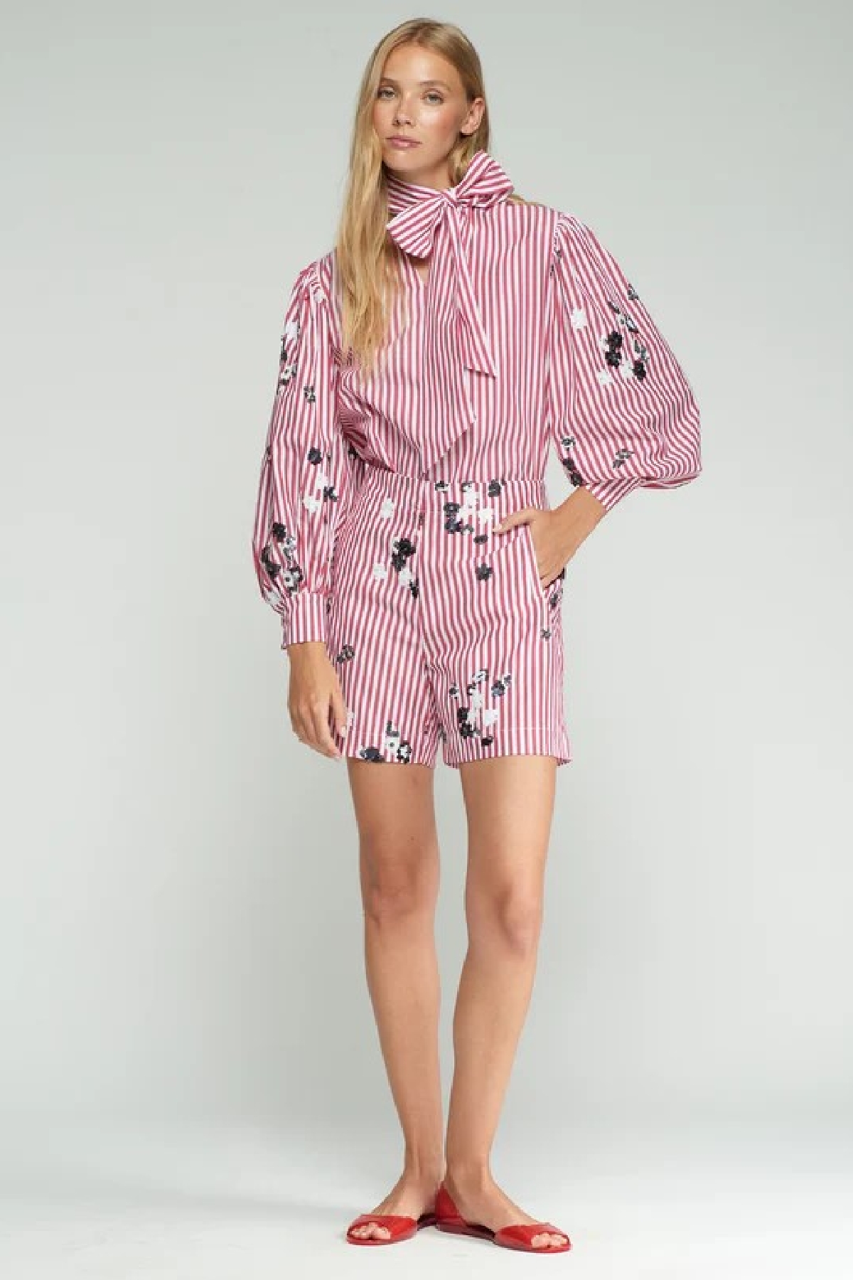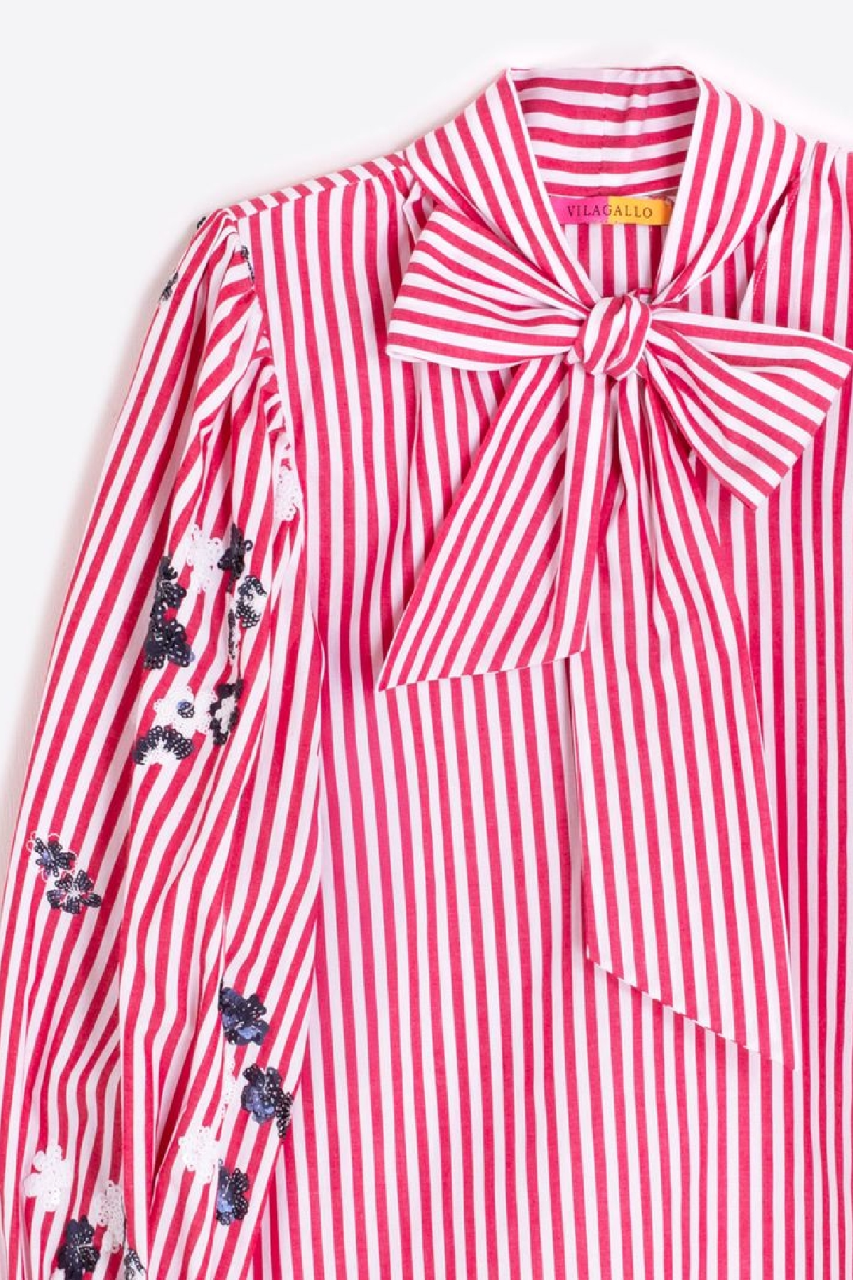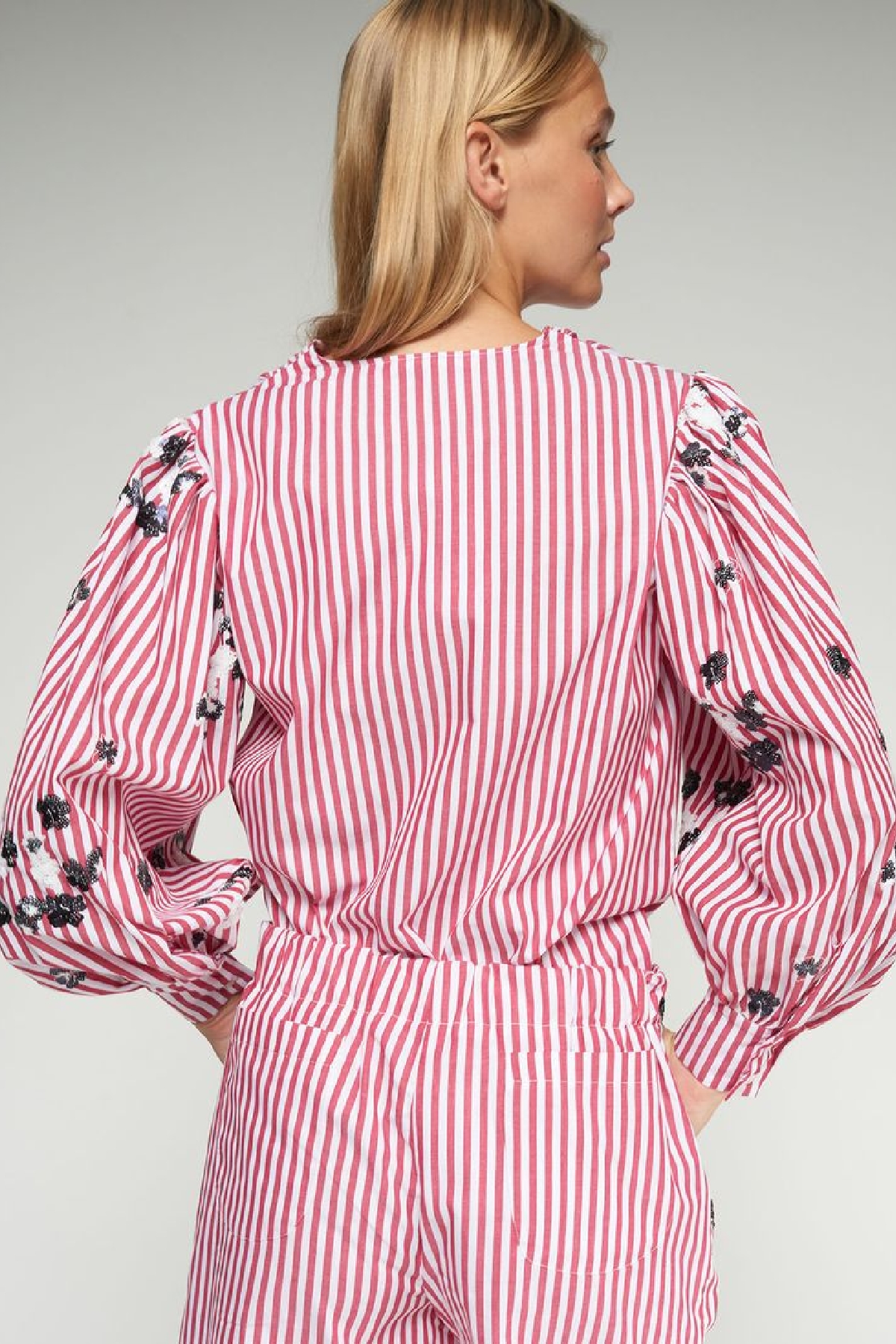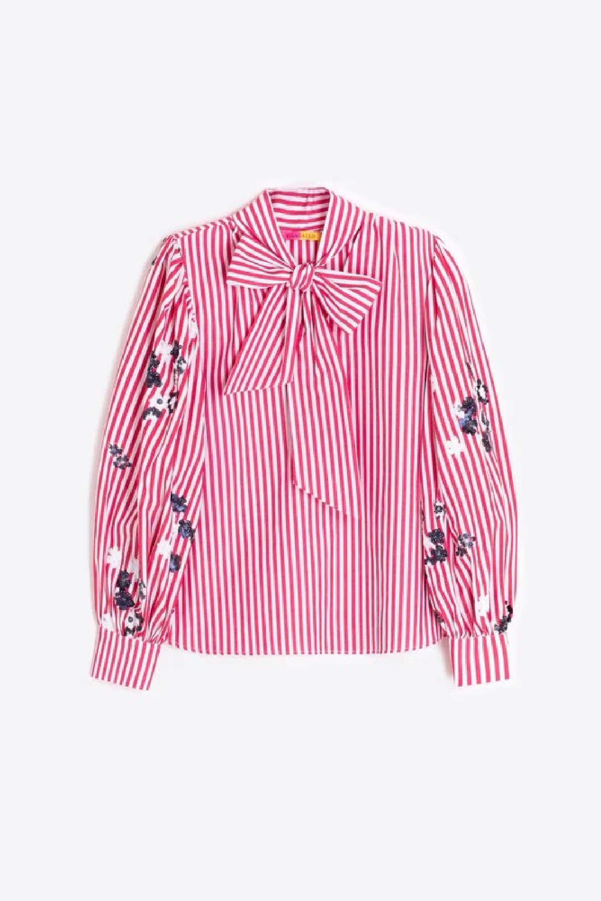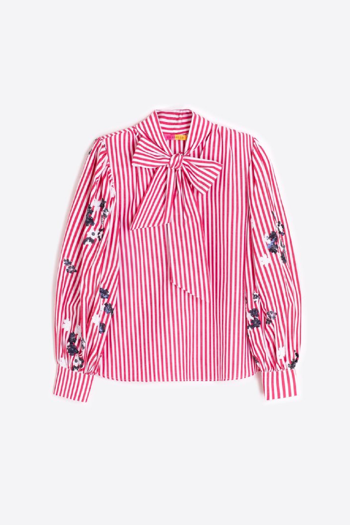 Red and white striped shirt. V-neck with drawstring. Long puff sleeves. Floral embroidery on both sleeves. Add a romantic and lively touch to your wardrobe with this shirt. Composition: 100% Cotone
