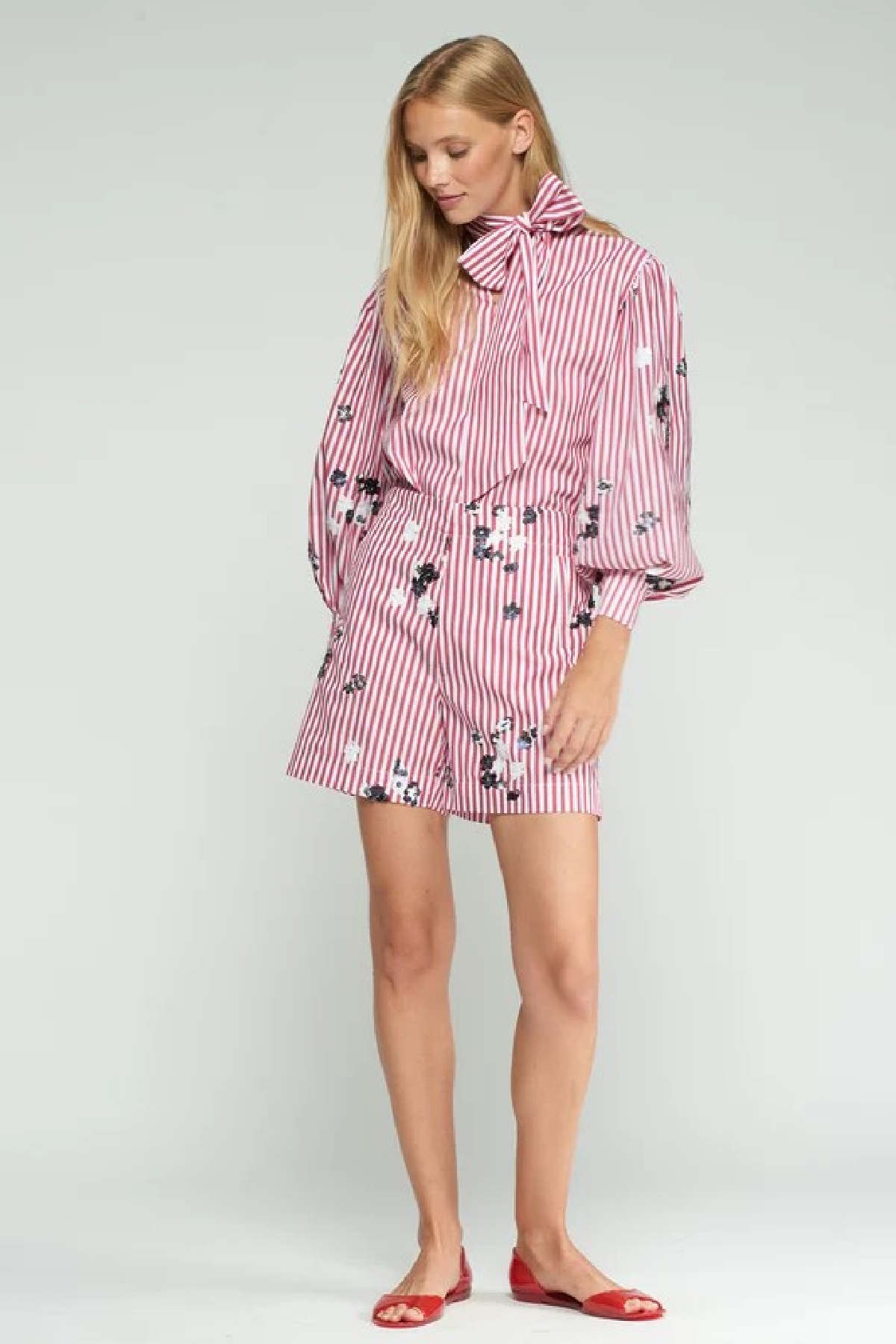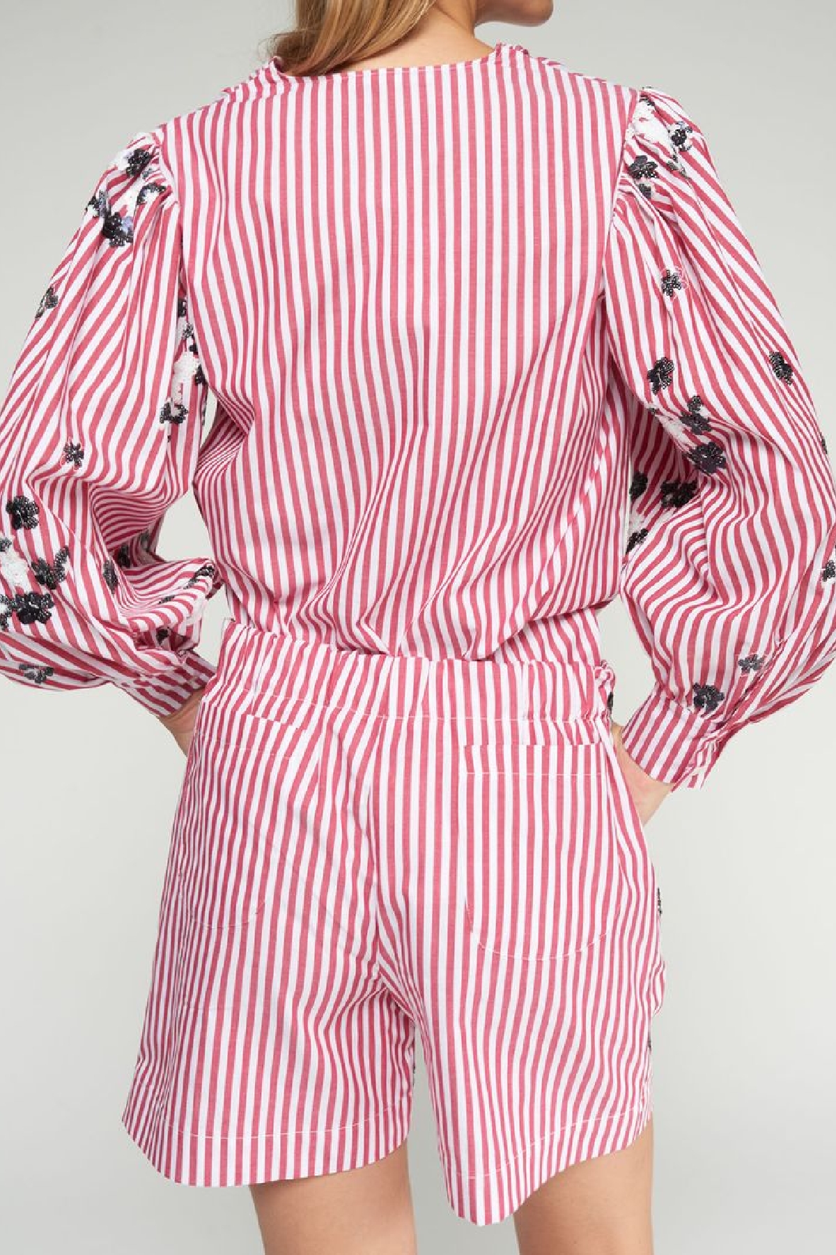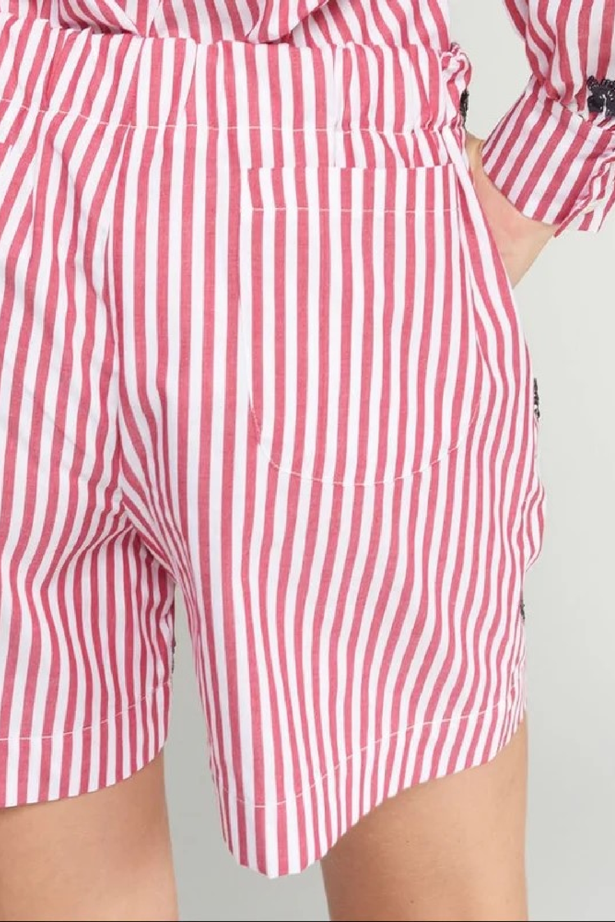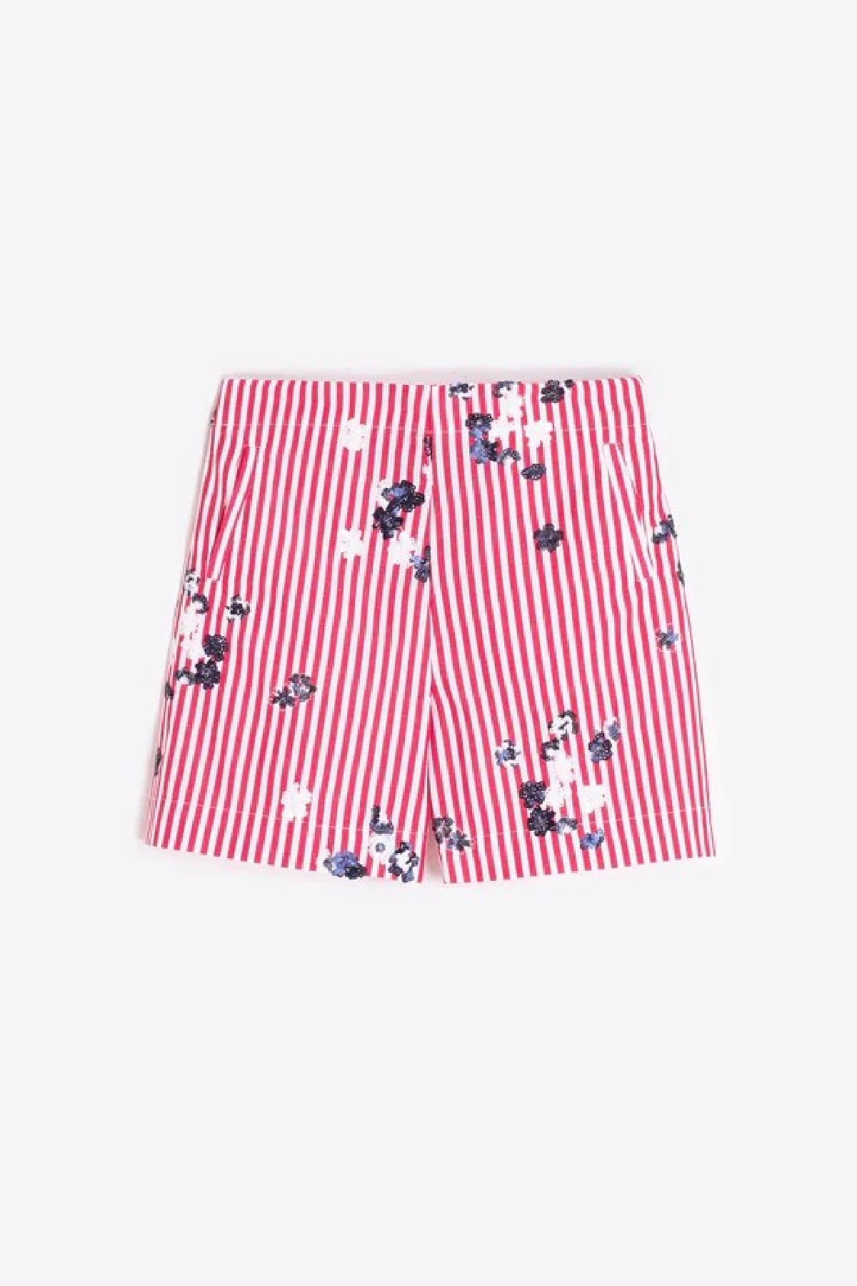 Red and white striped shorts with embroidered flowers on the front. Side pockets. Composition: 100% cotton.