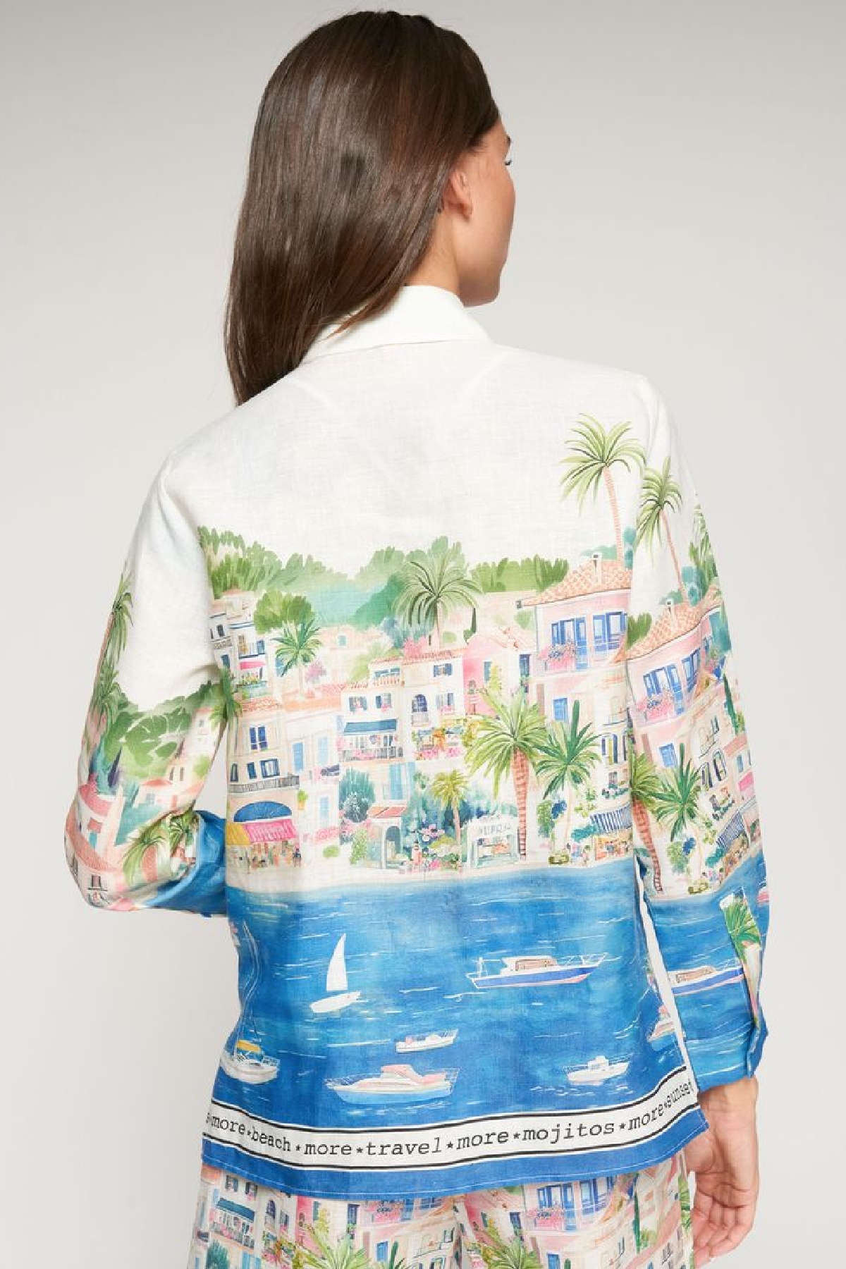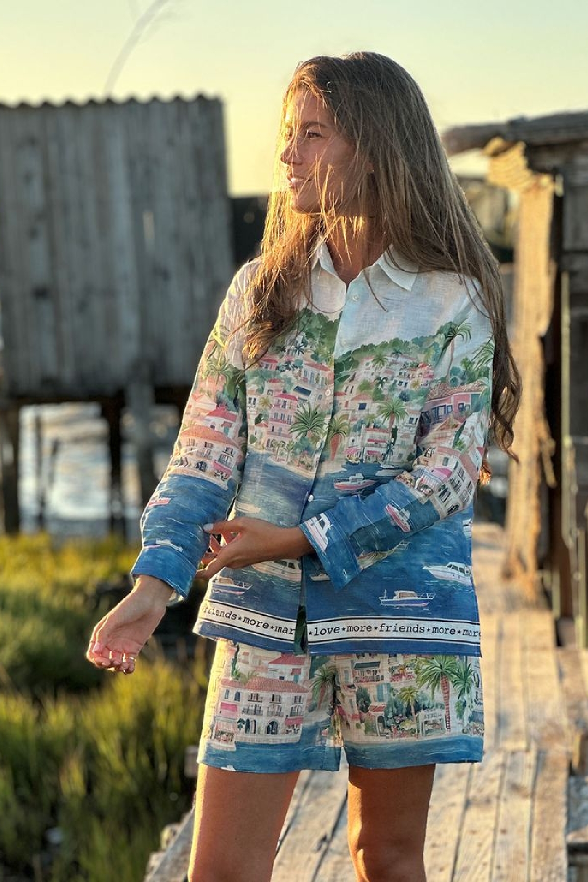 Landscape print shirt. Pointed collar, concealed button closure, "friends more mare" logo trim. Composition: 100% linen