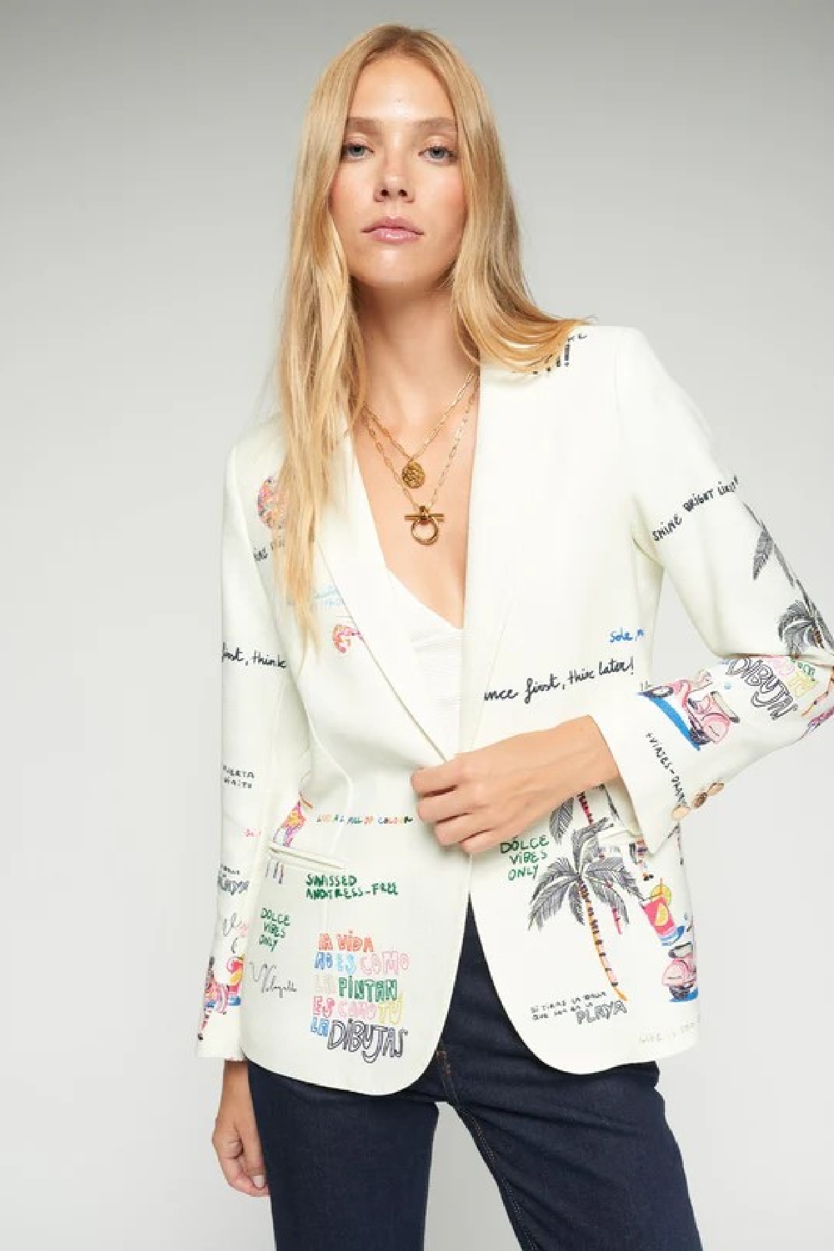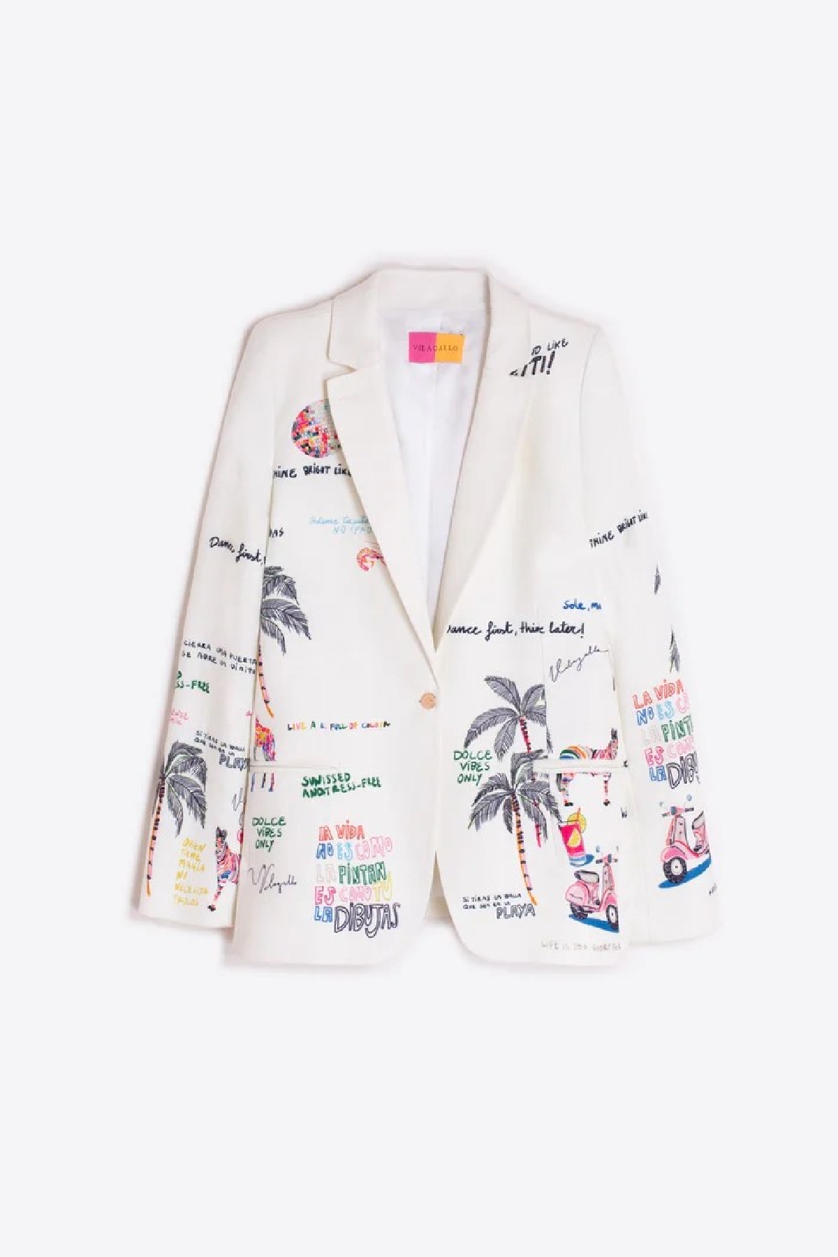 White, straight-fit jacket featuring a whimsical multicolor print with illustrations and graphic messages. The style features classic lapels, a front button closure, and functional welt pockets. Finished with long sleeves and a fully lined interior for maximum comfort. Composition: 70% Viscose, 30% Linen