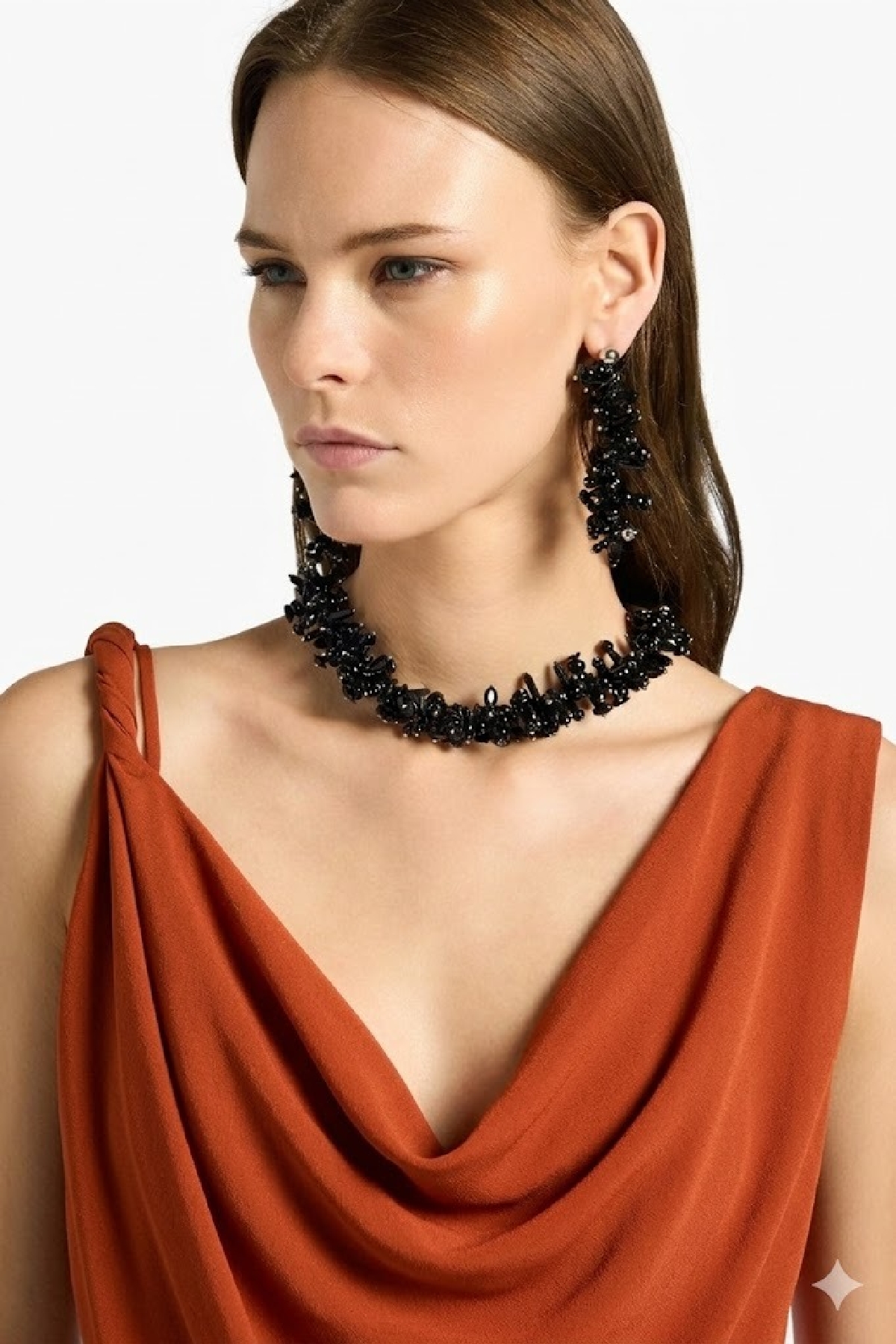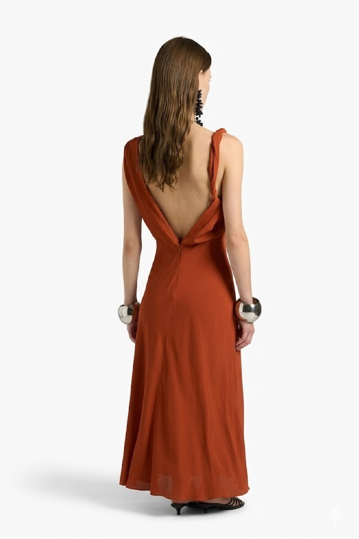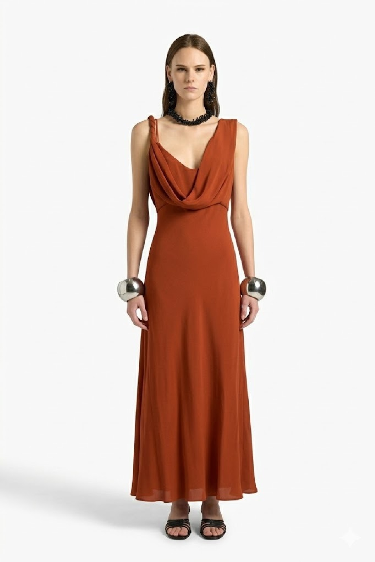 Abito lungo smanicato in crepe de chine acetato seta. Spalline assimetriche di cui una arrotolata.Taglio in vita. Zip centrale con scollo a V sul dietro. Linea sagomata. Composizione:65% acetato 35% seta