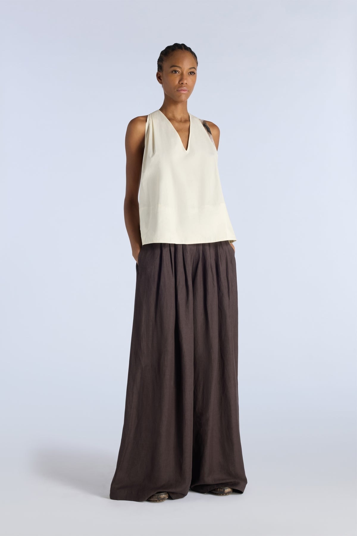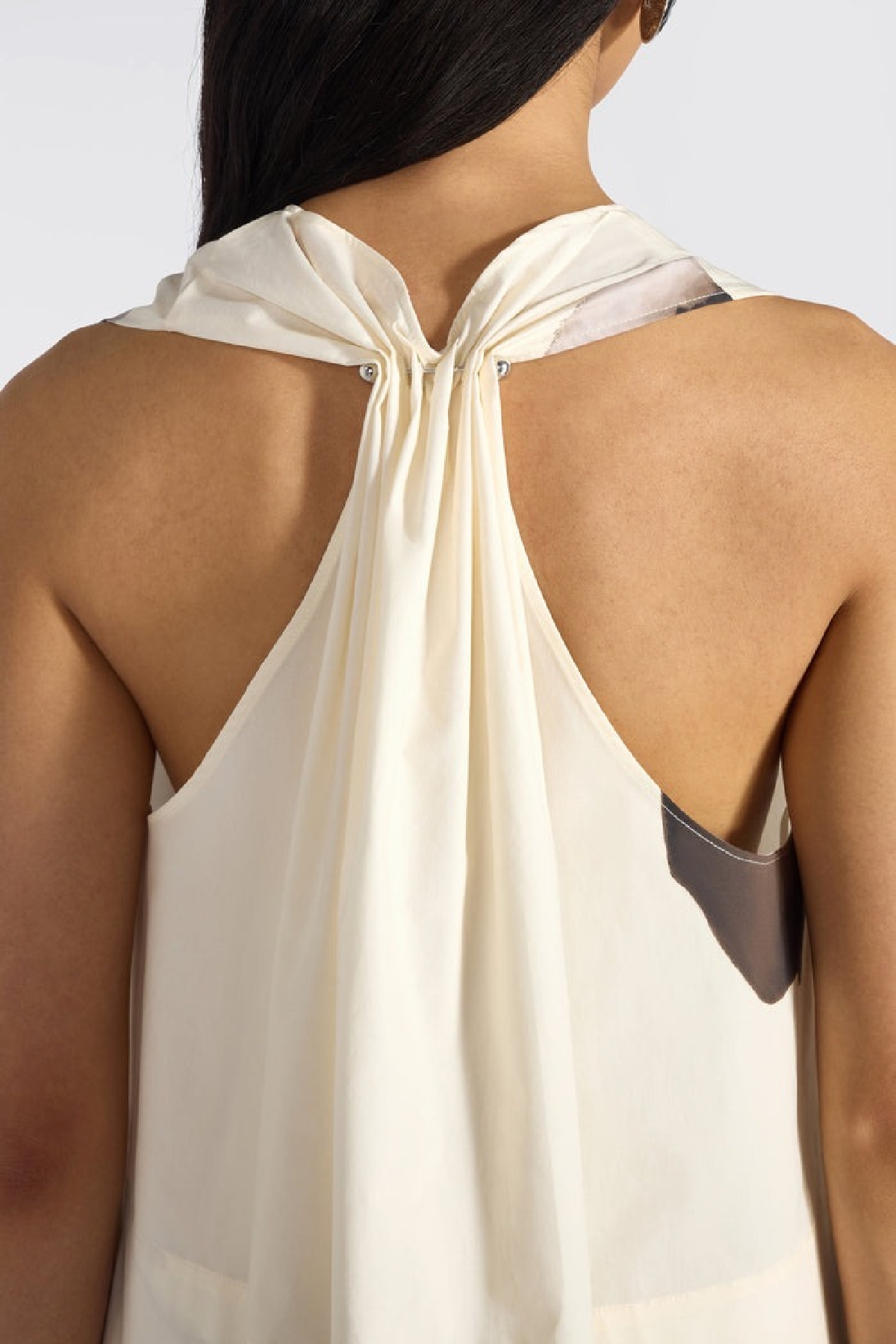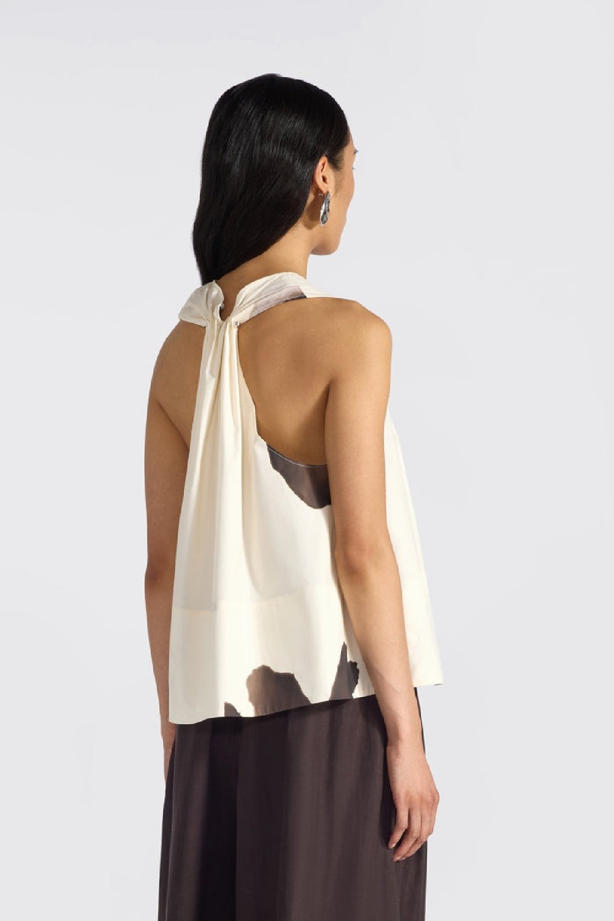 top in popeline di cotone stretch stampa fiore sfumato con scollo a V . Spilla sul retro per regolare lo scollo. Composizione: 97% cotone 3% elastane