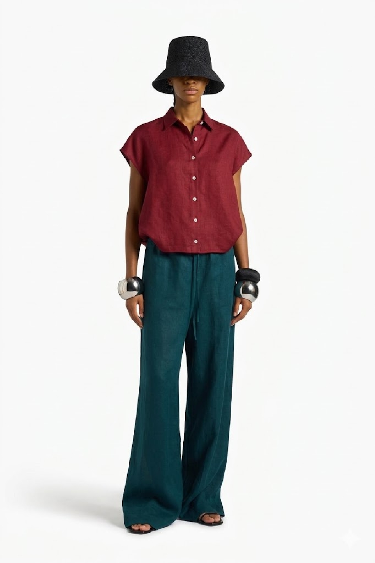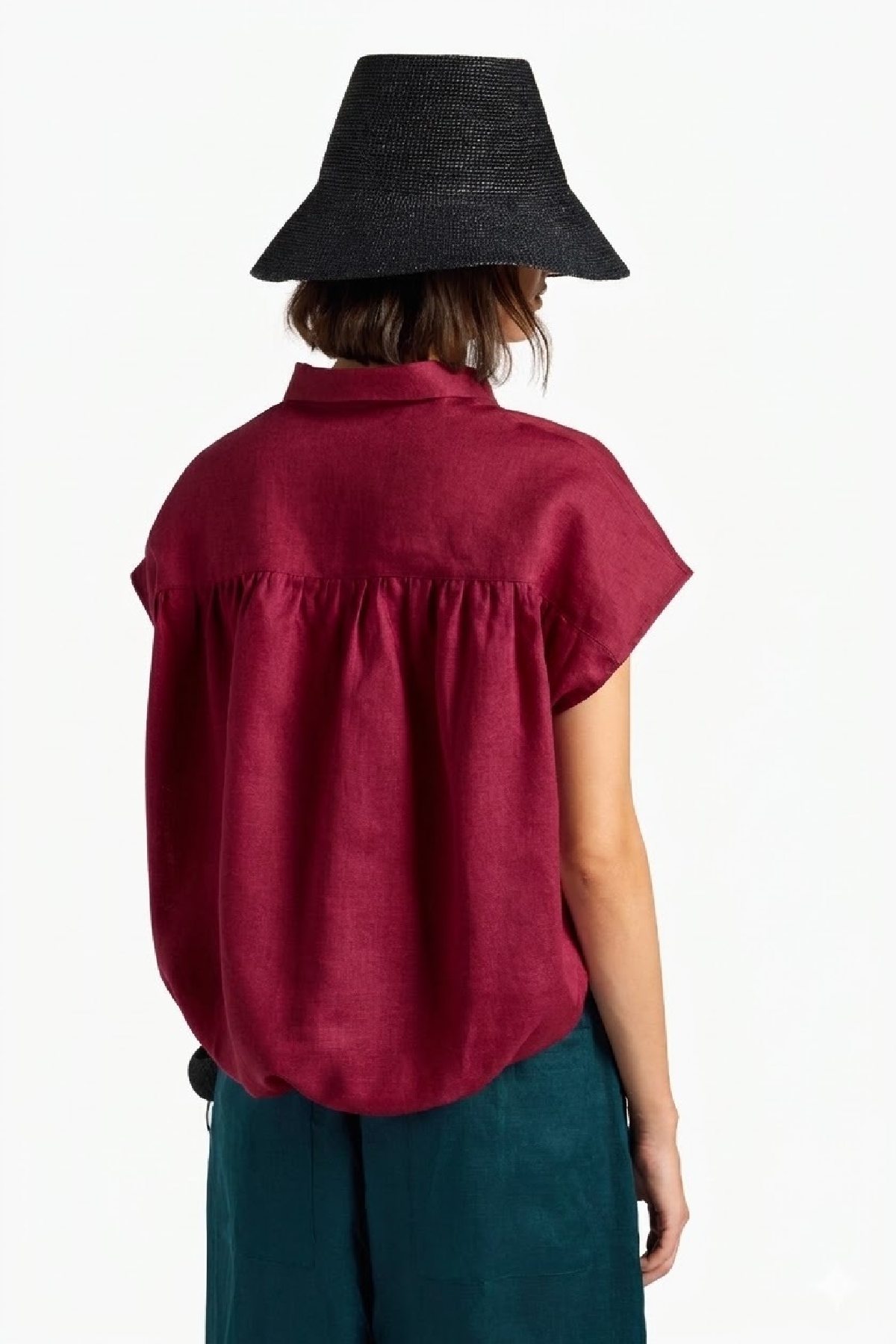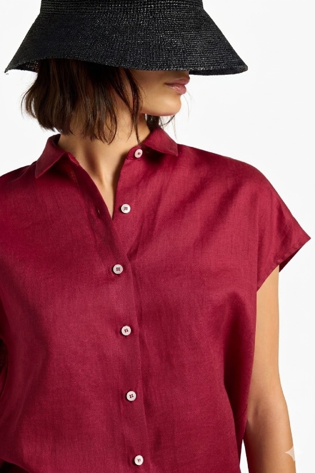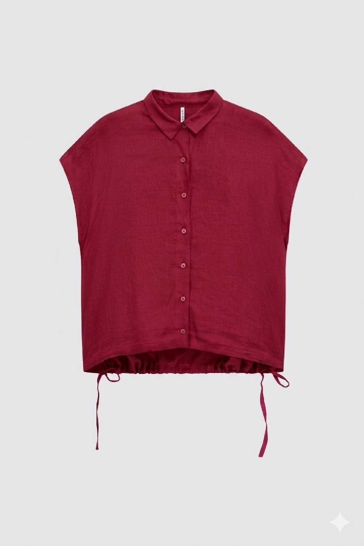 Camicia con maniche ad aletta. Chiusura centrale con bottoni a vista a contrasto. Coulisse laterali al fondo. lunghezza regolabile. Composizione: 100% lino