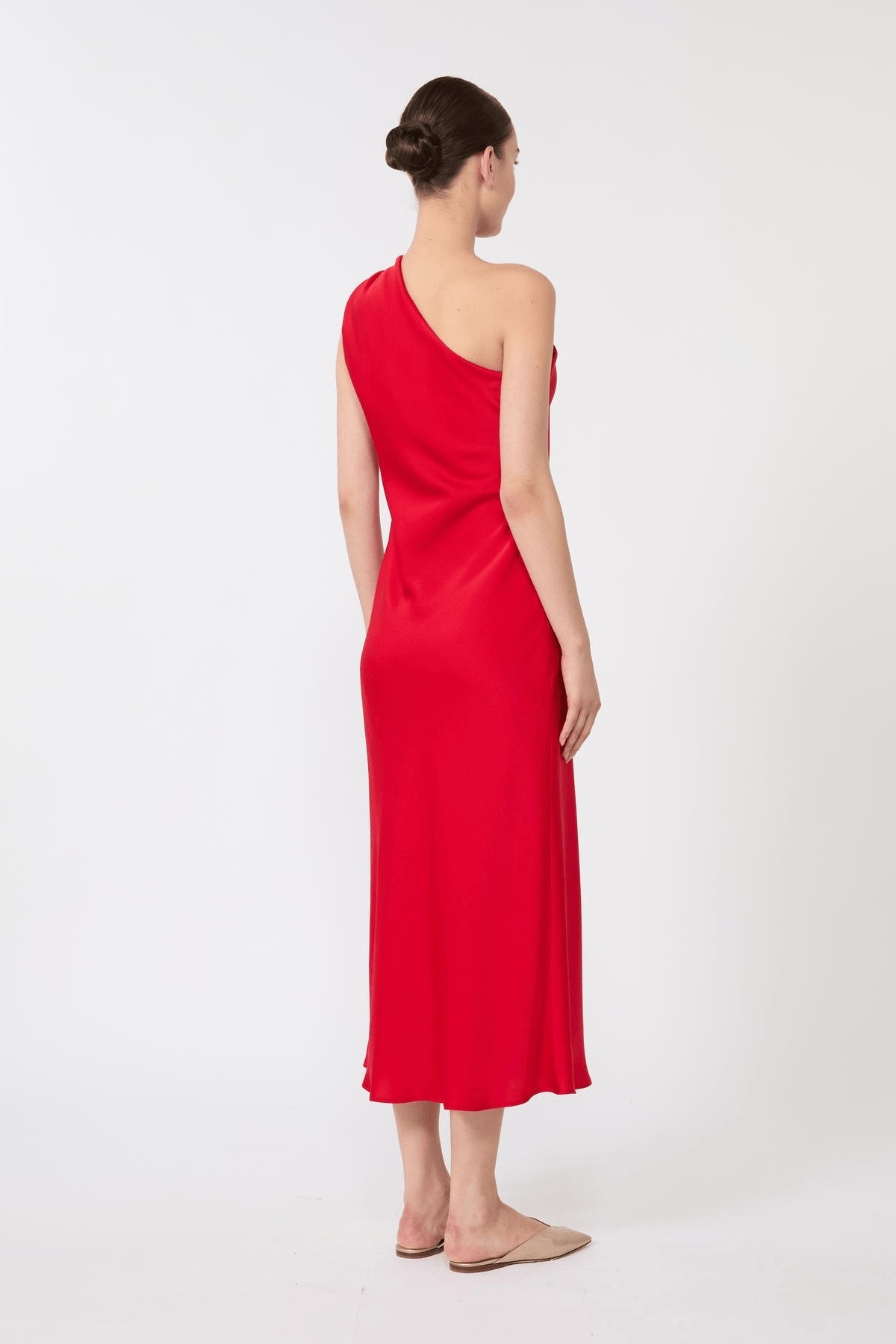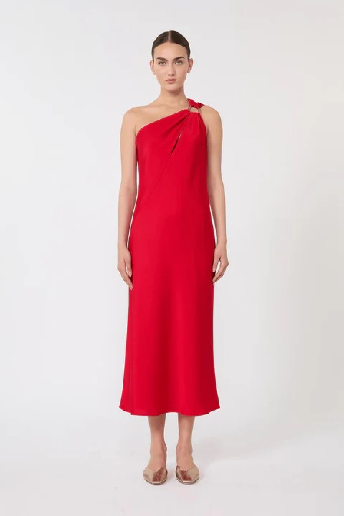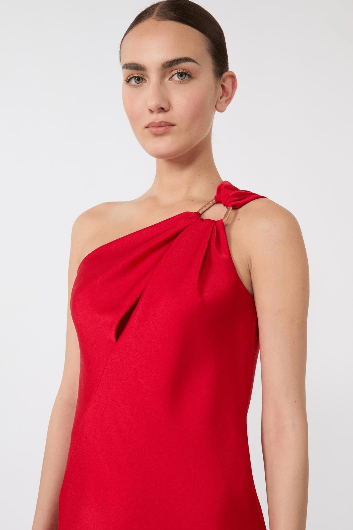 Abito lungo monospalla, caratterizzato da una costruzione in sbieco che evidenzia la silhouette. Linea fluida. Spallina sinistra decorata da anello in metallo galvanizzato. Chiusura con lampo invisibile sul fianco. Motivo di taglio obliquo cut-out sul davanti. Composizione: 77% triacetato, 23% poliestere