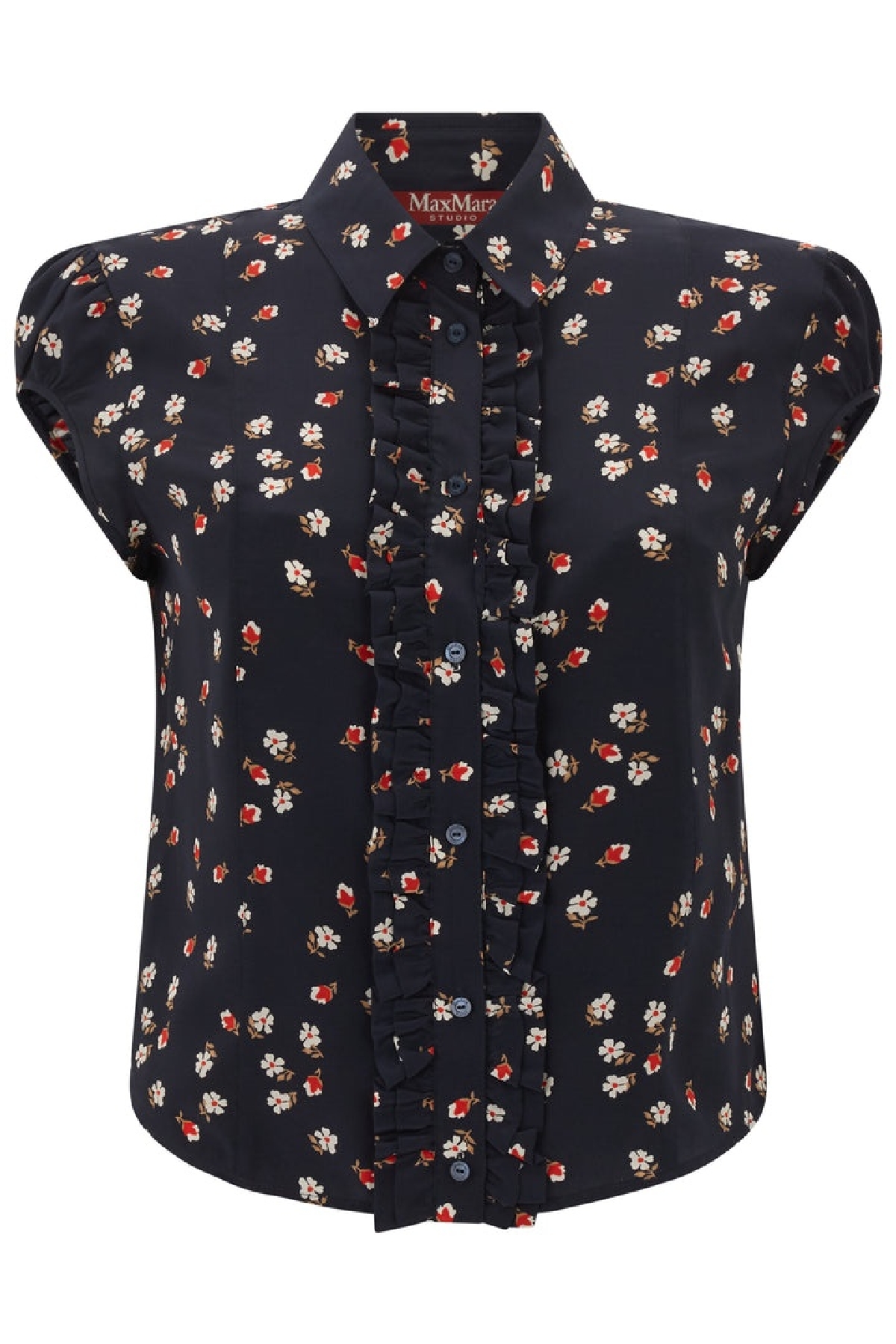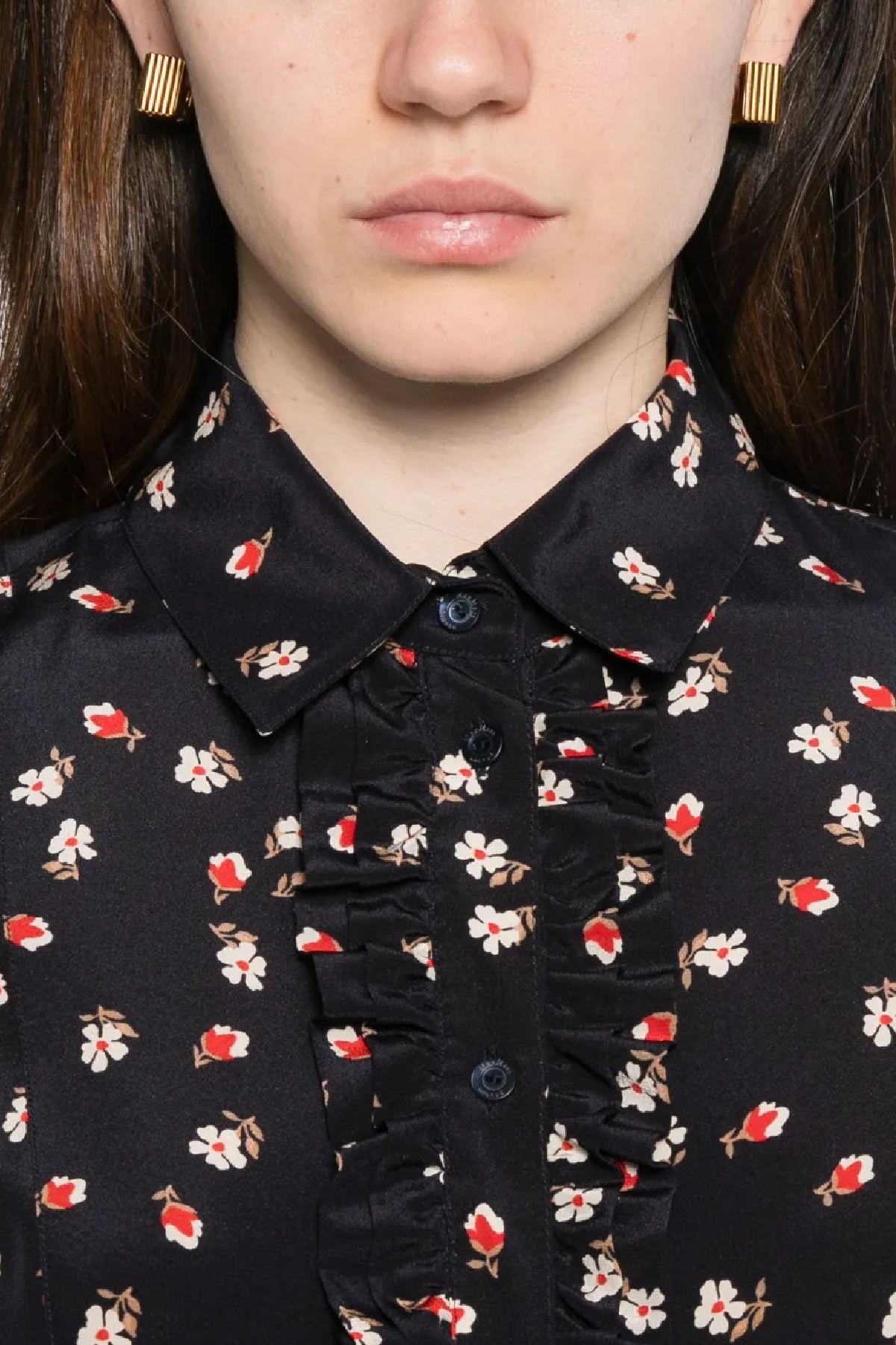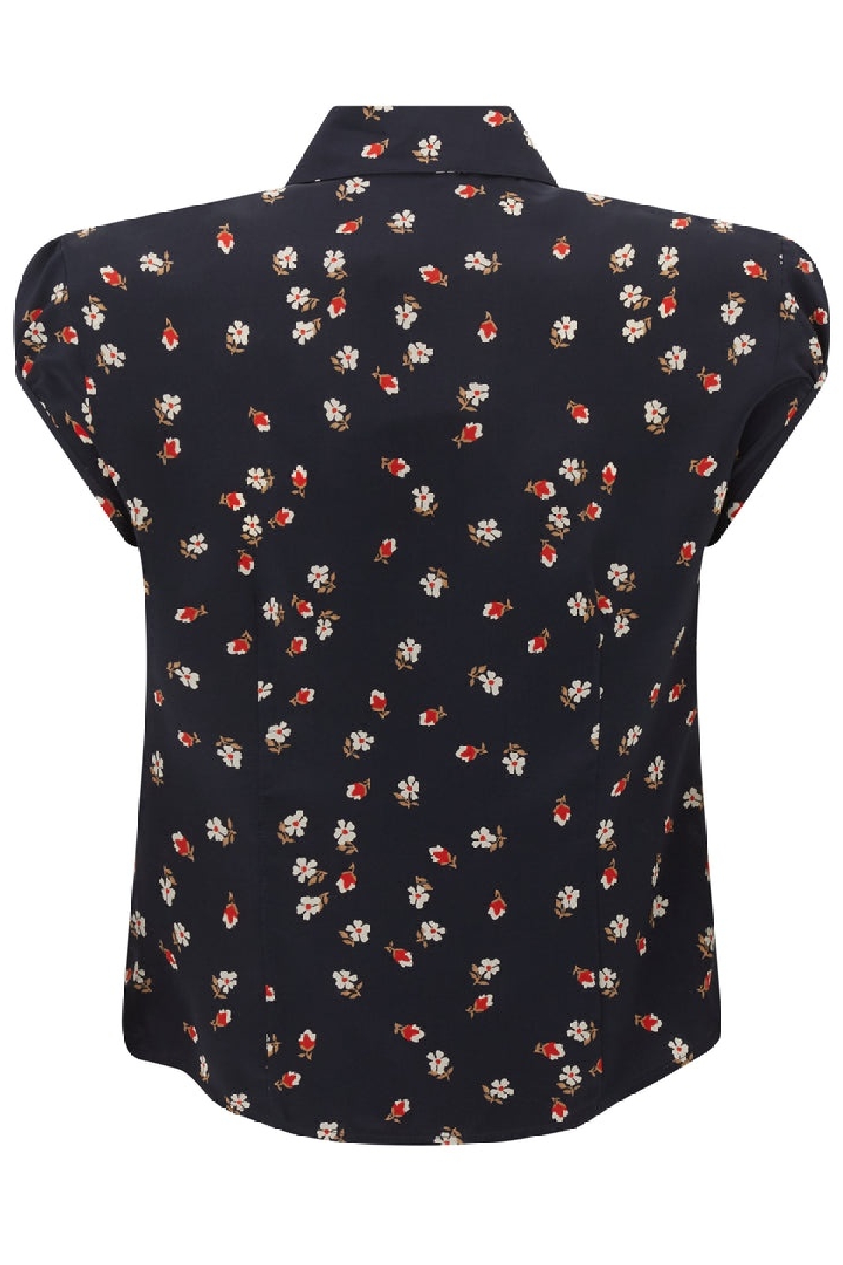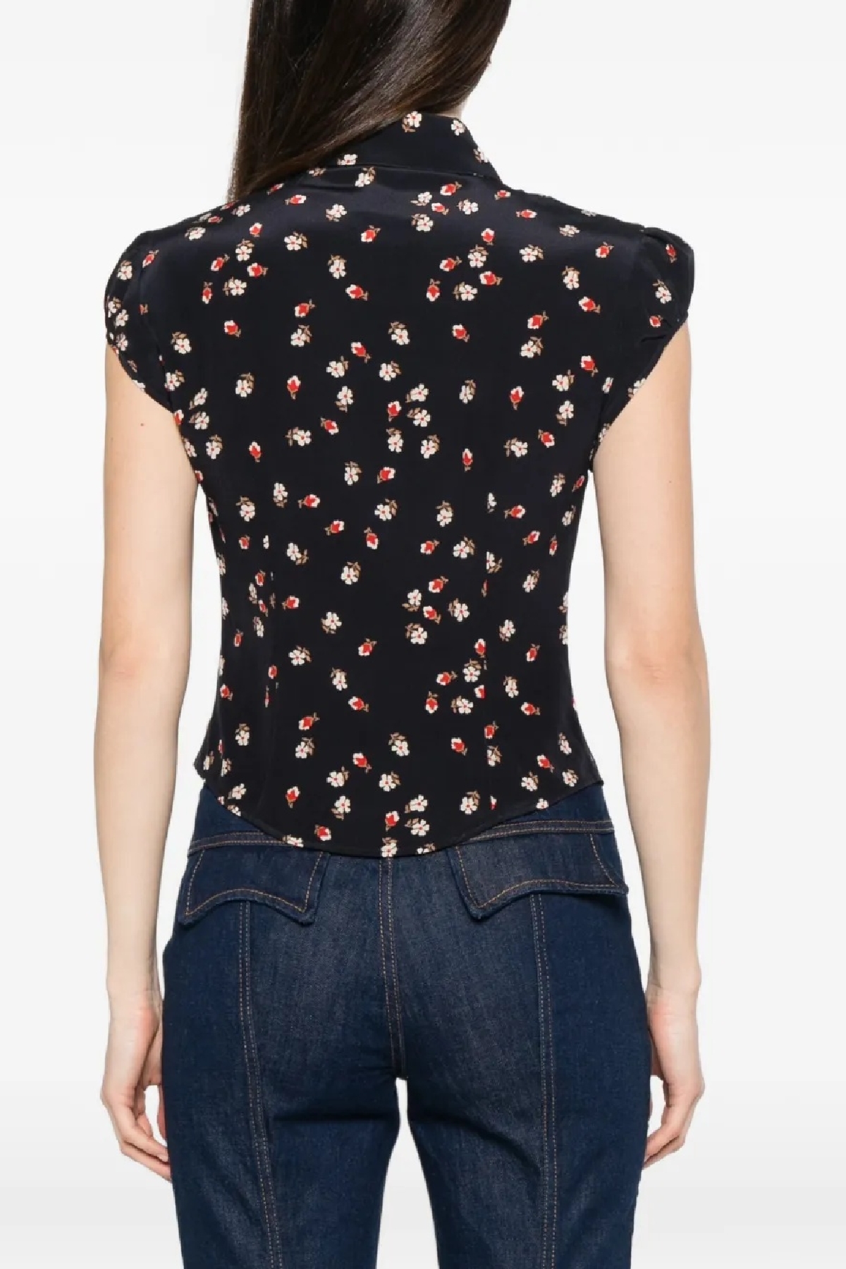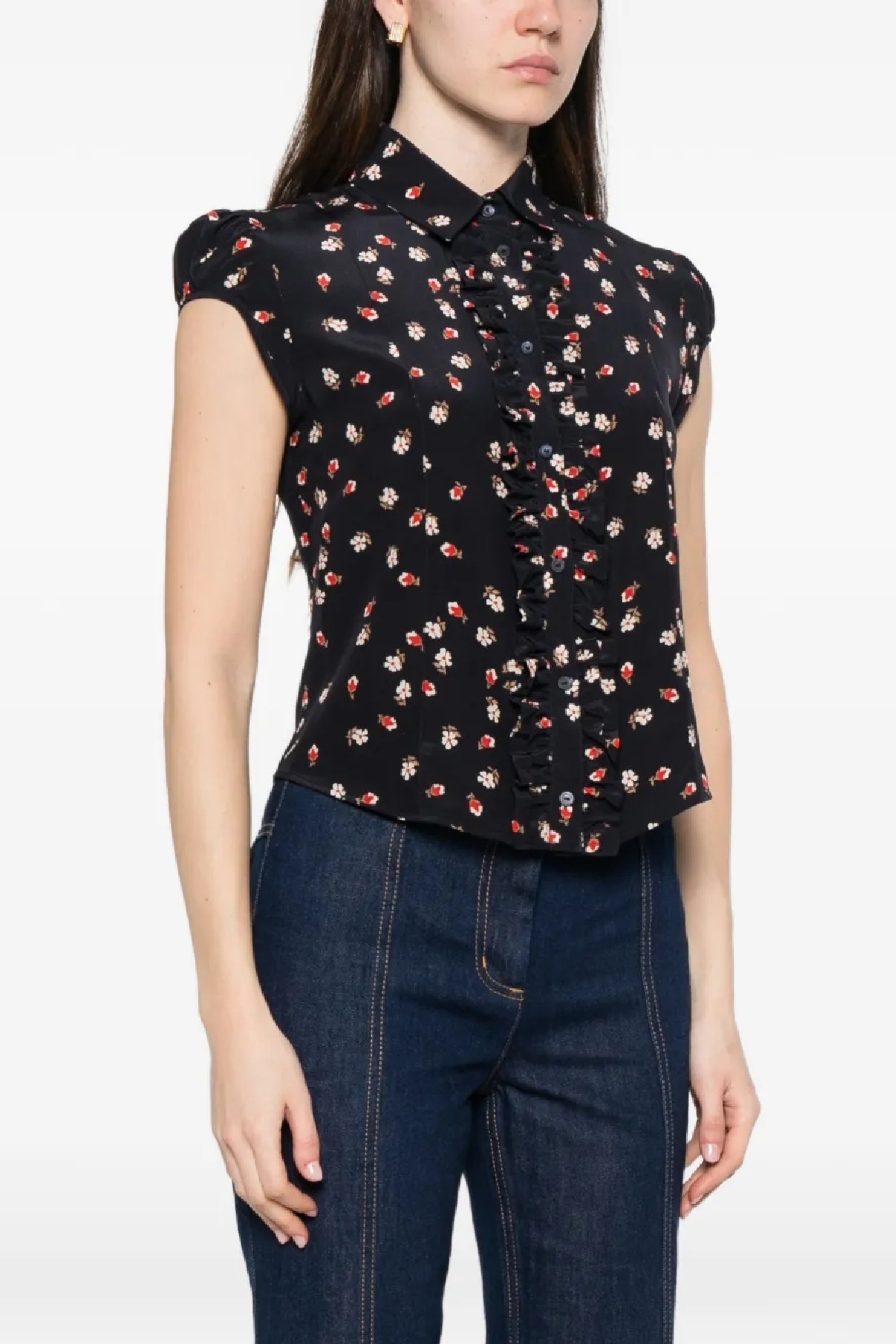 camicia senza maniche in seta stampata fantasia floreale . Collo camicia. Bottoni a vista. Ruches centrale . Stondata al fondo. Composizione: 100% seta