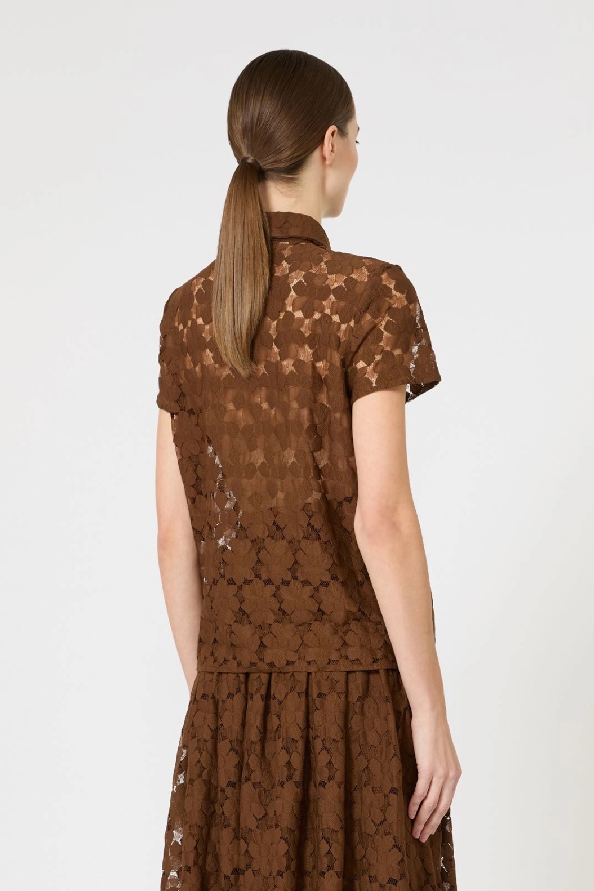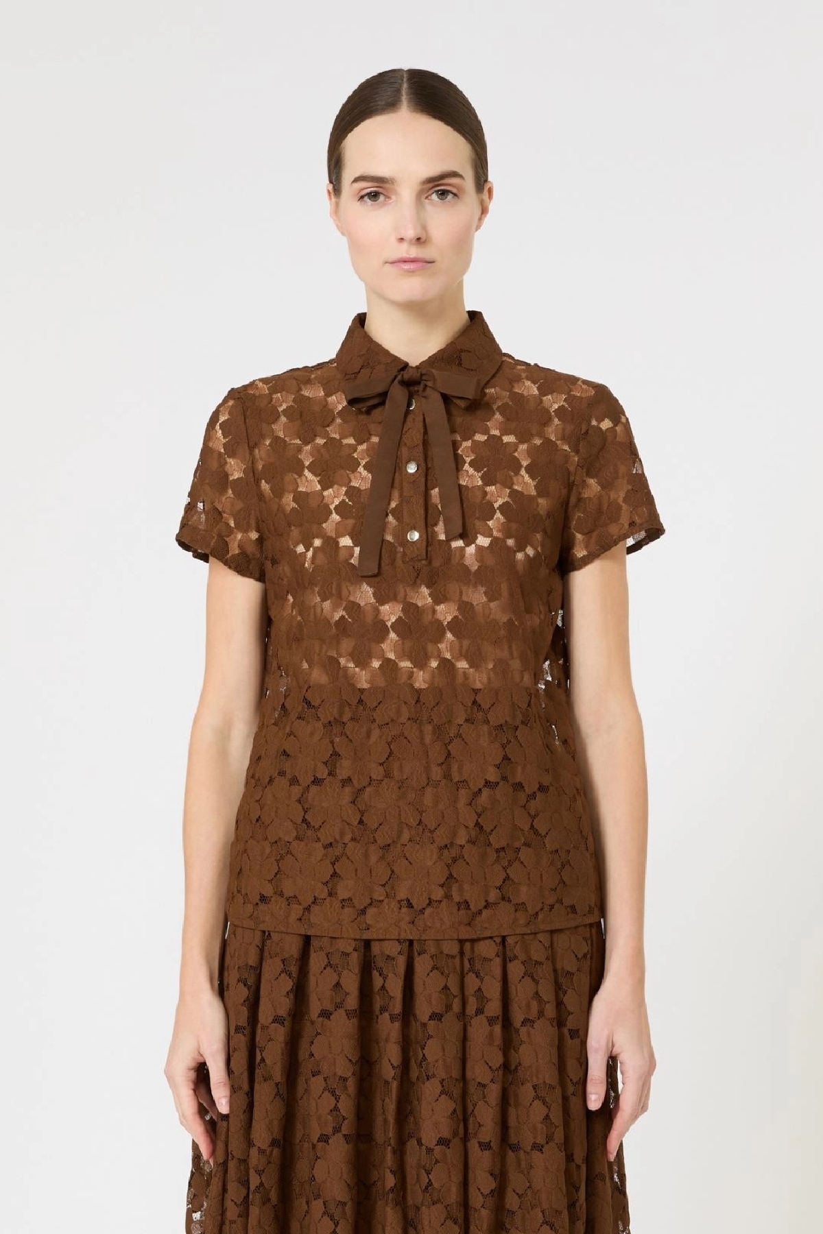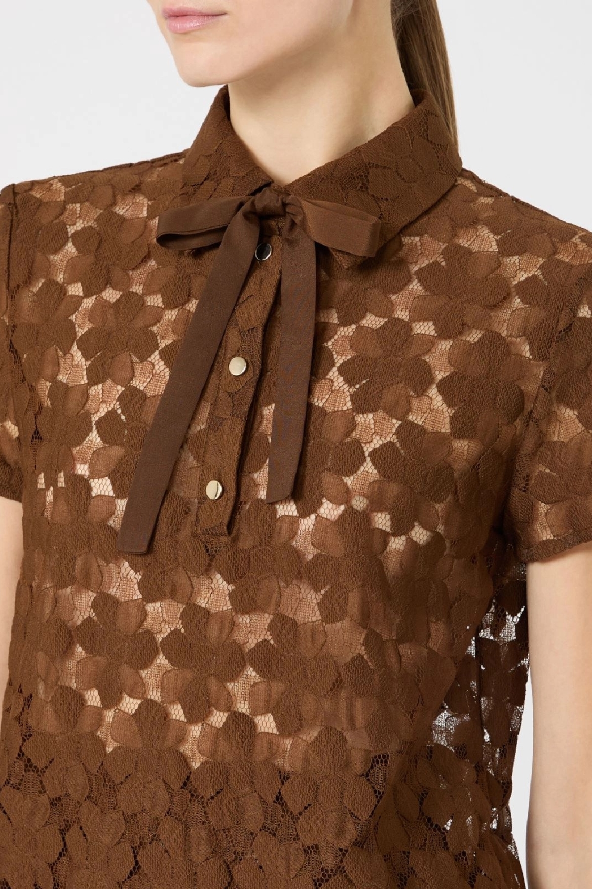 T-shirt modello polo con cravattino rimovibile in crêpe de Chine tinta unita. Pizzo a fiore geometrico. Linea morbida. Colletto chiuso a bottoni in metallo. Composizione: 86% poliammide, 14%cotone