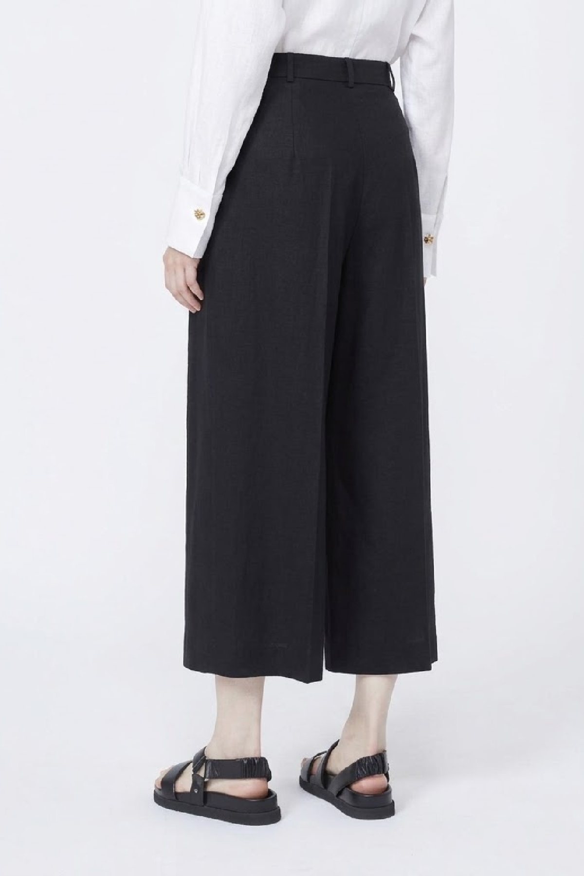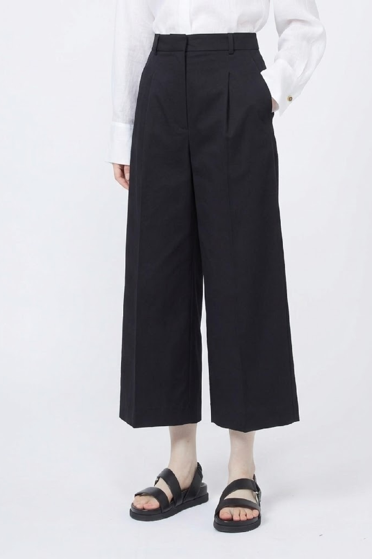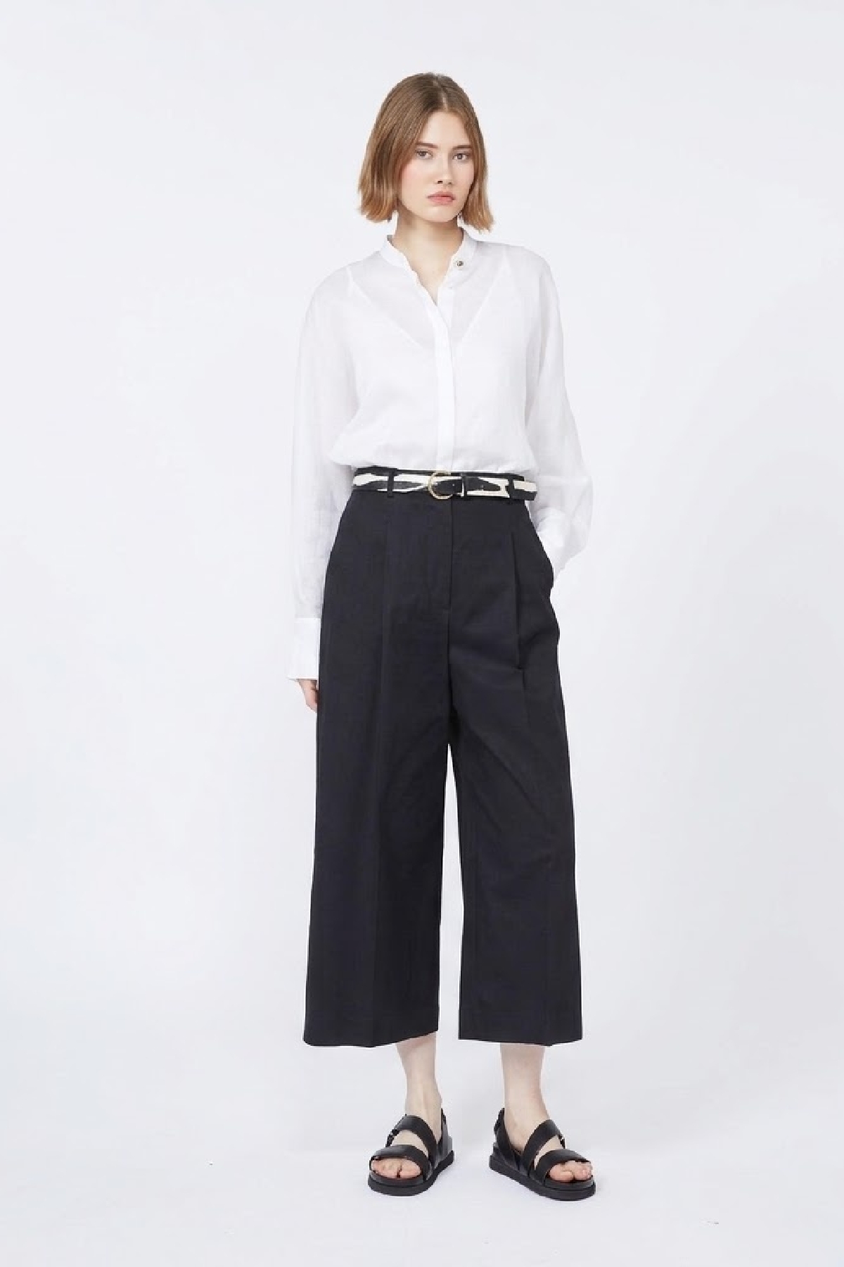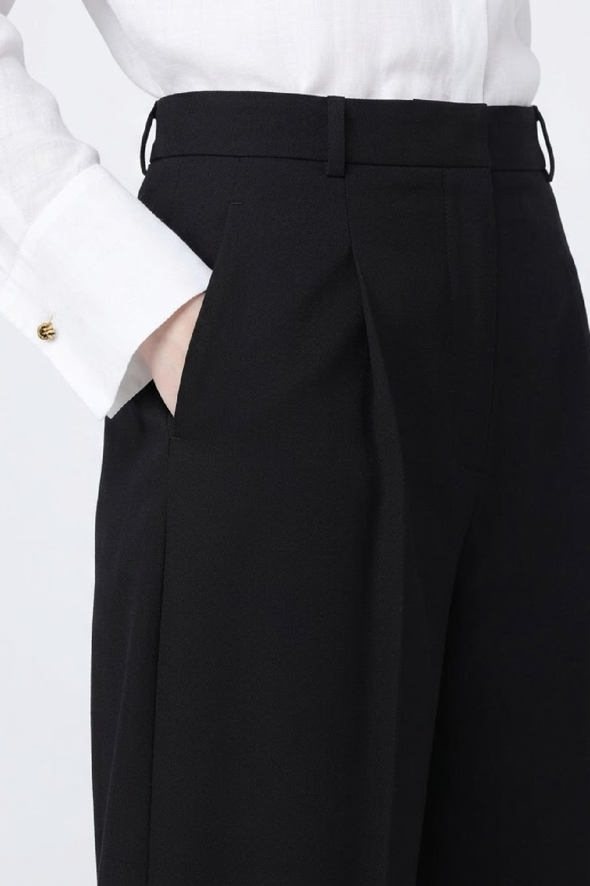 Piega stirata e passanti per cintura in vita. Pinces cucite in vita sul retro. Composizione:95% Cotone, 5% Elastan