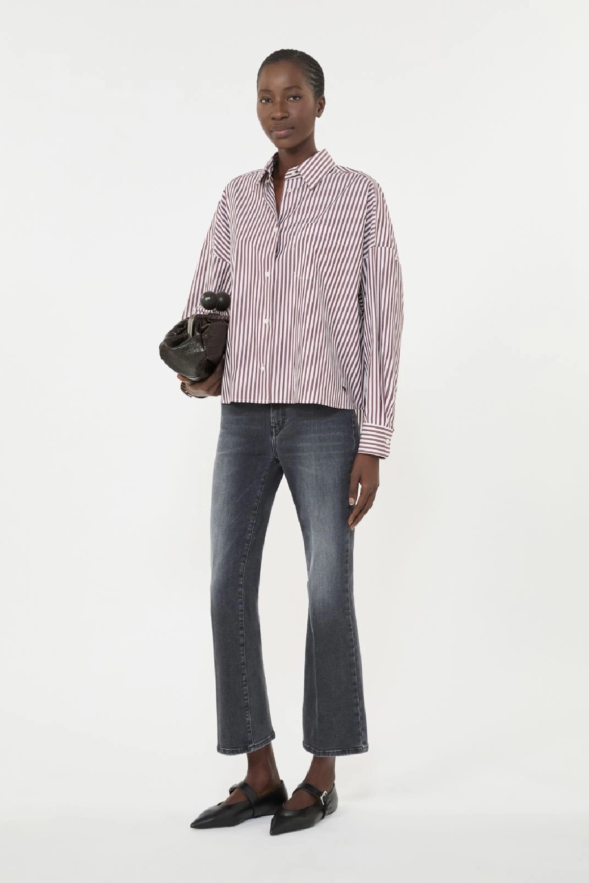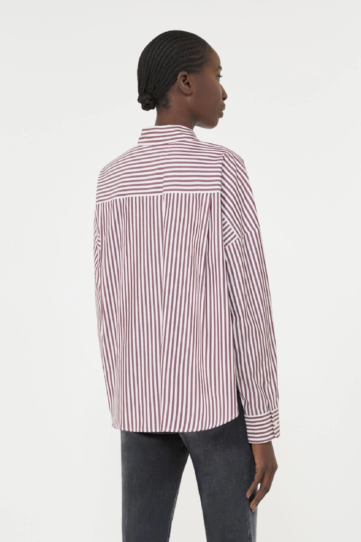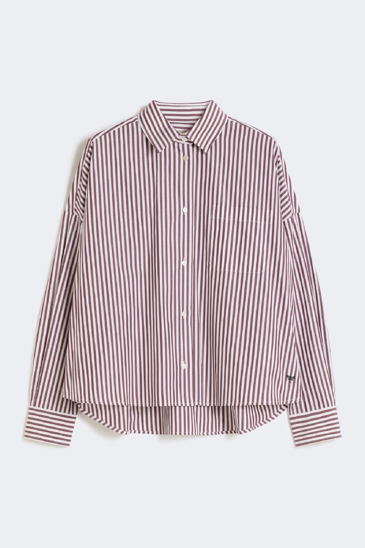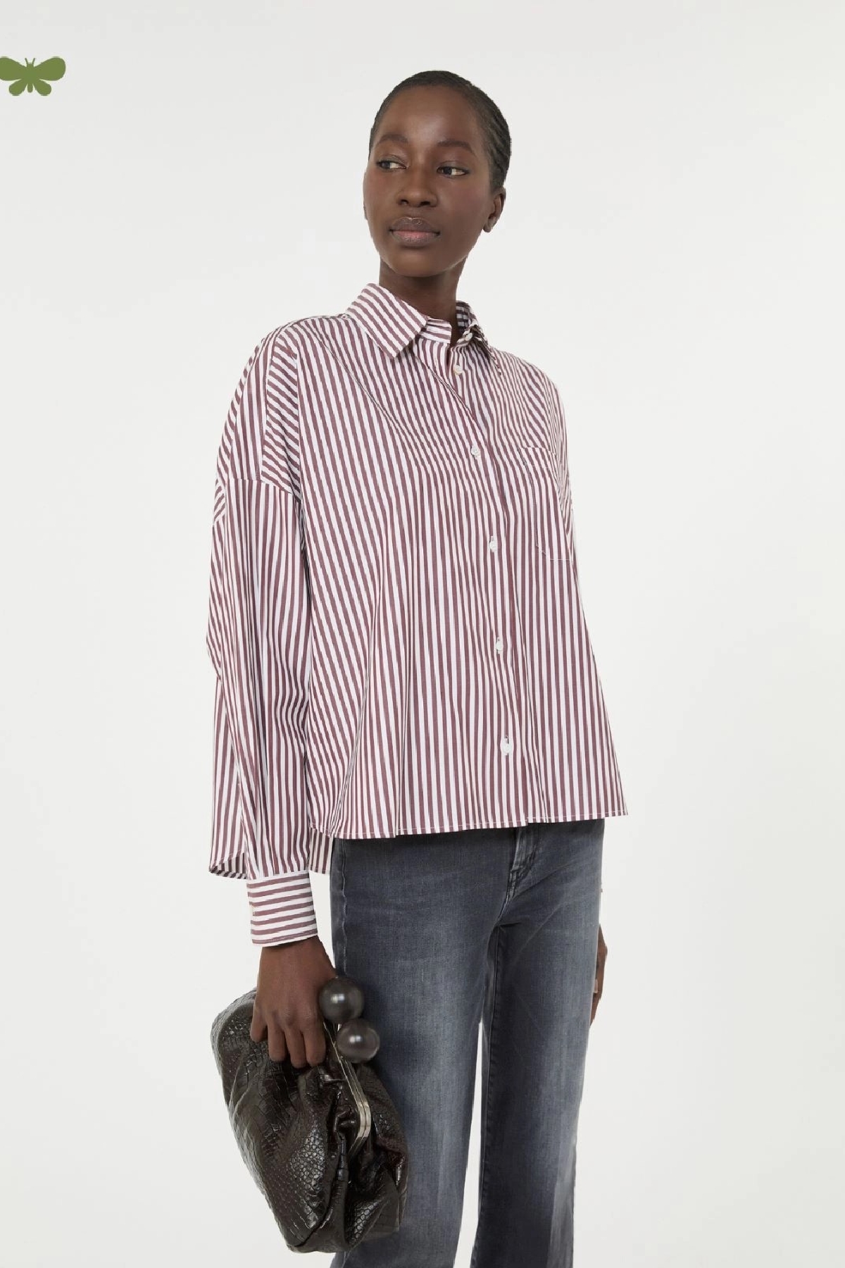 camicia oversize in cotone rigato. Logo a farfalla ricamato. Manich lunghe a giro basso. taschino applicato sul petto. Fondo stondato piu' lungo sul retro. Composizione: 100% cotone
