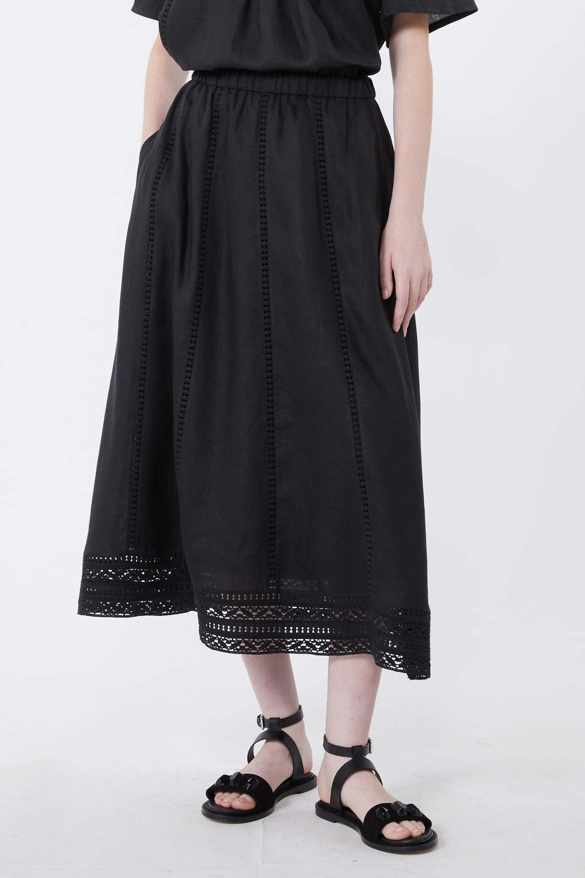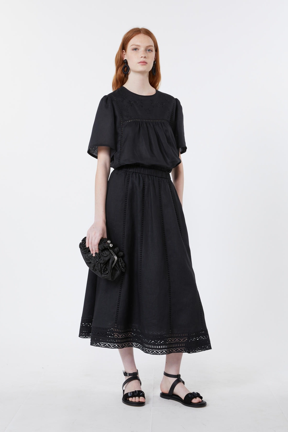 Gonna midi dalla linea ampia e leggermente svasata, rifinita da ricami in passamaneria à jour. Gonna in tela di puro lino. Vita elasticizzata. Tasche inserite nei fianchi. Foderata. Composizione: 100% Lino