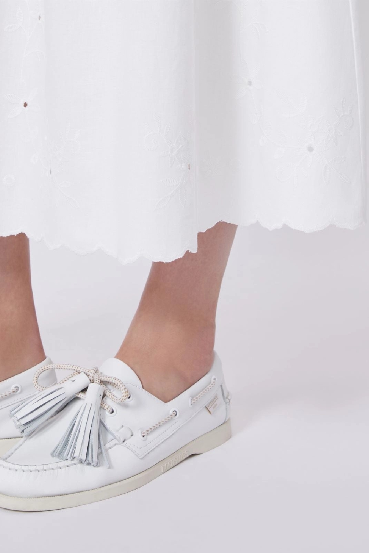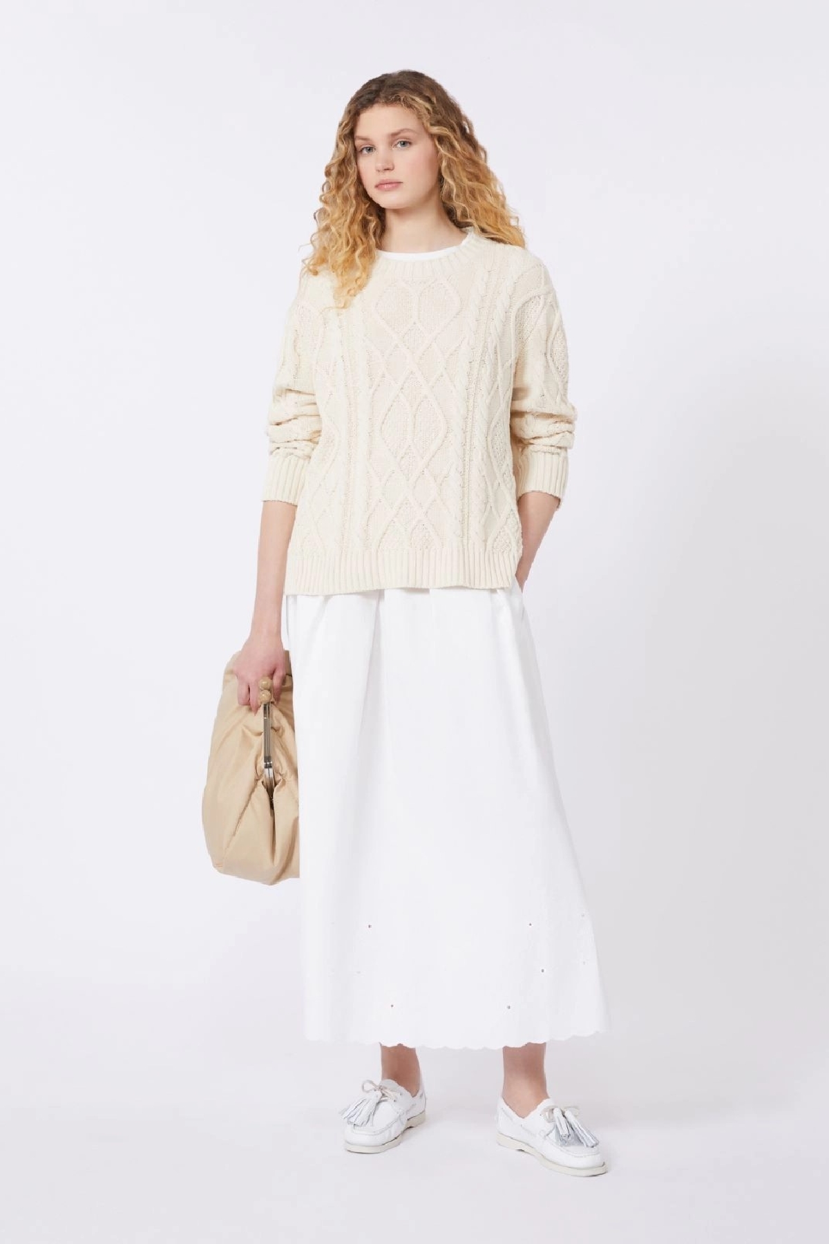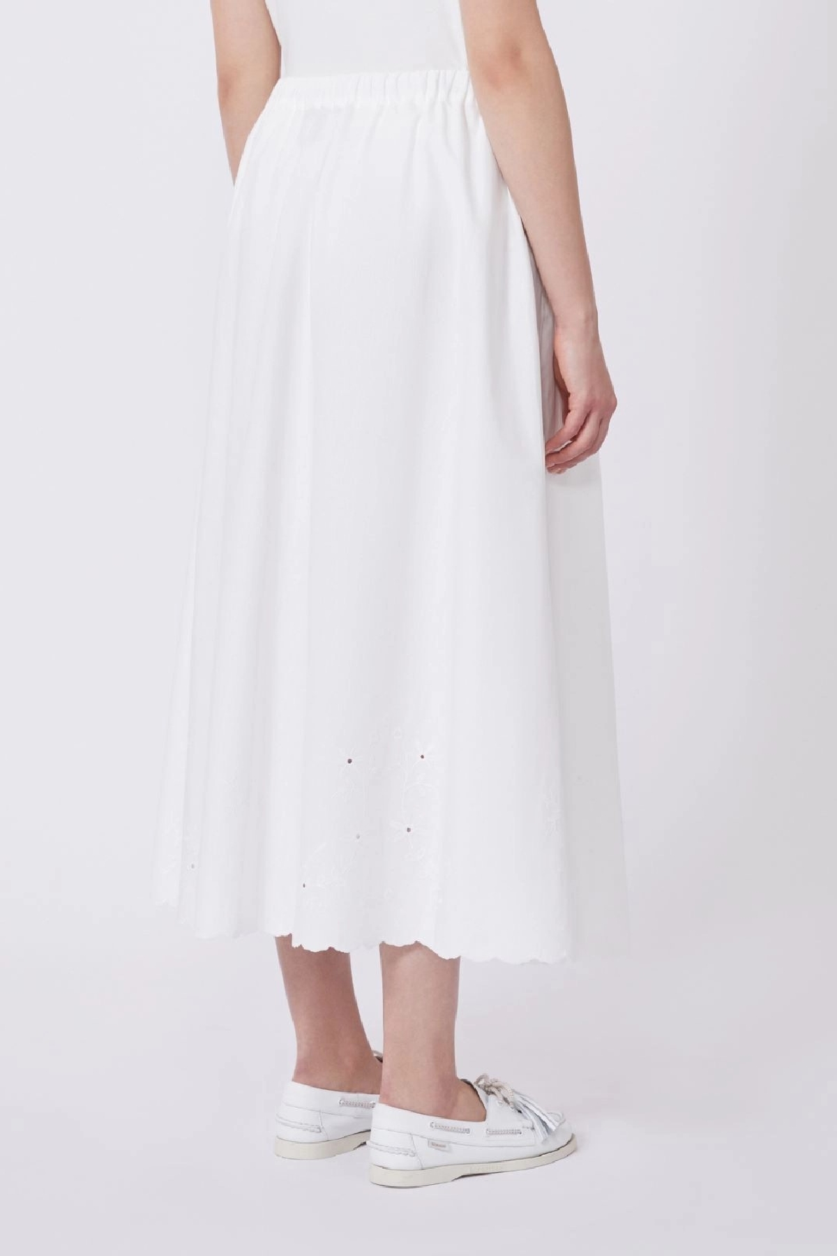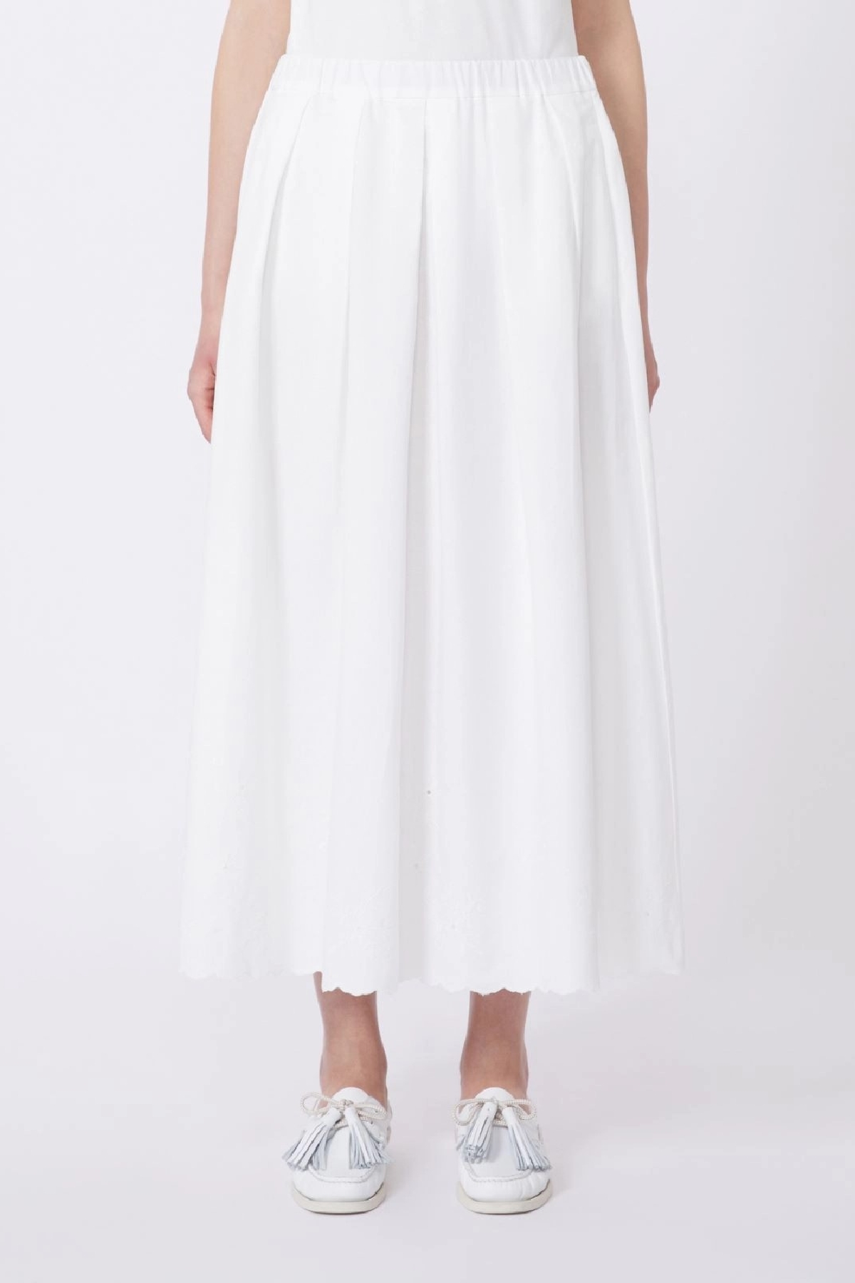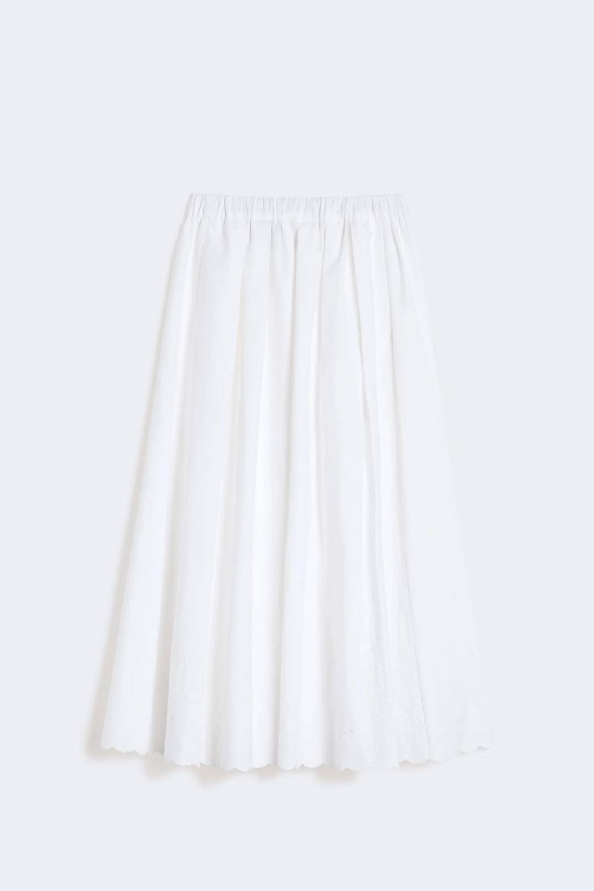 Gonna lunga A-line, impreziosita da ricamo Sangallo sul fondo e bordo smerlato. Linea ampia e svasata. Vita elasticizzata arricciata. tasche nei fianchi. Motivo a pieghe . Foderata. Composizione:Tessuto 75% cotone, 25% lino