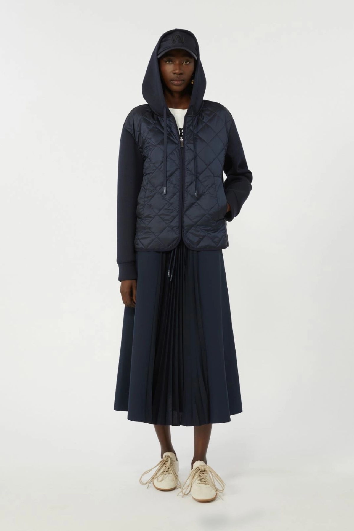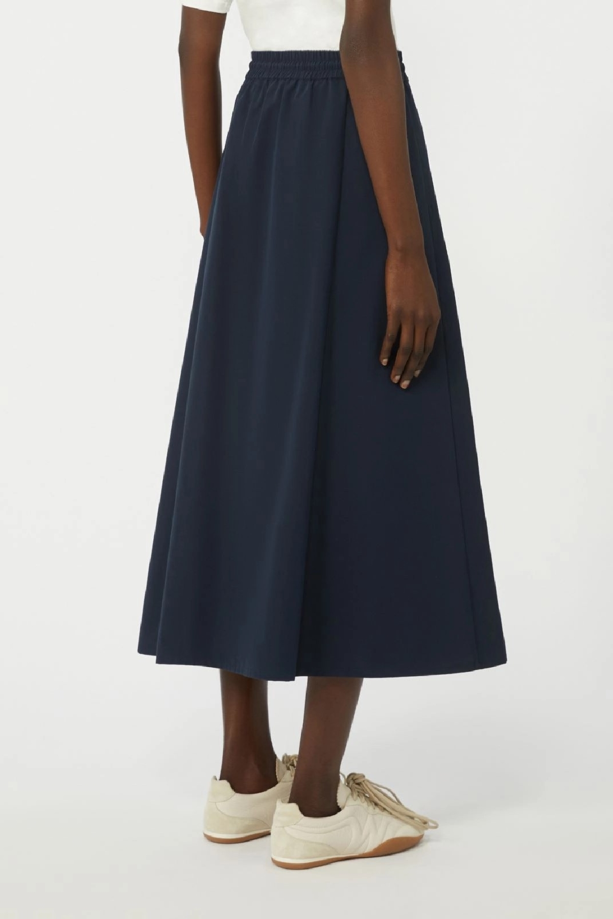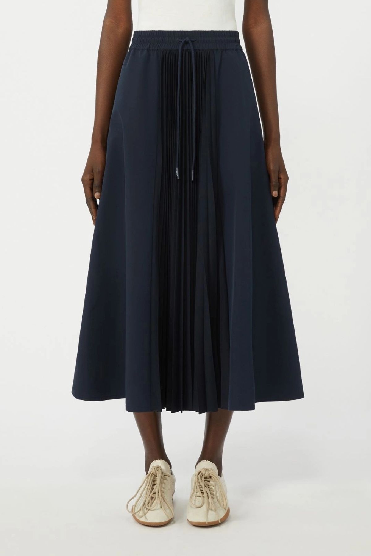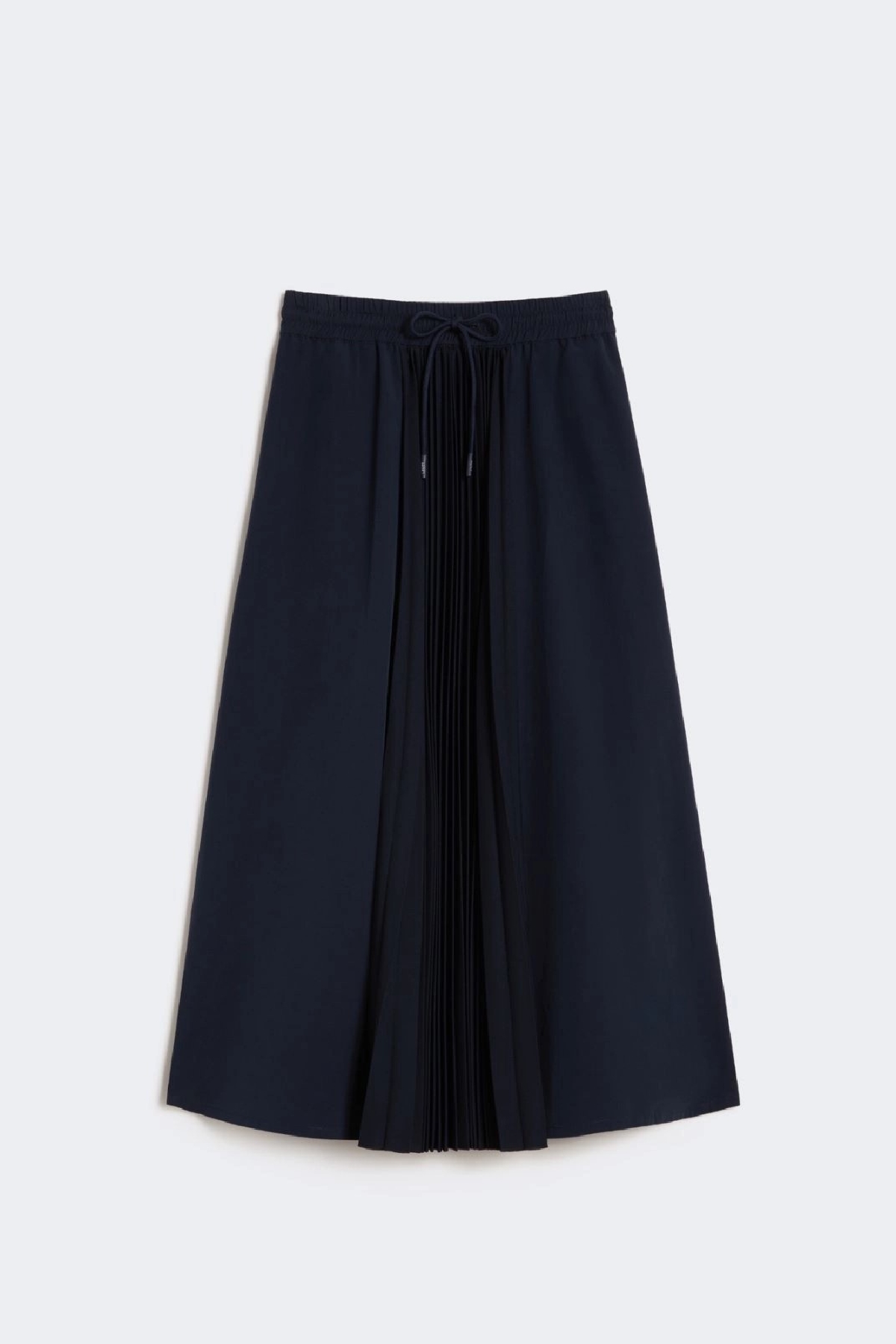 Gonna lunga con inserto frontale al centro in jersey crêpe a pieghe plissé. Linea svasata. Vita elasticizzata con coulisse. Tasche laterali. Composizione: 48% poliestere, 27% poliammide, 25% cotone
