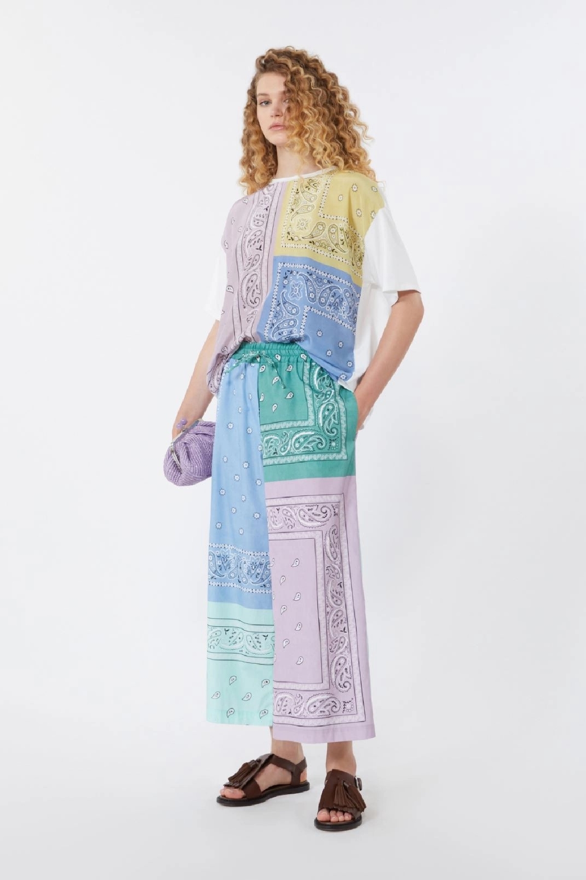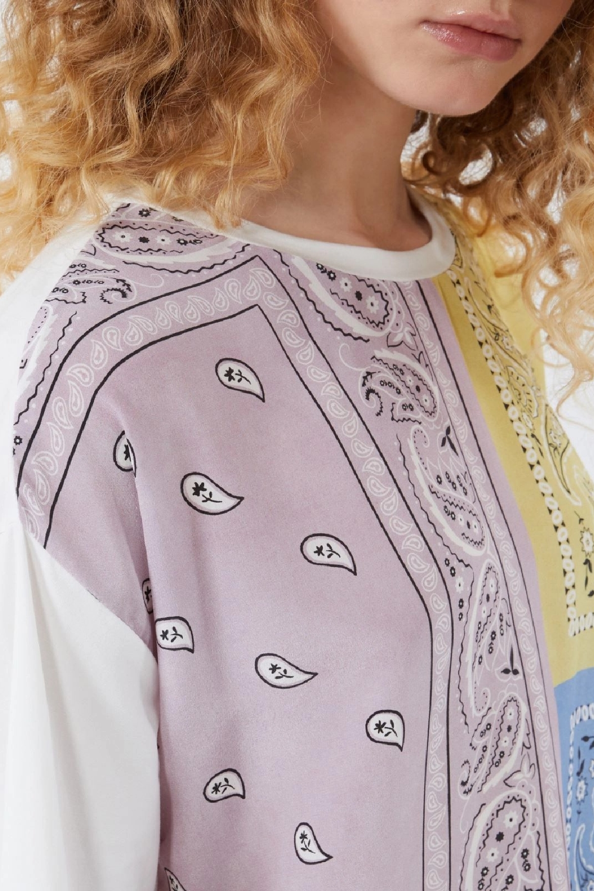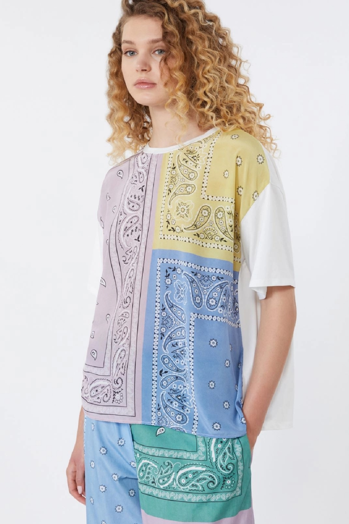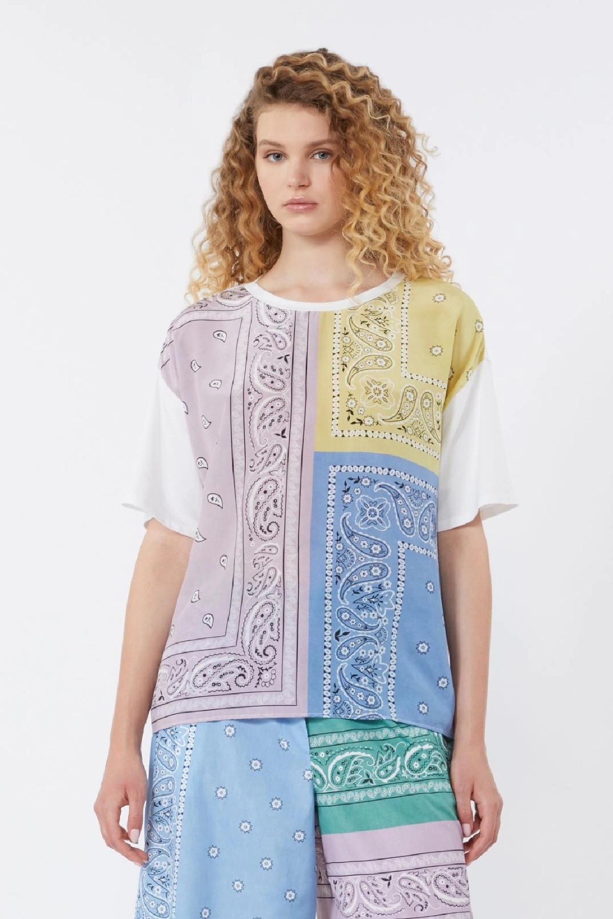 T-shirt girocollo, caratterizzata da inserto frontale in crêpe de Chine di pura seta stampata. Vestibilità over. Maniche corte a giro basso. Piccolo logo a farfalla sul retro del collo. Composizione: Tessuto a maglia 94% cotone, 6% elastan; davanti 100% seta.