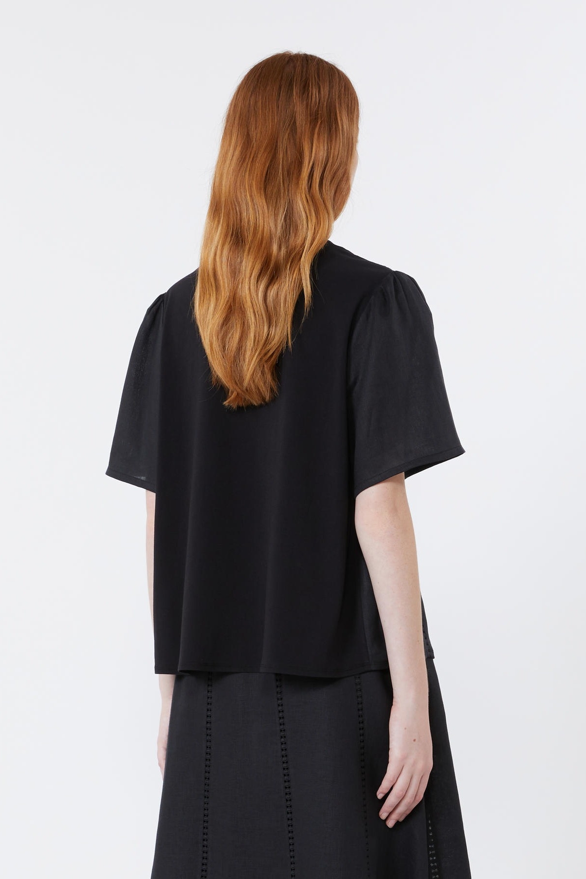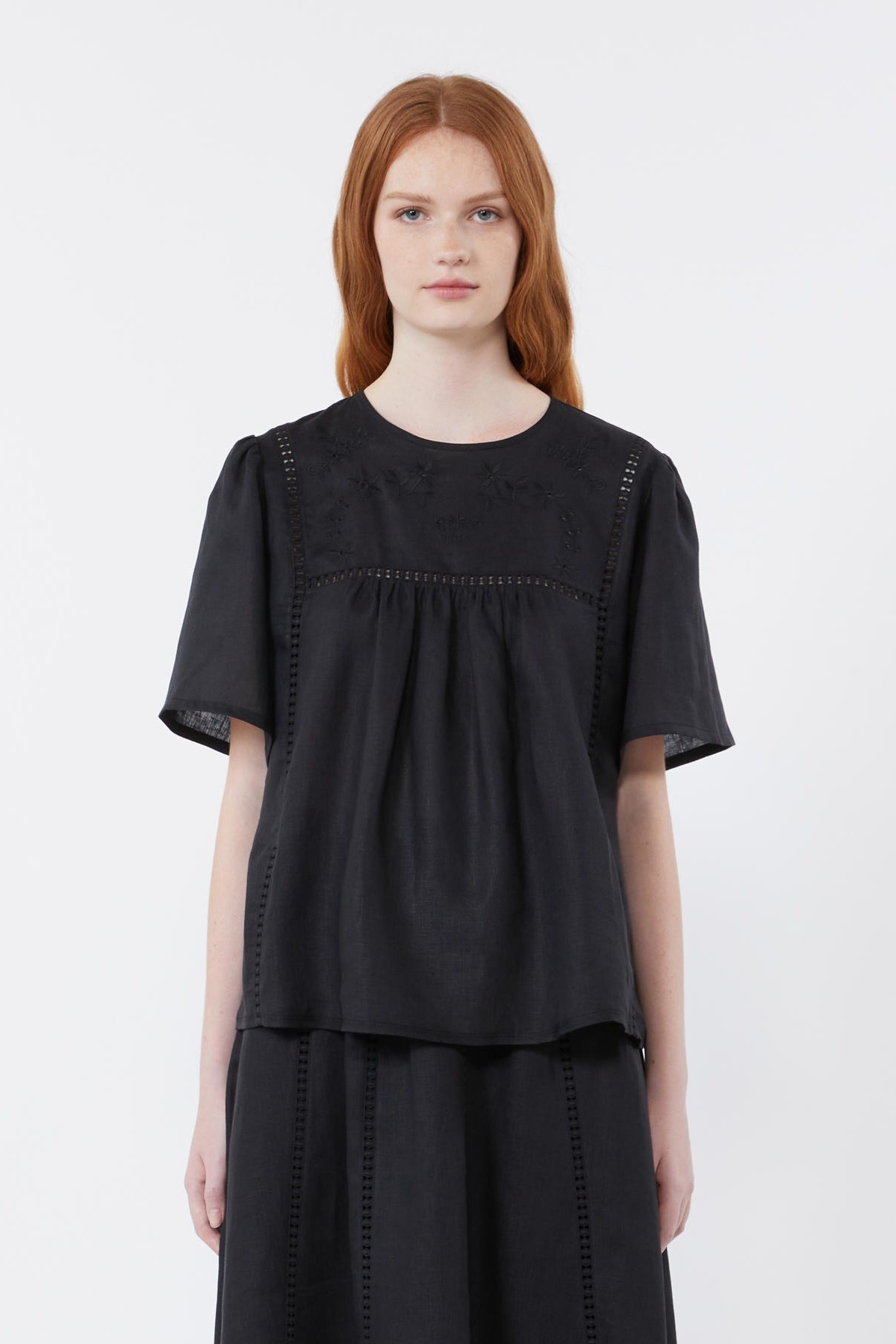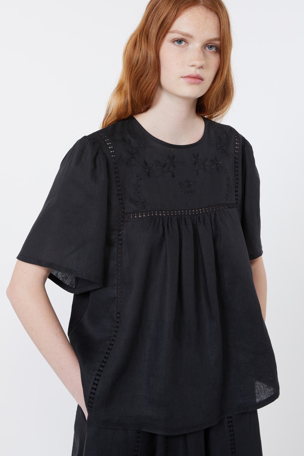 Top a maniche corte dalla linea leggermente svasata, rifinito da ricami e dettagli in passamaneria sul davanti. Vestibilità regular. Girocollo. Maniche ampie