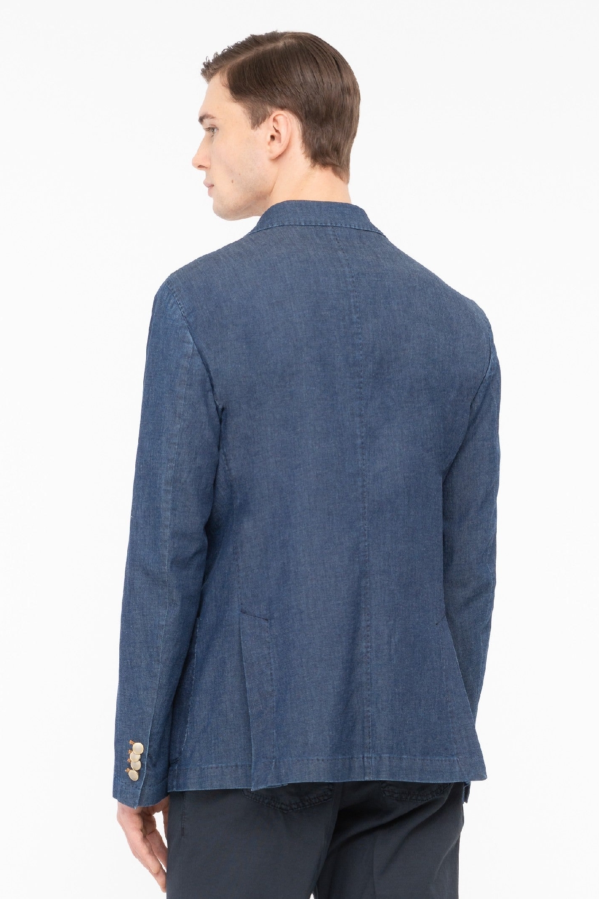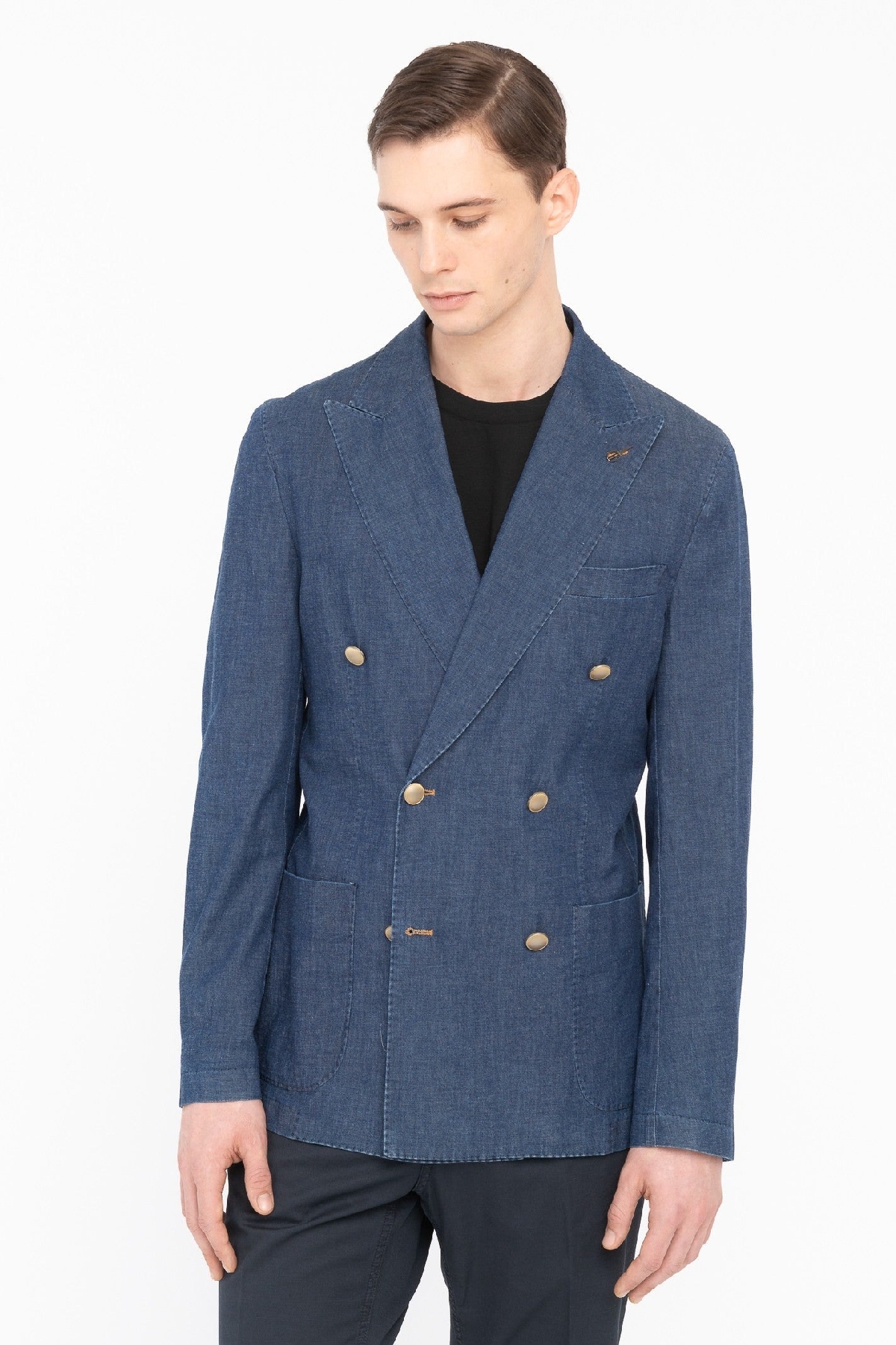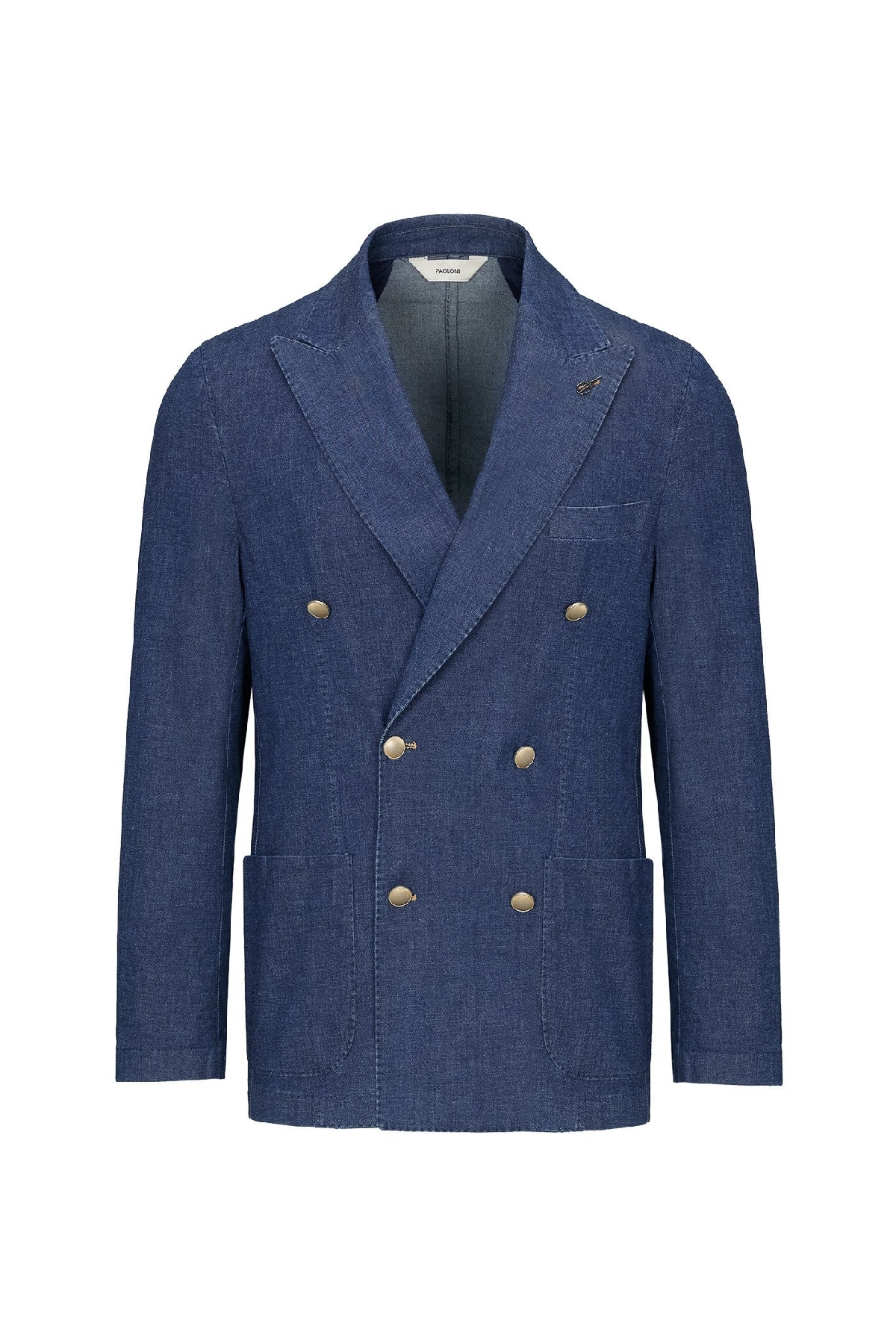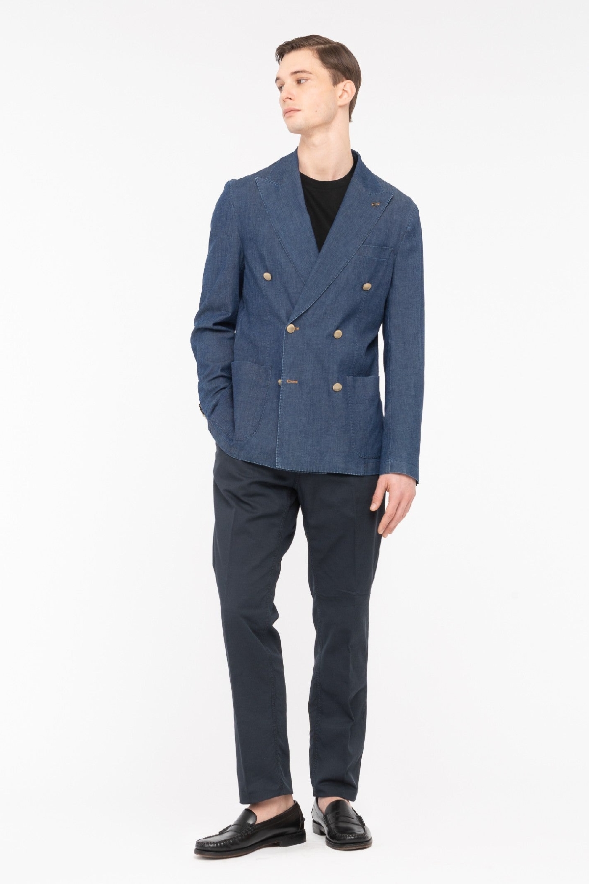 Giacca doppiopetto sfoderata lavata, chiusura con bottoni metallo, ampio rever a lancia, due tasche a toppa un taschino frontali, quattro bottoni ai polsi, spacchi laterali sul retro, finiture con impunture. Chambray di cotone stretch. Composizione:97% cotone 3% elastane