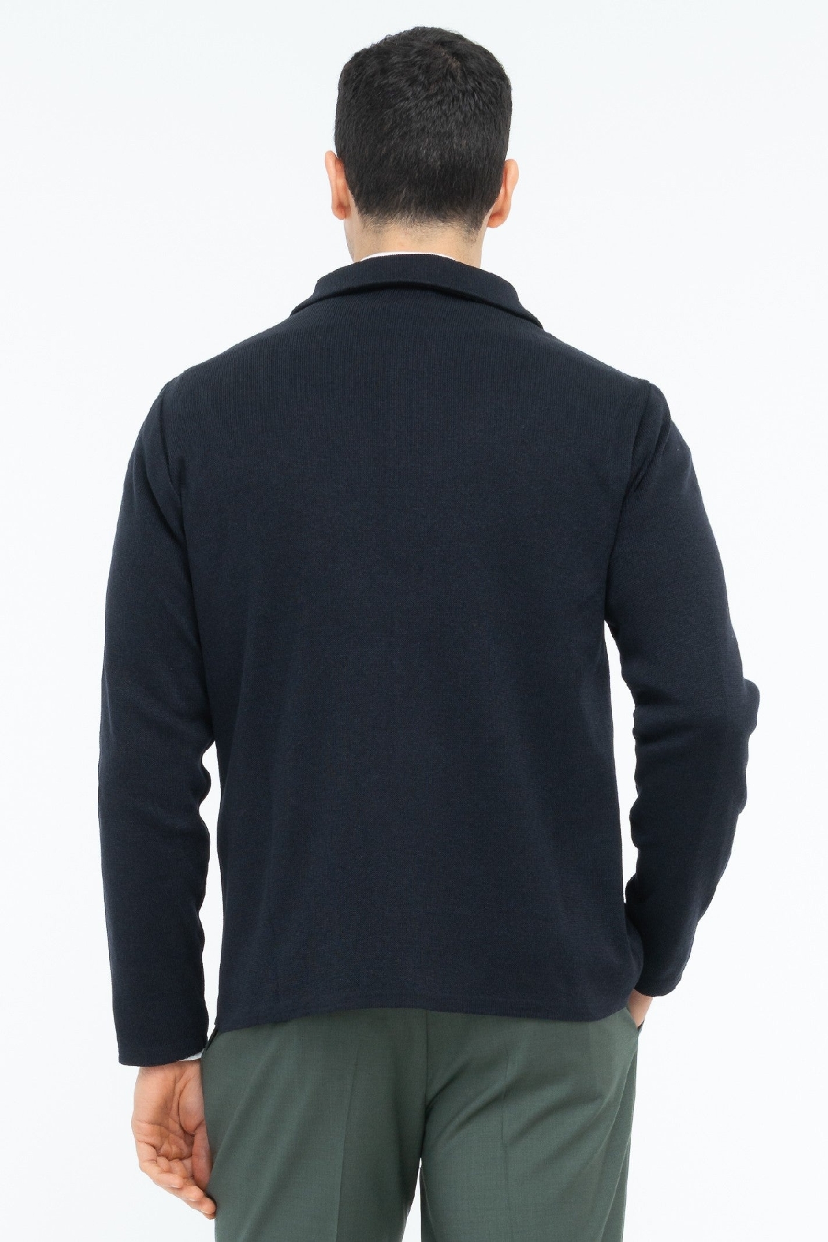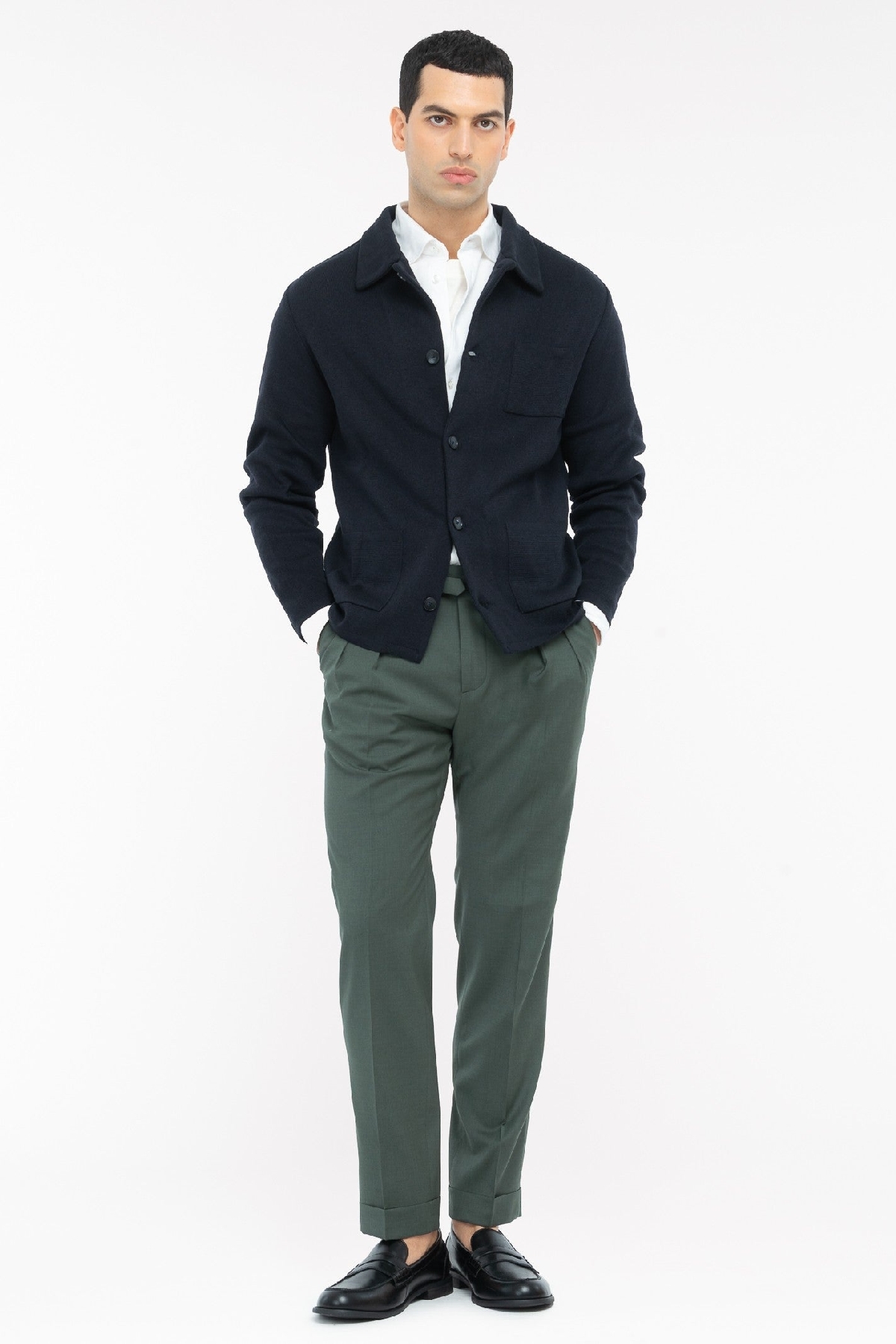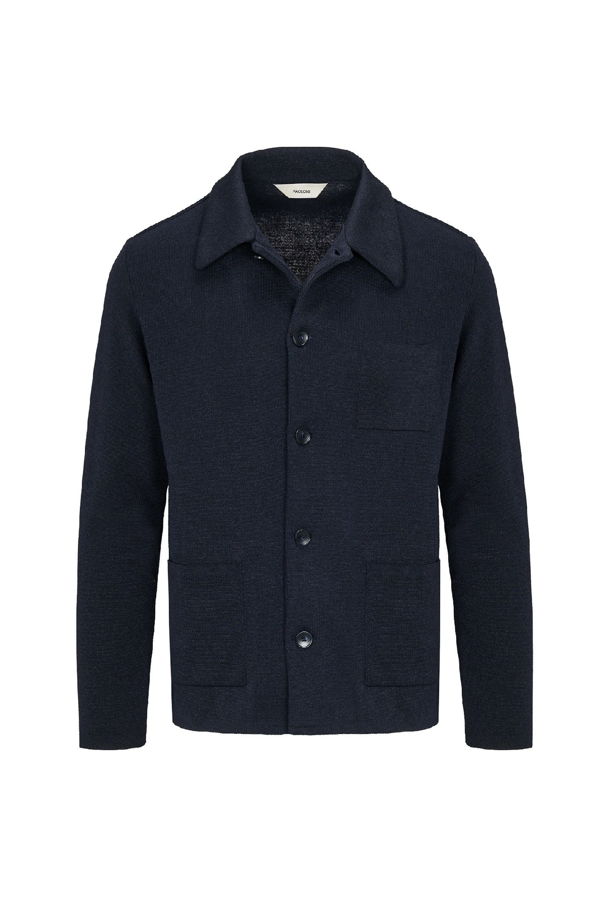 Giacca overshirt in maglia con chiusura a bottoni, colletto a camicia e tre tasche applicate sul davanti. Tessuto in jersey piqué misto lana. Composizione: 50% cotone 50% acrilico FRB.