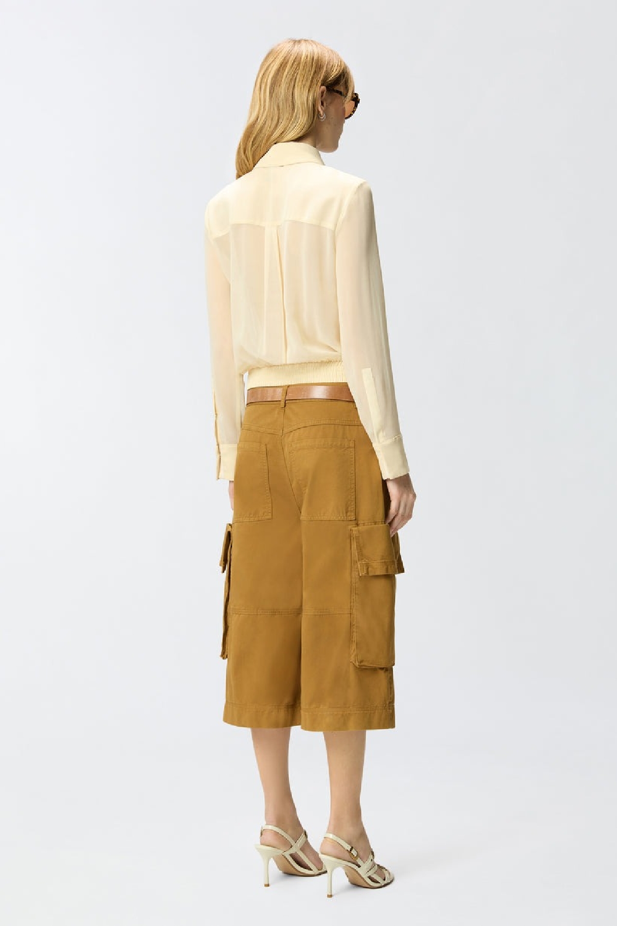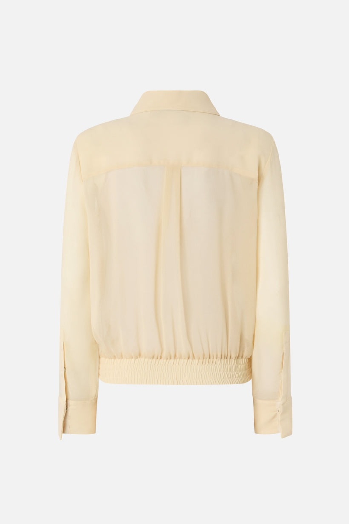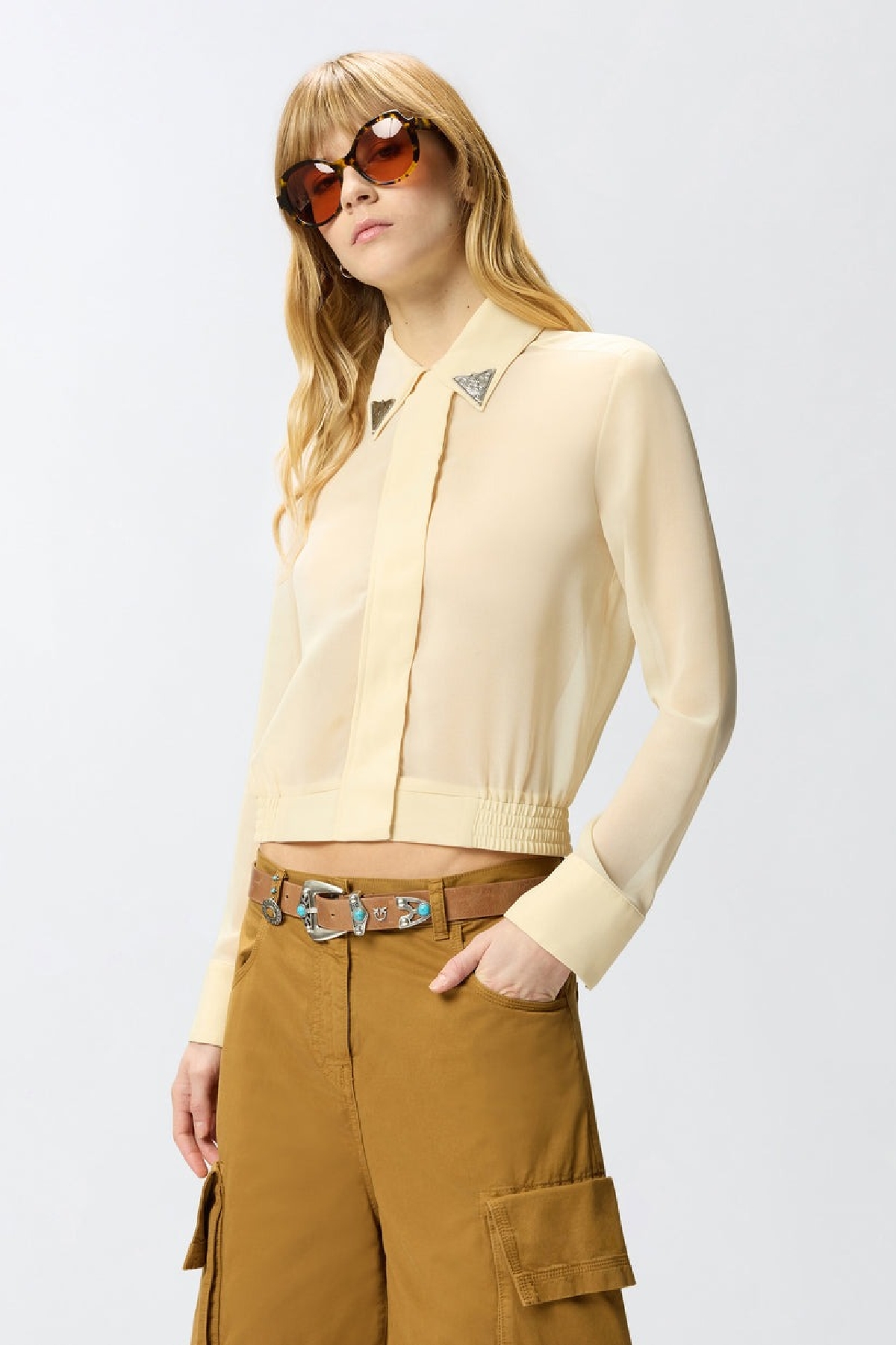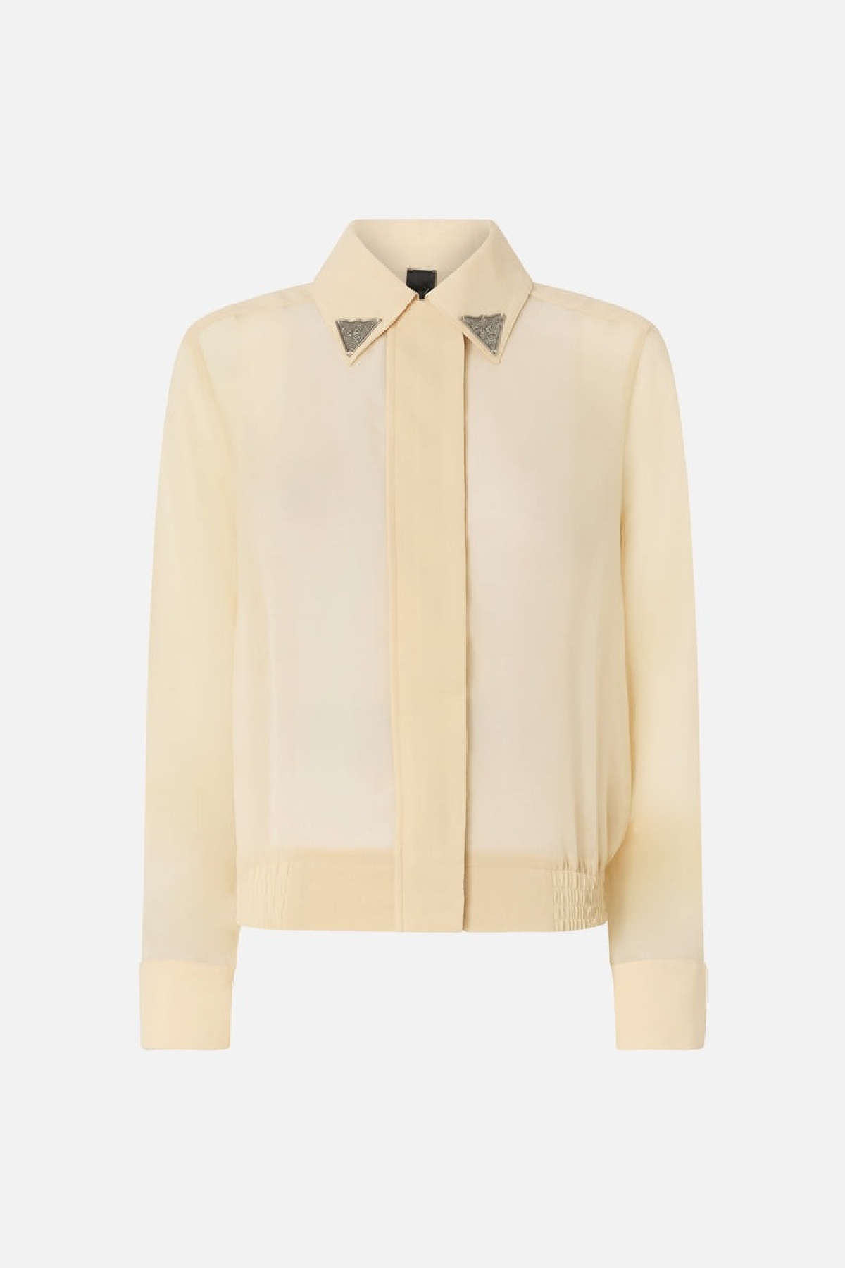 Camicia semitrasparente in morbido tessuto georgette, maniche con polsini, colletto classico con due applicazioni metalliche stile texano. Carre' posteriore a doppia piega e fascia arricciata sul fondo.Chiusura frontale nascosta . Composizione: 100% poliestere