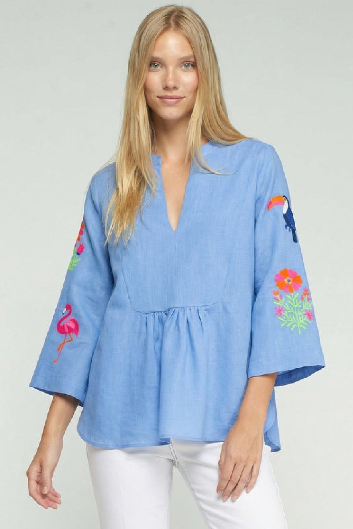 Camicia blu con scollo a V e spacco frontale. Presenta ricami di ispirazione tropicale sulle maniche, tra cui un fenicottero, un tucano e motivi floreali in colori vivaci. Presenta una morbida arricciatura sotto il seno, maniche lunghe e orlo arrotondato. Composizione: 100% lino